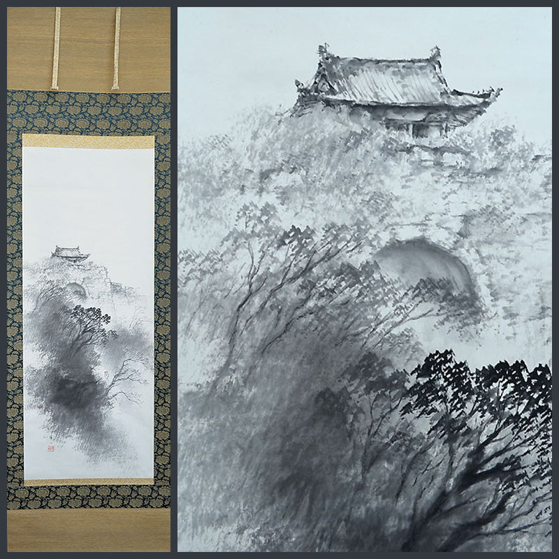 A superb image titled “Twilight at the Old Castle” by Hirai Baisen enclosed in the original wooden box signed Chikujo-so Baisen. He has used a combination of very wet washes with dry brisk strokes to create a classic scene by this artist. The approach of a solitary figure below sets this apart. It is performed with ink and light color on paper, bordered in a fine frame of patterned brocade. It is 26-1/2 x 90 inches (67 x 229 cm) and in fine condition. It features large ivory rollers, which will need to be changed if shipped outside Japan.