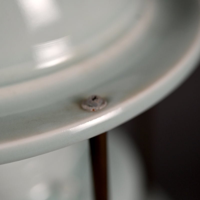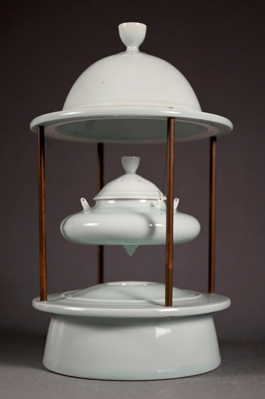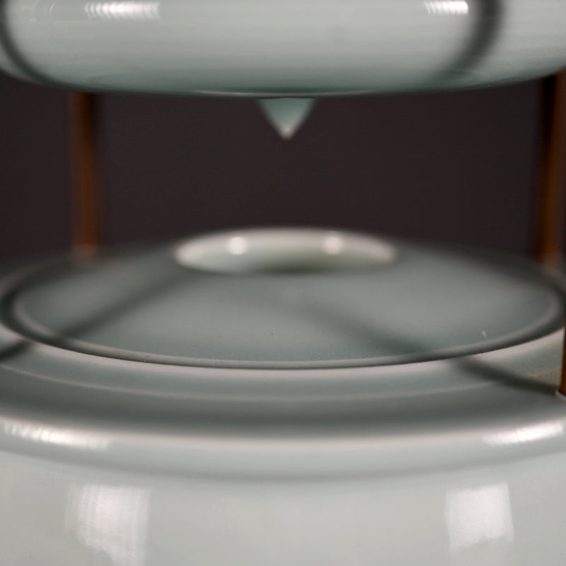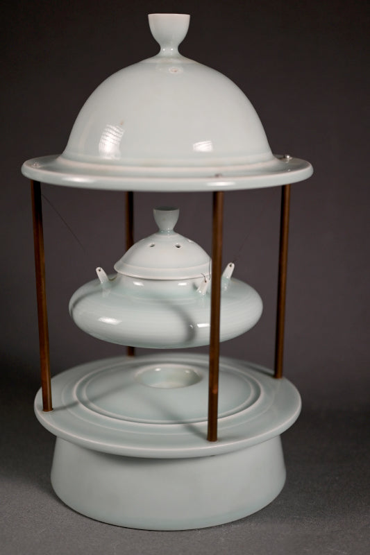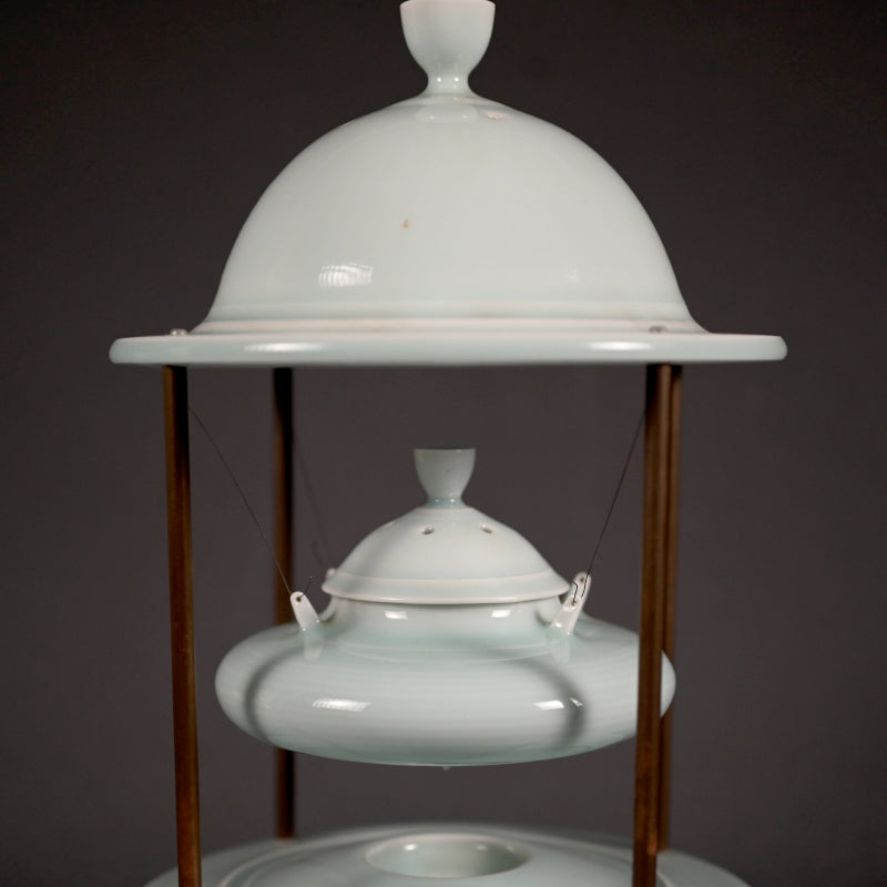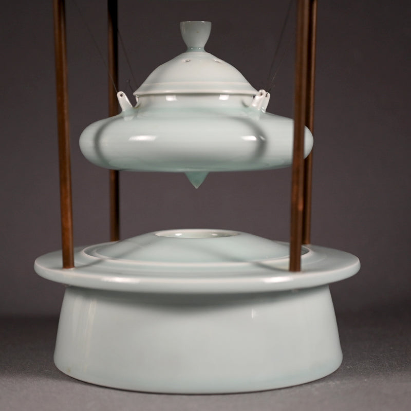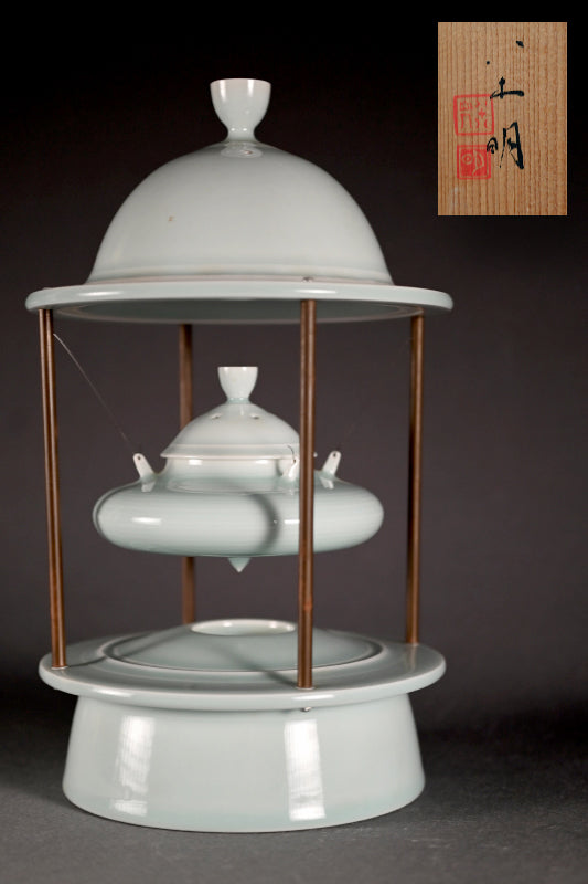 An exquisite celadon koro handgs suspended in a stylish structure by Yagi Akira enclosed in the original signed wooden box titled Seihakuji Wa-goro. It is 18.5 cm (7-1/2 inches) diameter, 31 cm (12-1/4 inches) tall and in perfect condition.