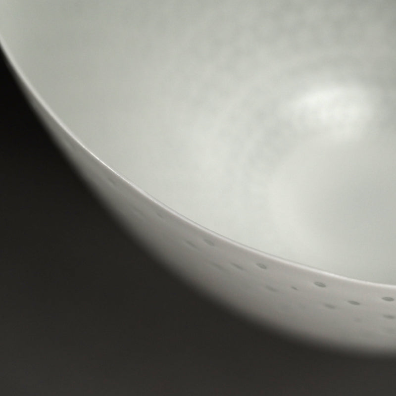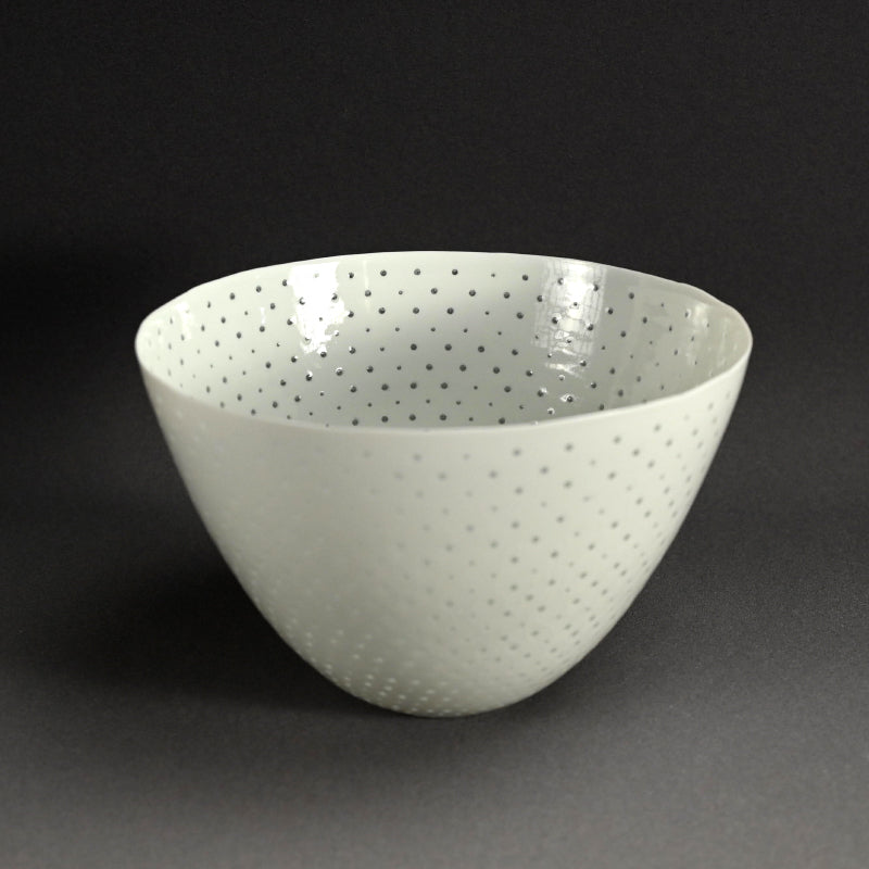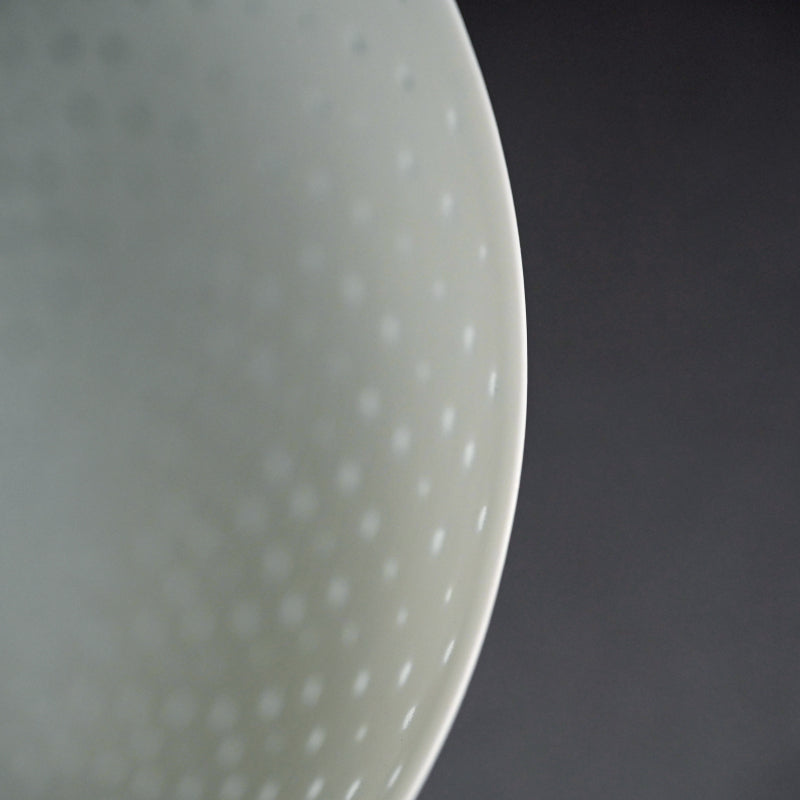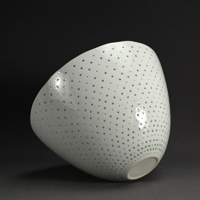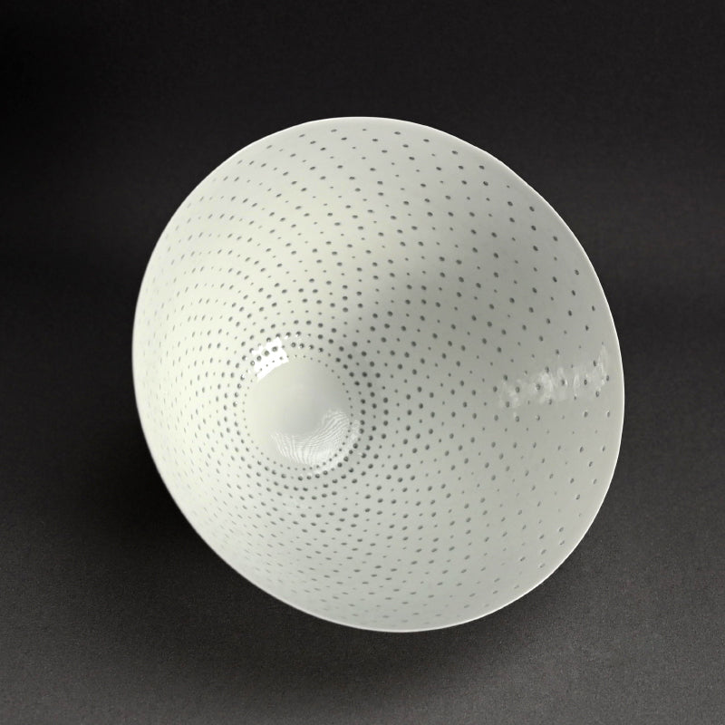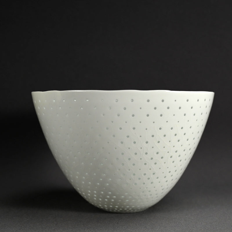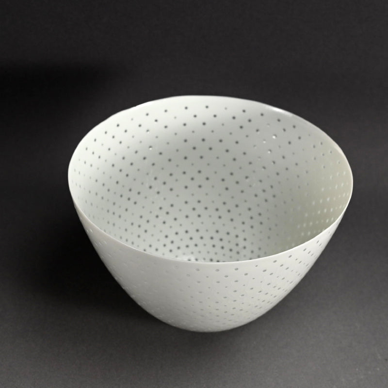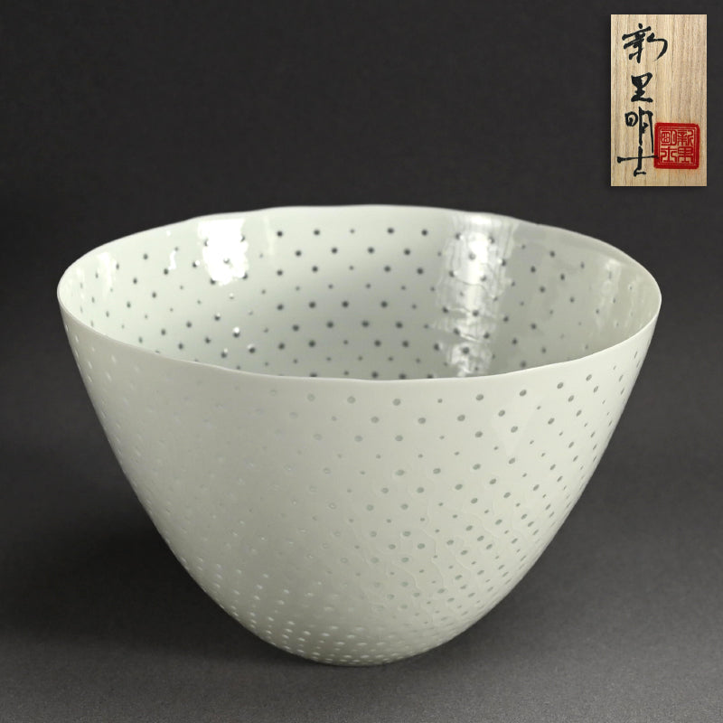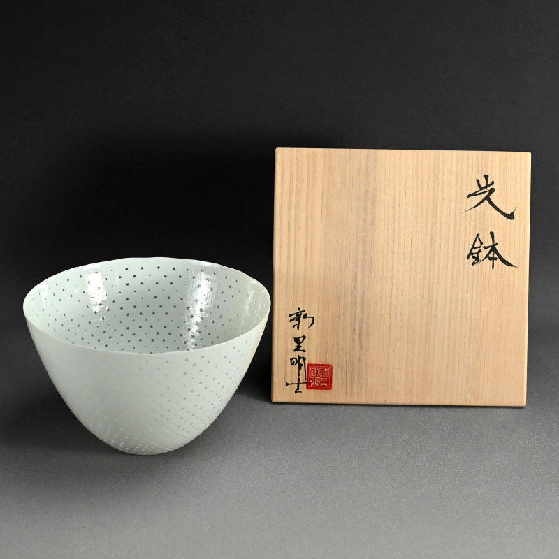 An exquisite large open vessel by Niisato Akio enclosed in the original signed wooden box titled Vessel of Light. The porcelain body is pierced with spiraling forma allowing light to pass through. It is 22 cm (9 inches) diameter, 14 cm (5-1/2 inches) tall and in excellent condition.