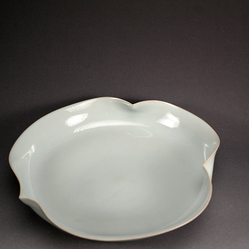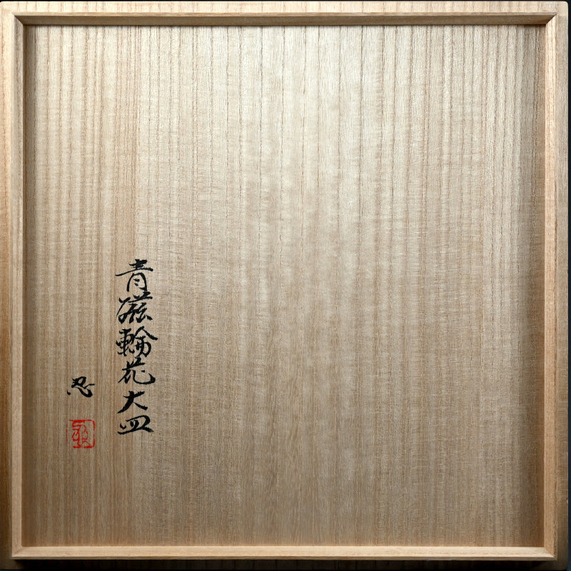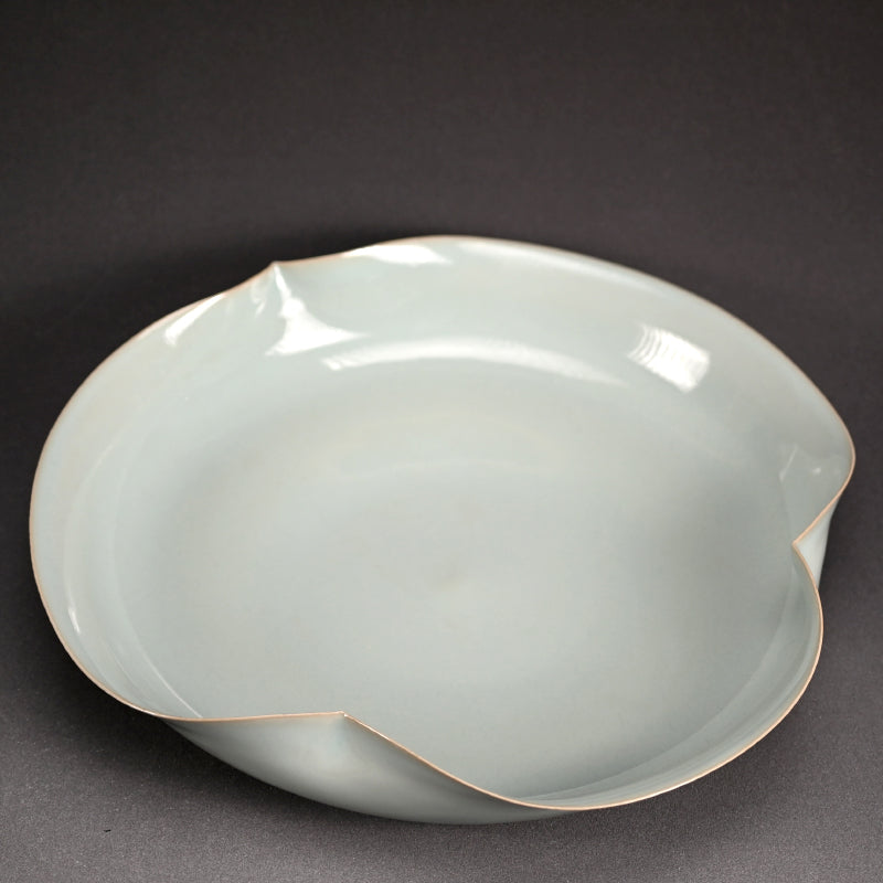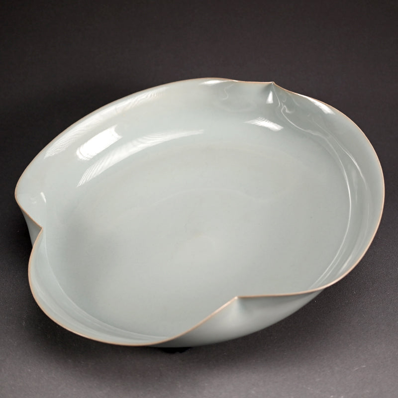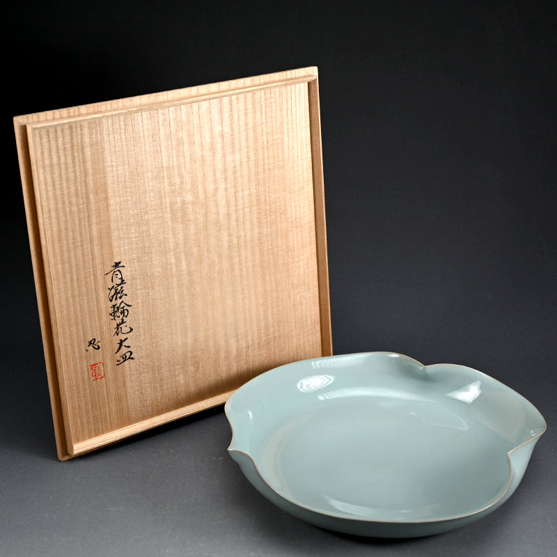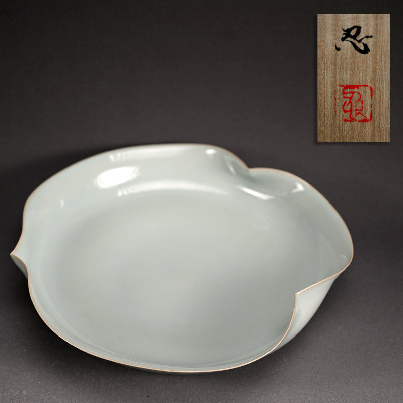 An undulating porcelain form by Kawase Shinobu enclosed in the original signed wooden box titled Seiji Rinka O-bachi. It is 37 cm (15 inches) diameter, 8 cm (3 inches) tall and in excellent condition.