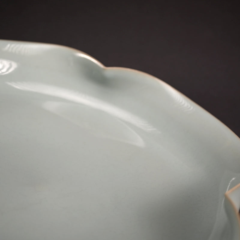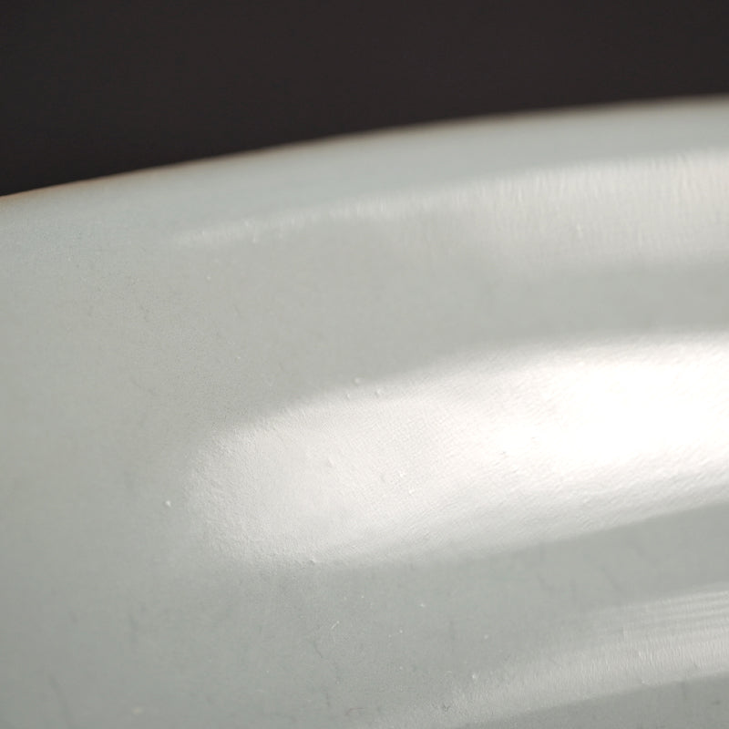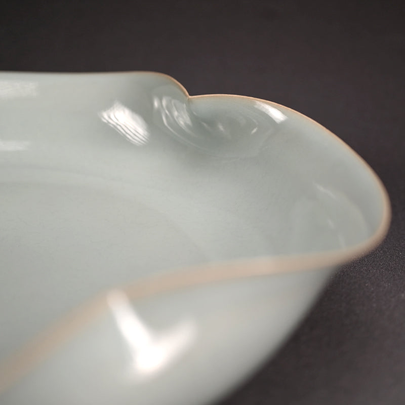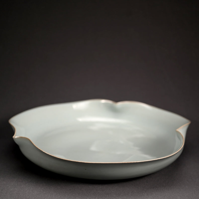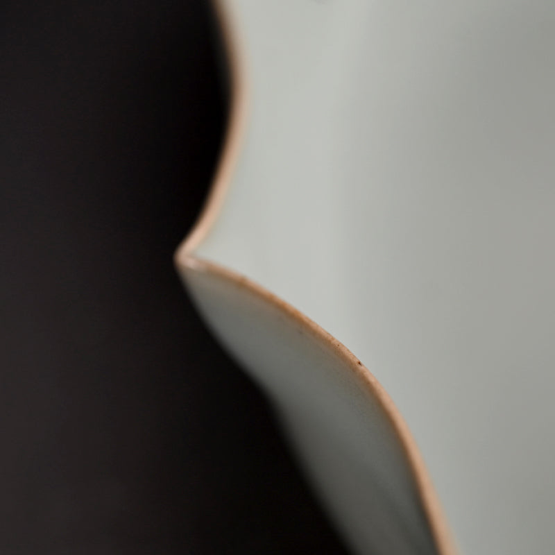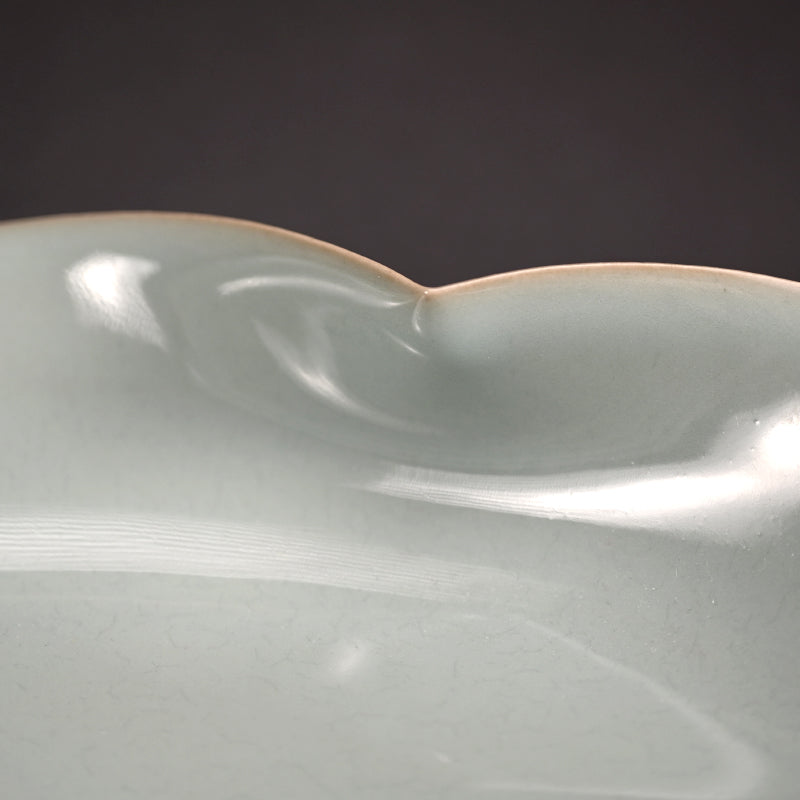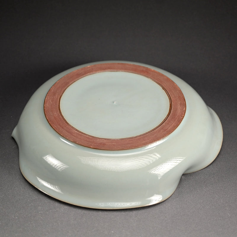 An undulating porcelain form by Kawase Shinobu enclosed in the original signed wooden box titled Seiji Rinka O-bachi. It is 37 cm (15 inches) diameter, 8 cm (3 inches) tall and in excellent condition.