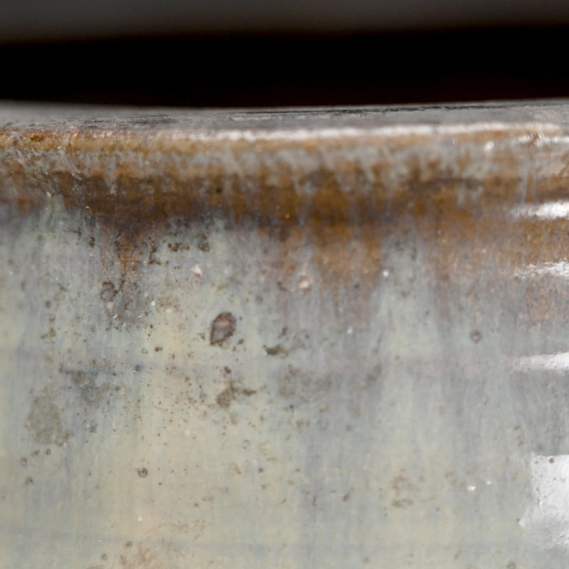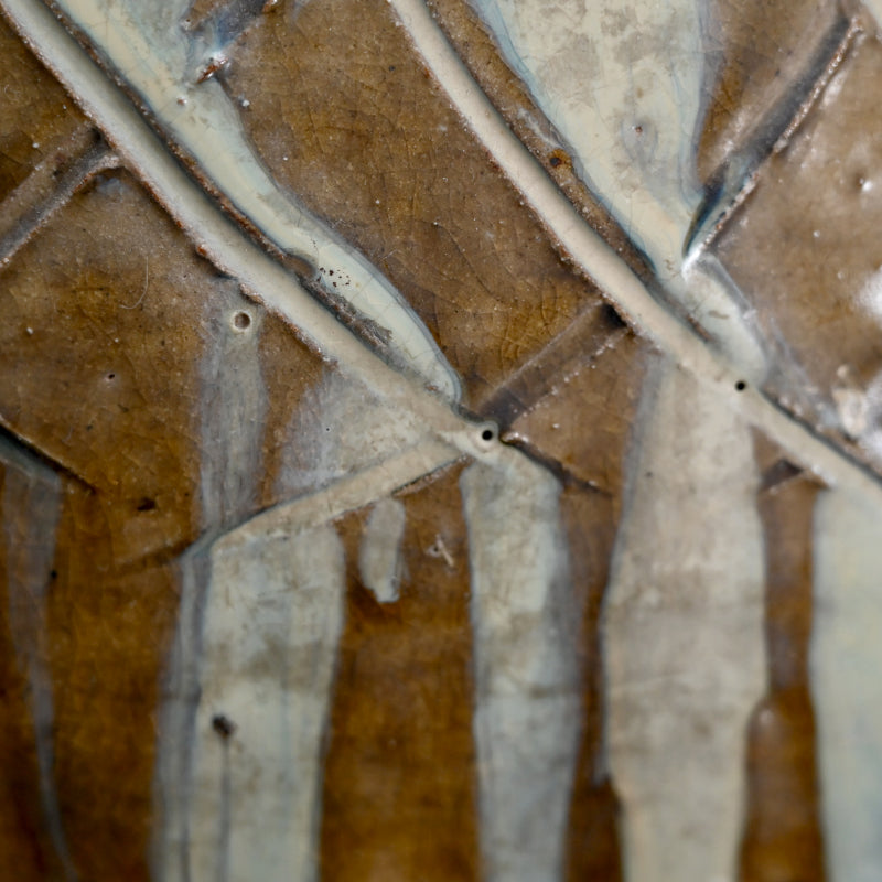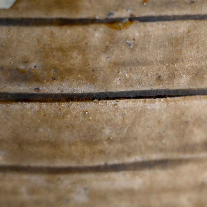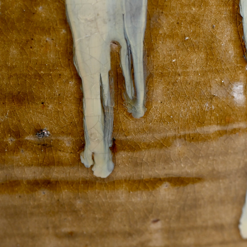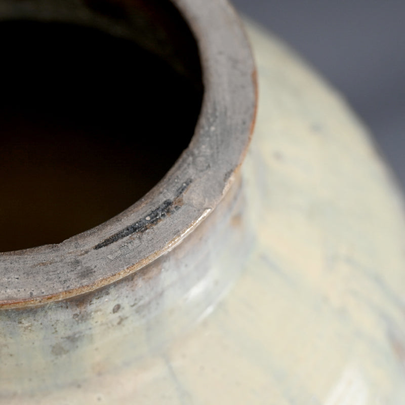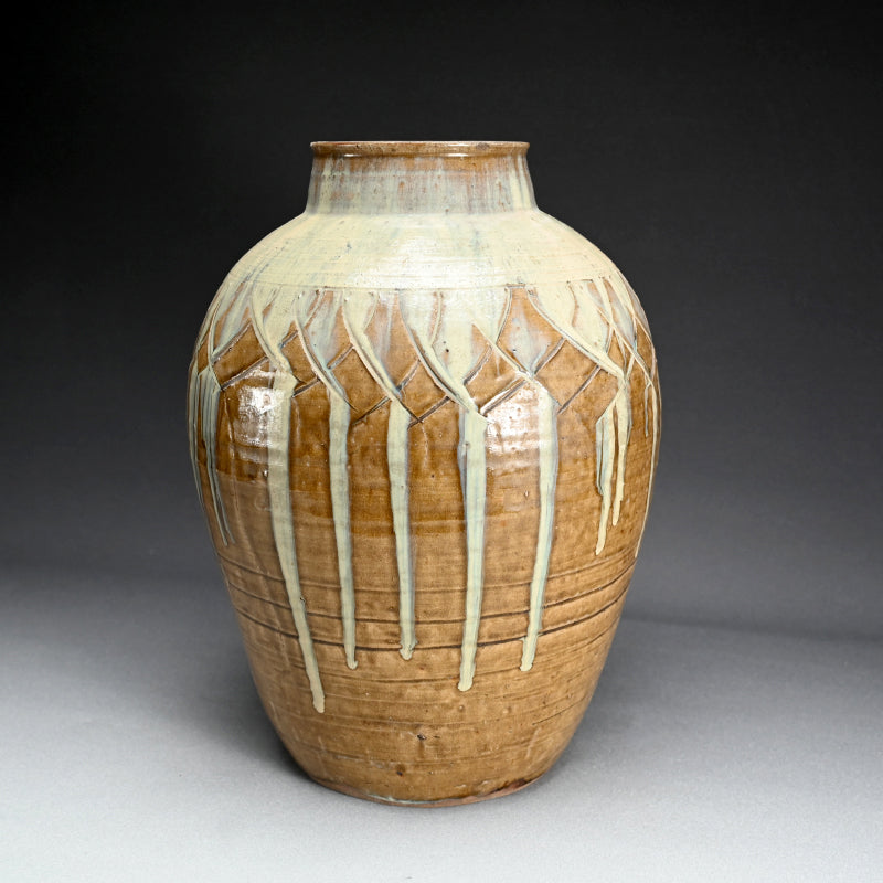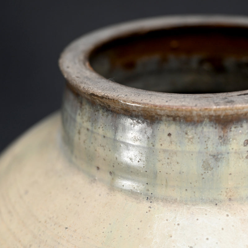 A rare large earthenware jar from the kilns of Amakusa in Kumamoto prefecture, southern Japan. Amakusa is rarely decorated, but this jar is beautifully rendered with overlapping petals like lotus flowers about the shoulder which catches and diverts into streamlets what appears to be bamboo ash glaze running down from the neck. It is heavily potted, mad to withstand human usage. The jar is 34 cm (13-1/2 inches) diameter, 44 cm (17 inches) tall and in excellent condition.