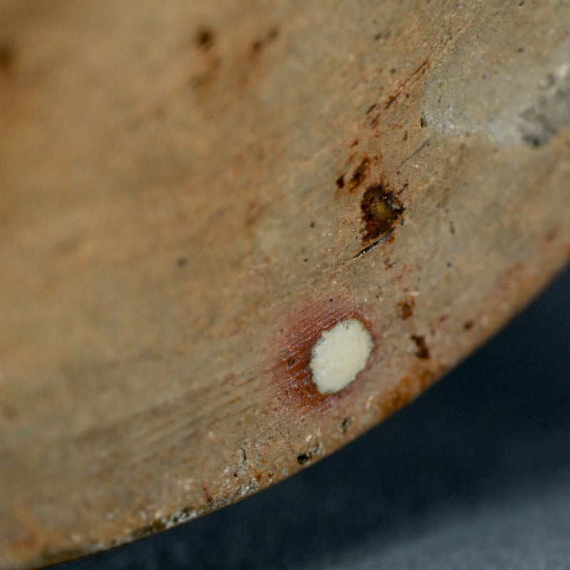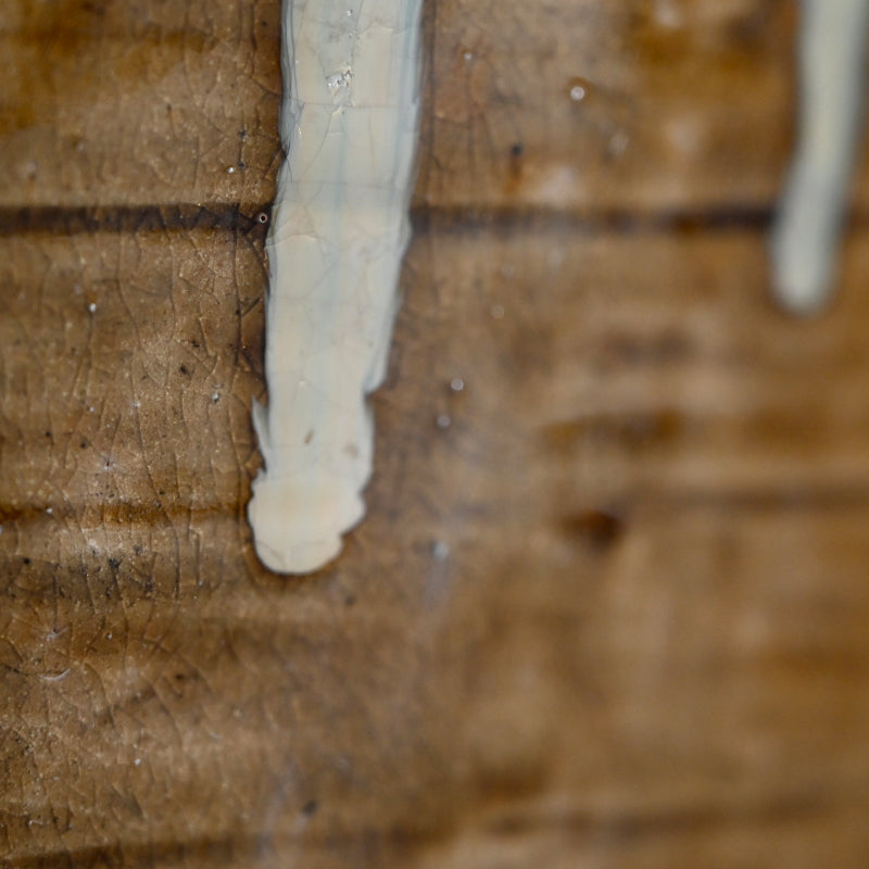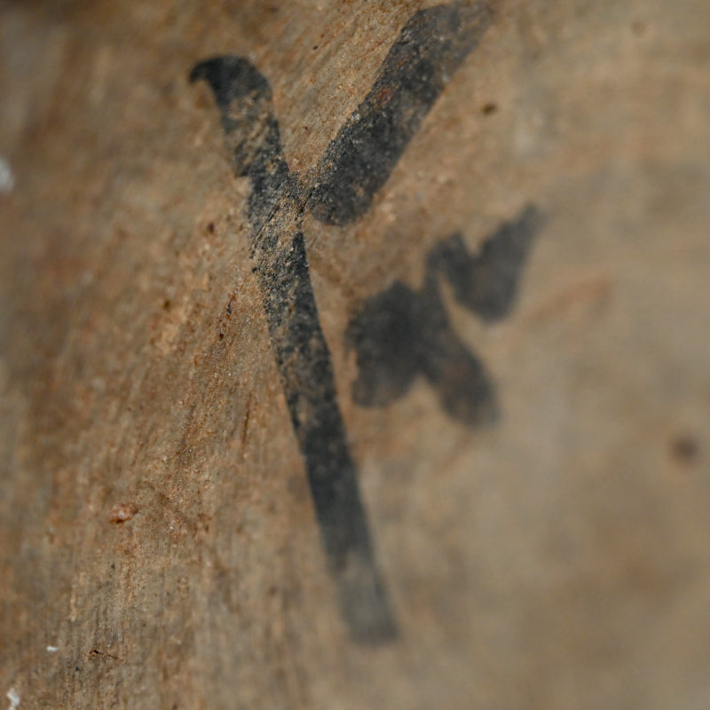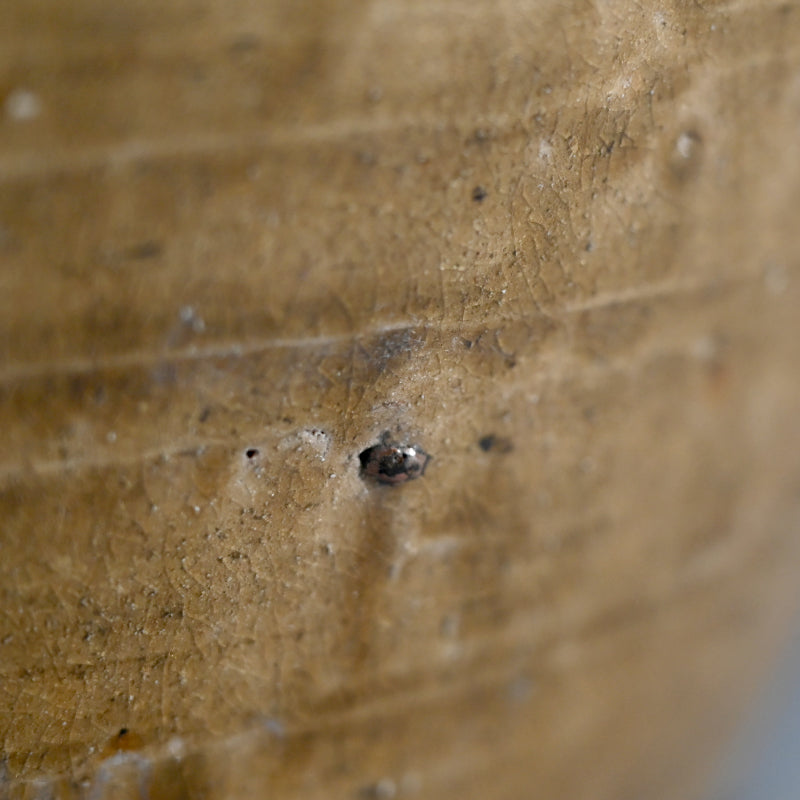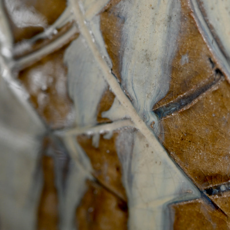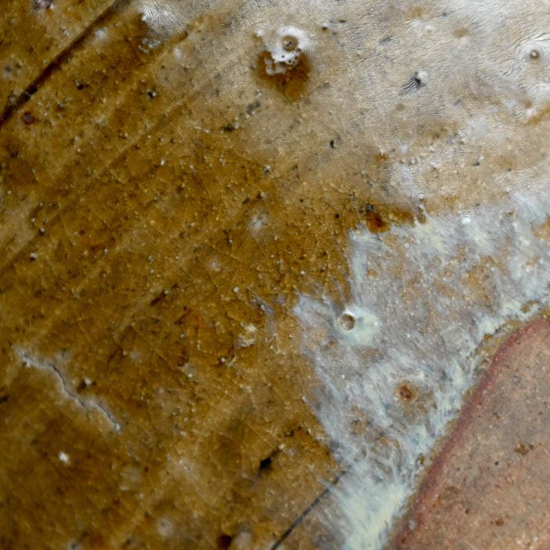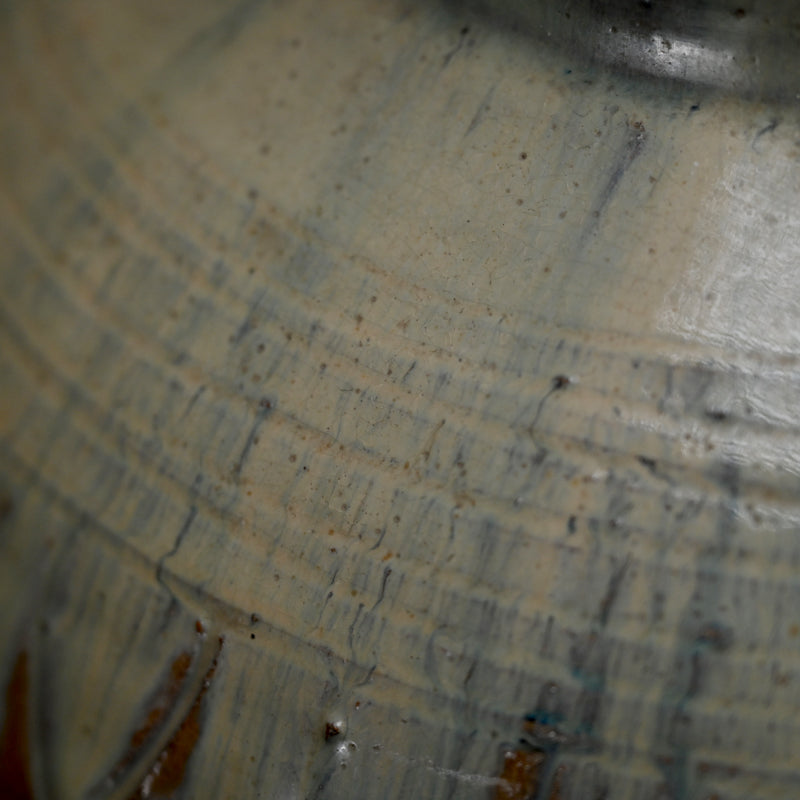 A rare large earthenware jar from the kilns of Amakusa in Kumamoto prefecture, southern Japan. Amakusa is rarely decorated, but this jar is beautifully rendered with overlapping petals like lotus flowers about the shoulder which catches and diverts into streamlets what appears to be bamboo ash glaze running down from the neck. It is heavily potted, mad to withstand human usage. The jar is 34 cm (13-1/2 inches) diameter, 44 cm (17 inches) tall and in excellent condition.