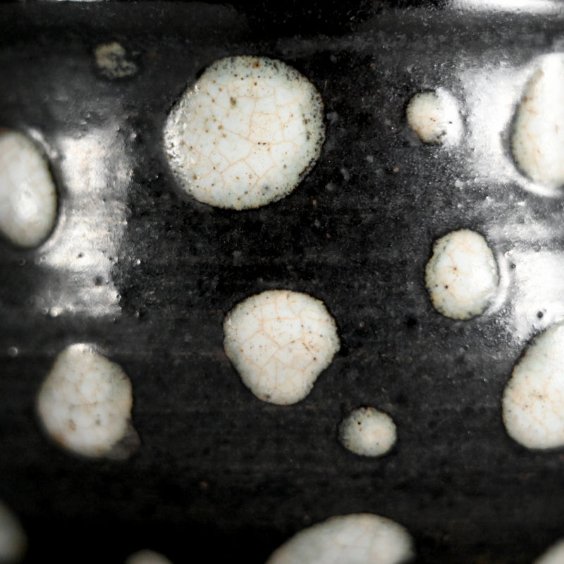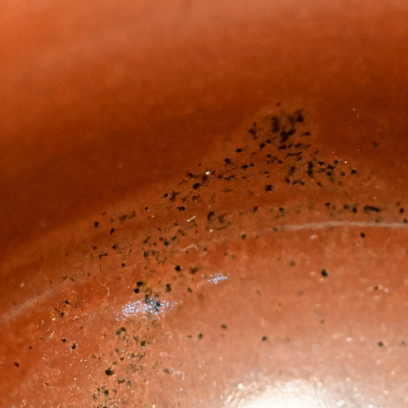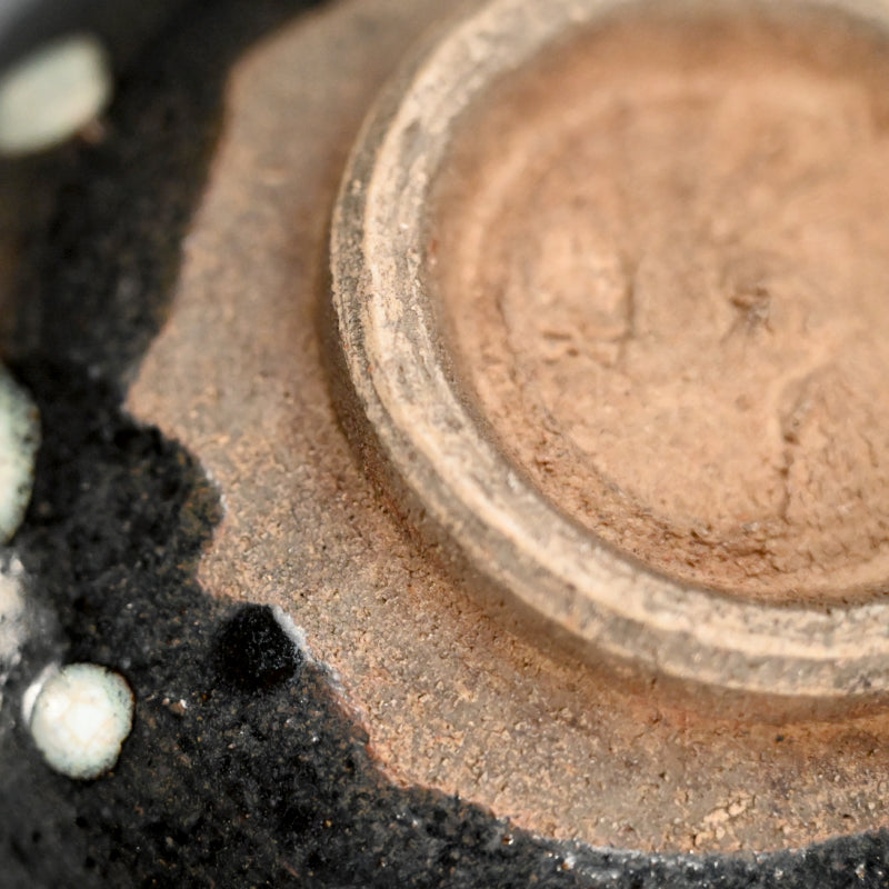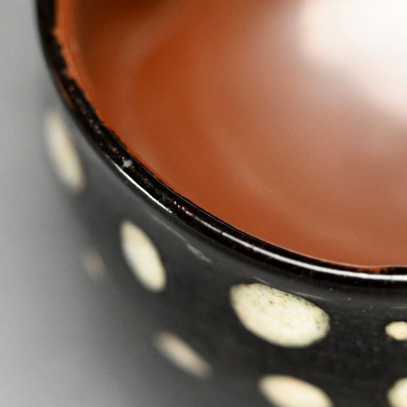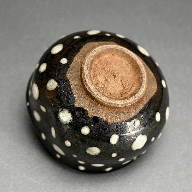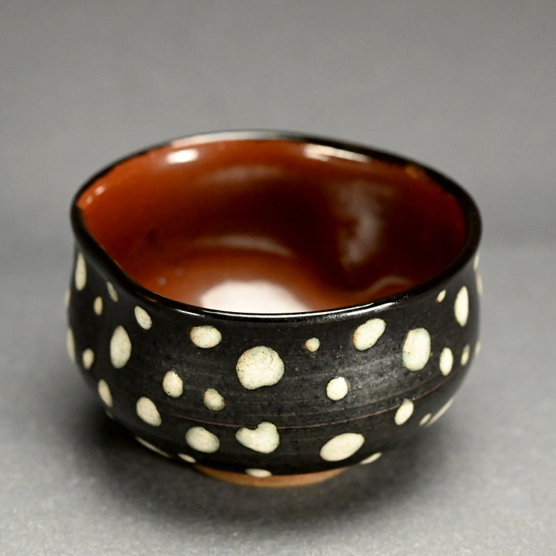 A spectacular bowl covered inside with a rich caramel color, outside in dark amber glaze outside with various white dots evenly distributed around the surface, and clearly stamped Zoroku on the base in the original signed wooden box titled Kosetsu Chawan. It is 13.5 cm (65-1/2 inches) diameter, 7.5 cm (3 inches tall) and in excellent condition.