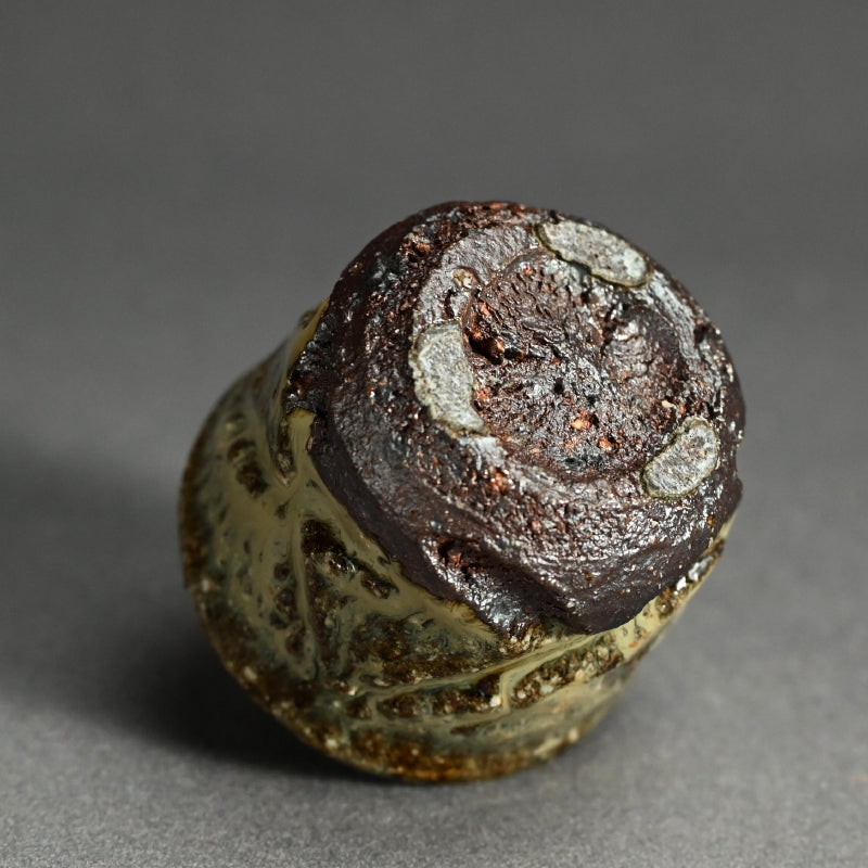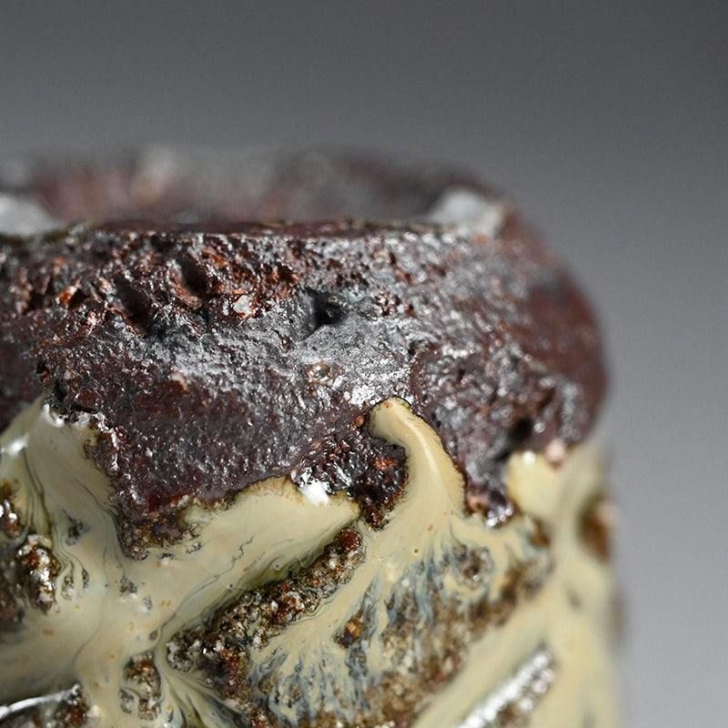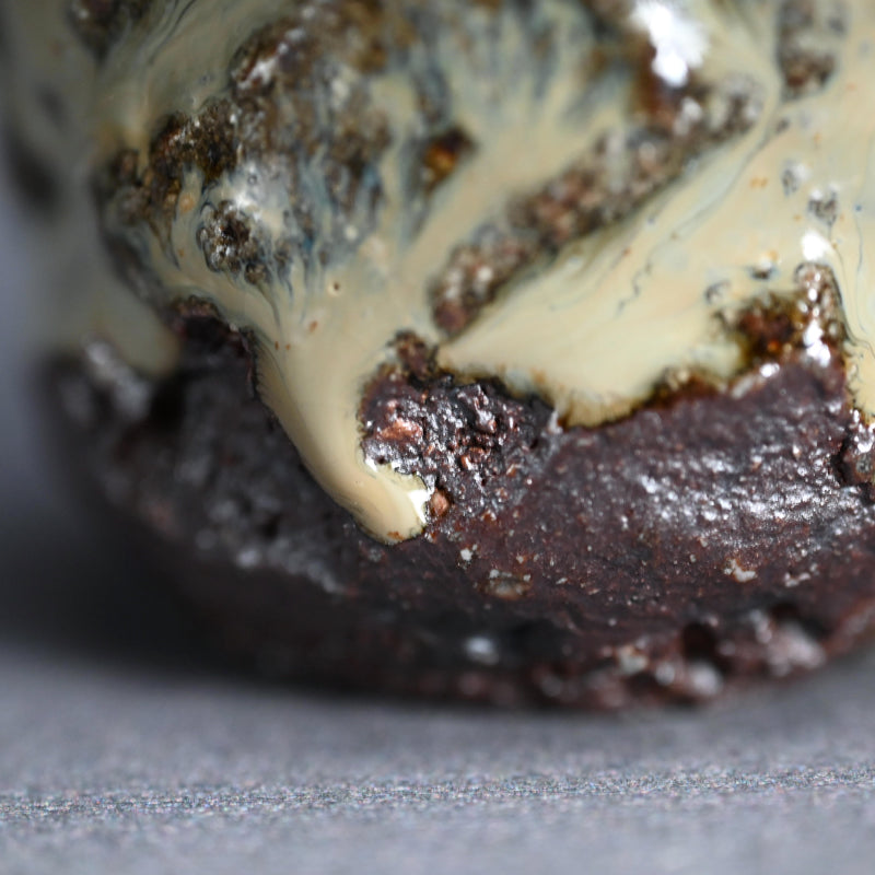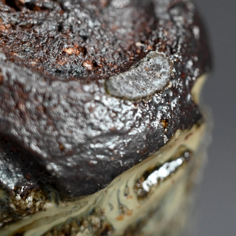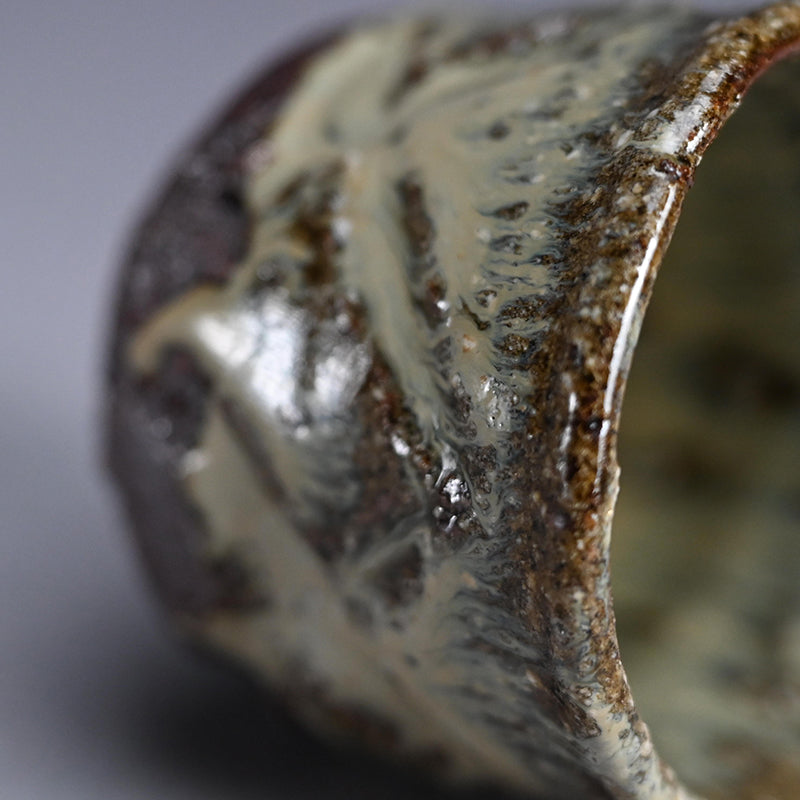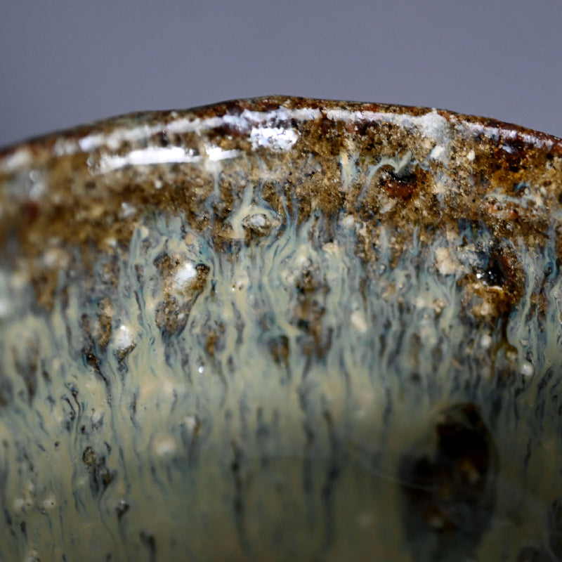 Nakagawa Jinenbo (1953-2011) was a celebrated Japanese ceramic artist always fascinated with Karatsu ware. He studied under the great Inoue Toya from the age of 24. Several years later he returned to his hometown to establish a climbing kiln of his own, which he put to great use. From there, not satisfied with his own skills, he went to Tanaka Sajiro for an additional apprenticeship. Afterwards, as many Chajin artists, he concentrated on private exhibitions as an outlet for his work, shunning the world of mass competition and retail. Known for his inventive surface treatments, he applied dark brushwork onto red iron-rich clay bodies, creating dynamic, textured finishes that spoke to both tradition and spontaneity. His work features richly textured glazes and organic forms reflective of the Karatsu tradition, especially the distinctive Madara Karatsu style, noted for its mottled, natural glazes ranging from milky white to bluish or reddish hues, achieved through wood firing and experimentation with firing techniques. His life and career were cut short far too early, making his work both highly valued and hard to find.