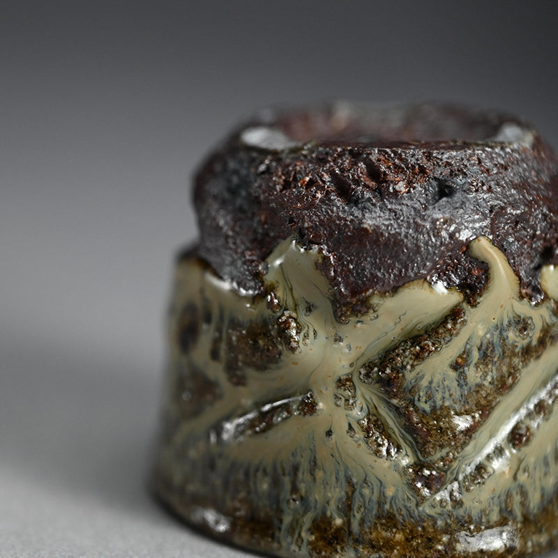 Deep clefts filled with mottled glaze are scored into the sides of this stellar sake cup by Nakagawa Jionenbo enclosed in the original signed wooden box titled Chohan (Hori Madara) Karatsu Guinomi. It is 6.8 cm (2-1/2 inches) diameter, 5.5 cm (just over 2 inches) tall and in perfect condition.