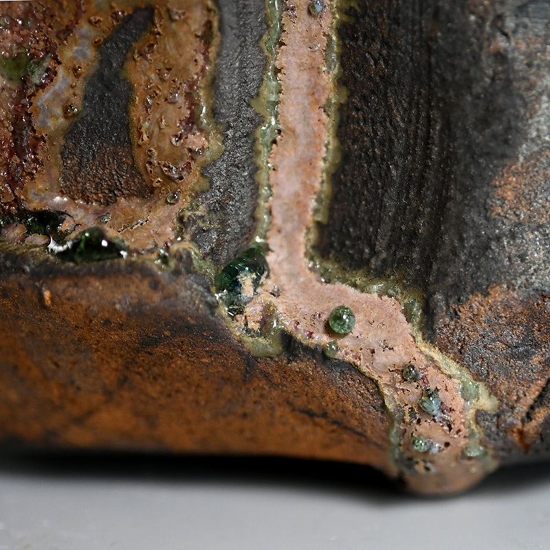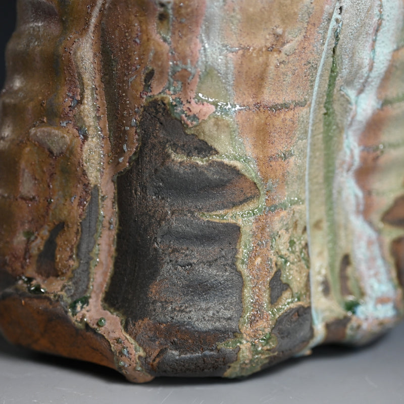 This vessel epitomizes the work of innovative artist Hayashi Shotaro, the misshapen vessel enclosed in the original signed wooden box titled Manyosai Mimitsuki Hanaike. It is 15 x 18 cm (6 x 7 inches) at the base, 24.5 cm (just under 10 inches) tall and in excellent condition.