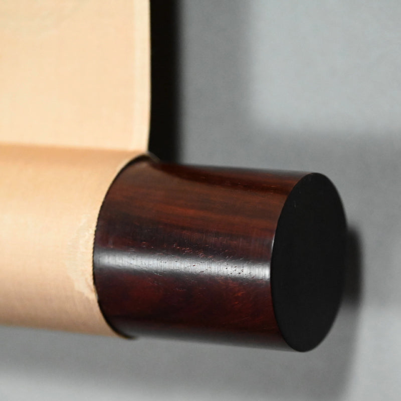 A huge painting of carp frolicking in the waves dating from the Edo period signed the 61 year old Tamaoka. Ink, light color and gofun on paper, it has been completely restored in patterned blue silk with massive wood rollers. The scroll is 129.5 x 216 cm (51 x 85 inches) and is in excellent condition. Little is known of the life of 19th century painter Mori Gyokko, he was included in the list Kokon Maika (Painters of Old and New) published in 1881. The scroll comes in a fine modern Kiri-wood box.