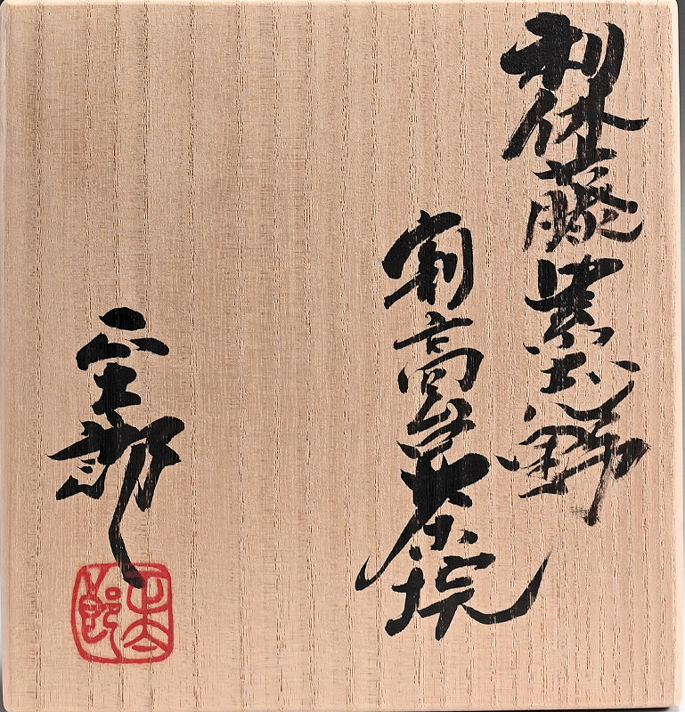 An incredible Chawan in absurdly thick glaze resting on a wari-kodai foot by Master o Shino Hayashi Shotaro named Ryoga (Surpassing) enclosed in the original signed double wood box titled Rikkyu Fuji-Murasaki Shino Wari Kodai Chawan (Rikkyu Purple Wysteria Shino Split Foot Tea Bowl). Inside the bowl is crazed purple tinged smooth glaze, while outside the pink tinged white glaze seems to be pealing away from the surface in thick daubs. It is 14 cm (5-1/2 inches) diameter, 11.5 cm (4-1/2 inches) tall and is in perfect condition. Thie inner box is top quality kiri-wood, the outer box coated in black lacquer.
