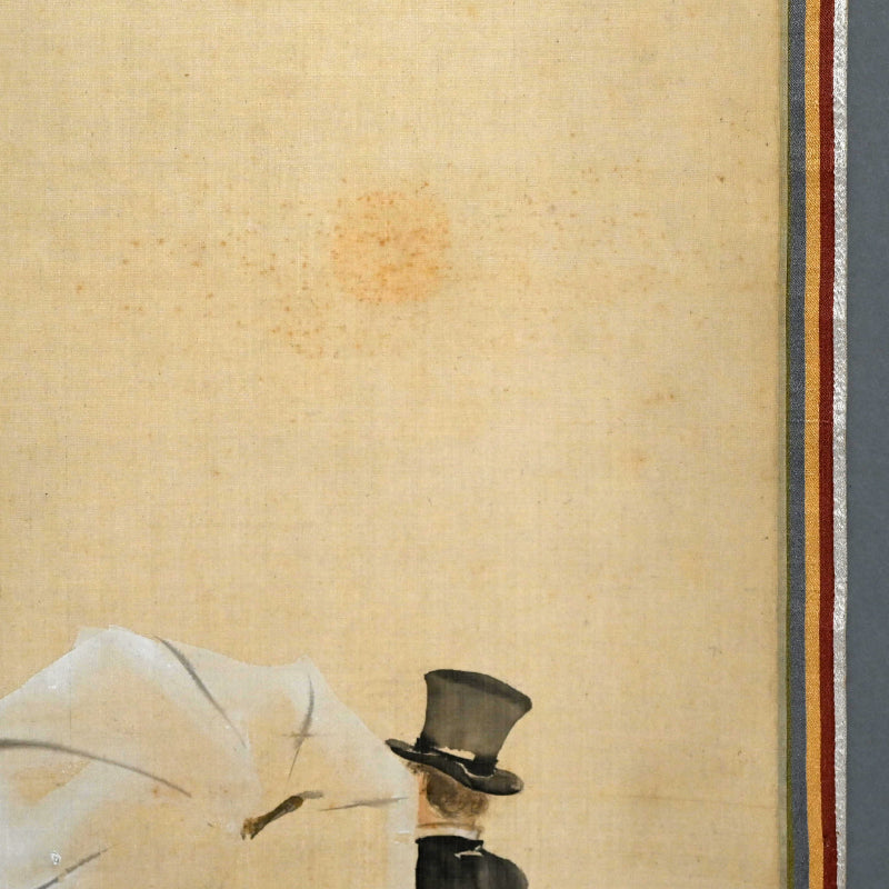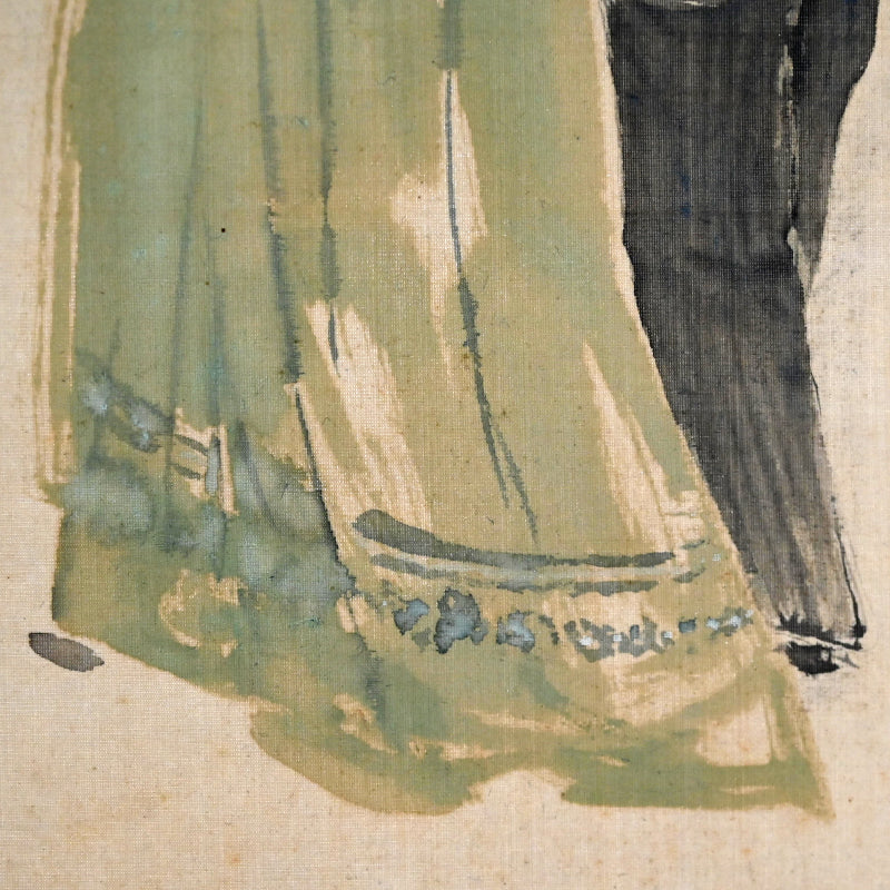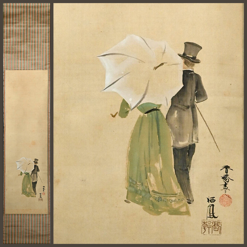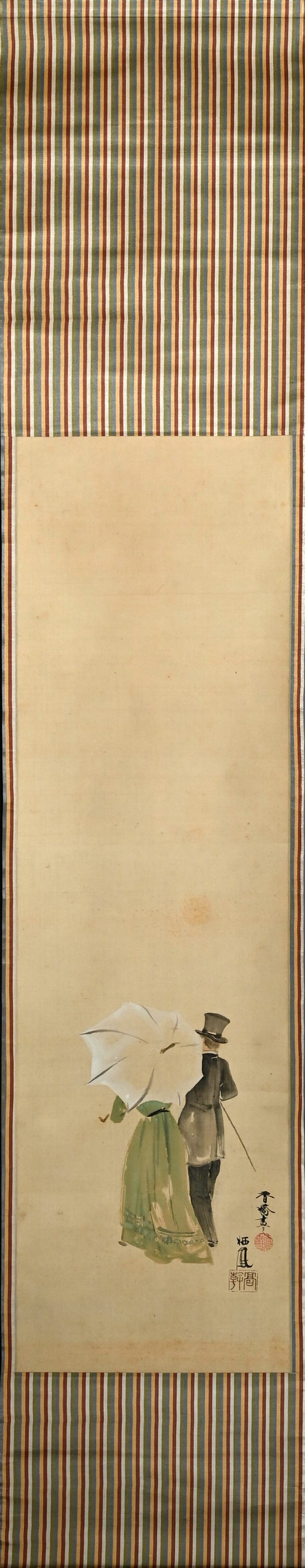A gentleman and a lady walk in full western dress on this Gassaku painting by Takeuchi Seiho and Taniguchi Kokyo enclosed in a period wooden box dated 1907. According to the inscription Seiho painted the lady, and Kokyo the gentleman. Pigment on silk, it is bordered in mullti-colored striped silk and features red lacquered rollers. The scroll is 33 x 171 cm (13 x 67-1/2 inches) and in overall fine condition.