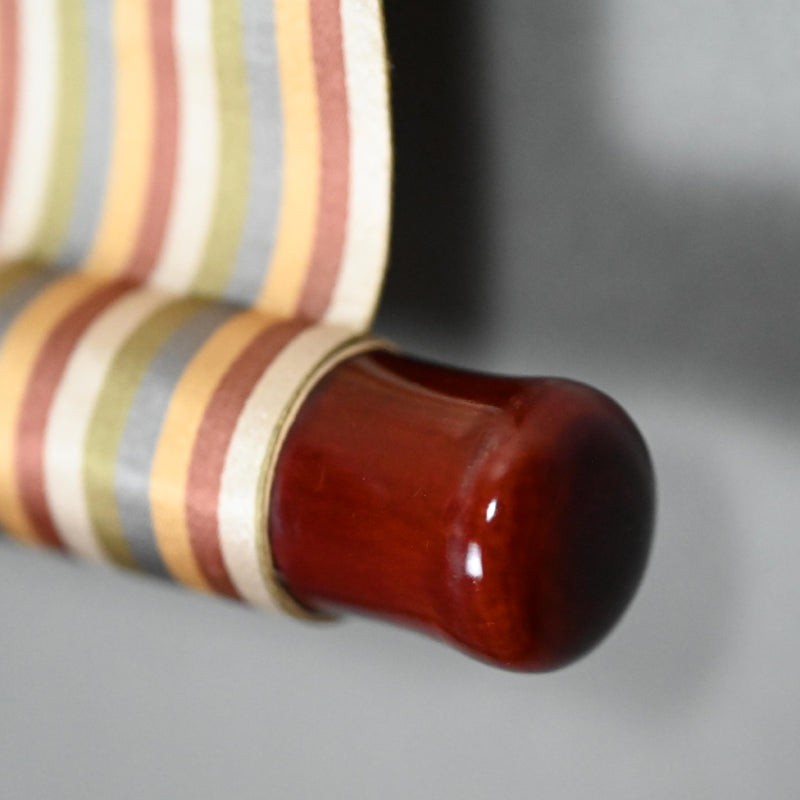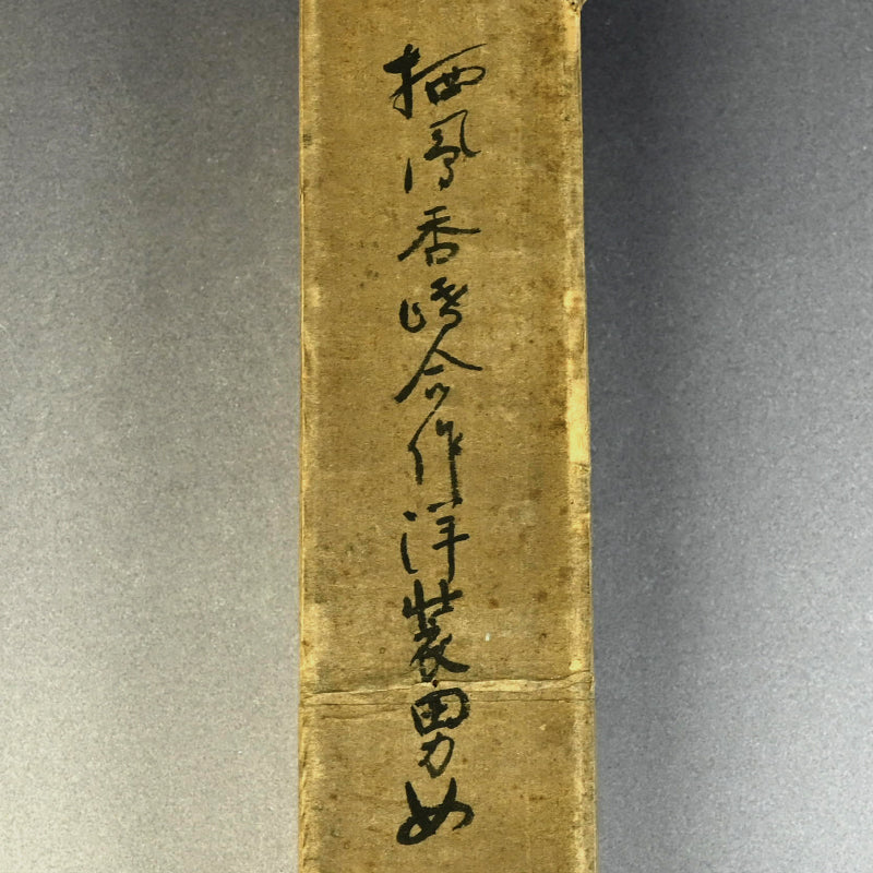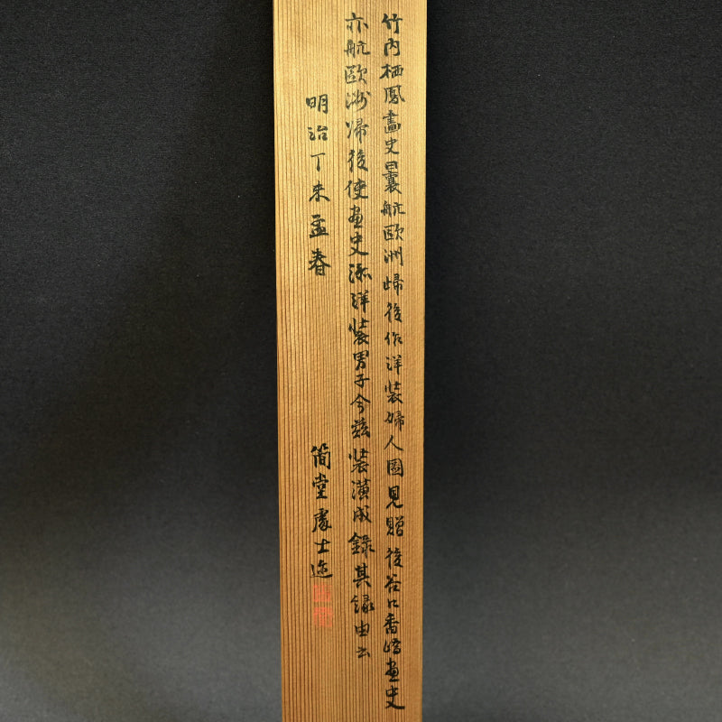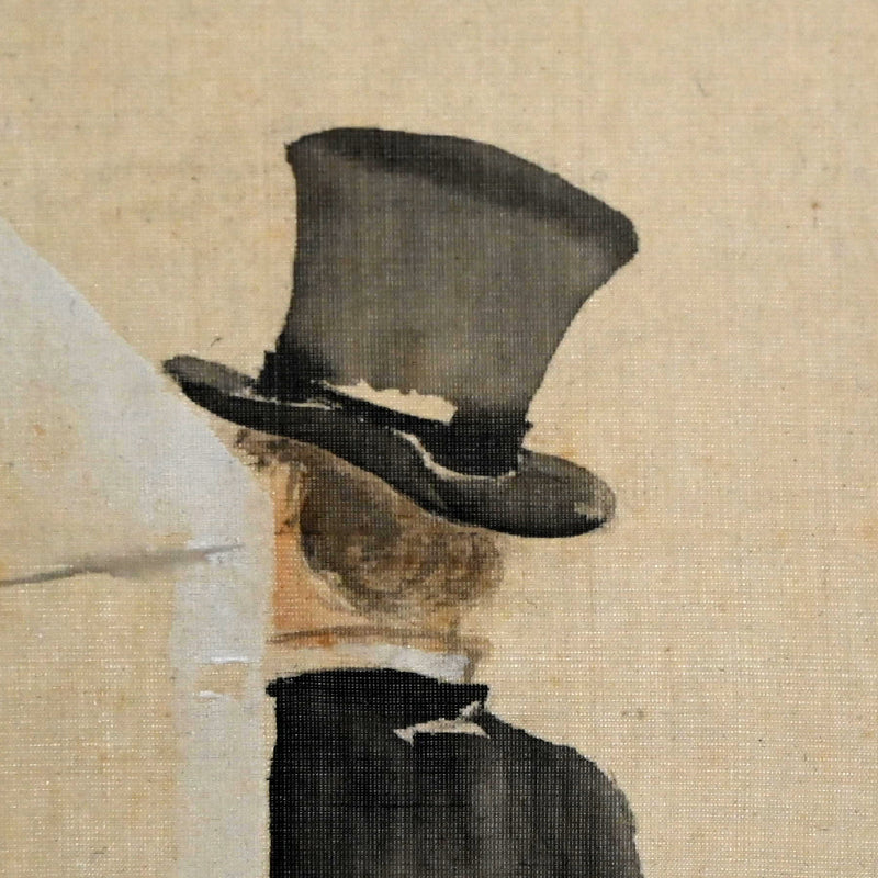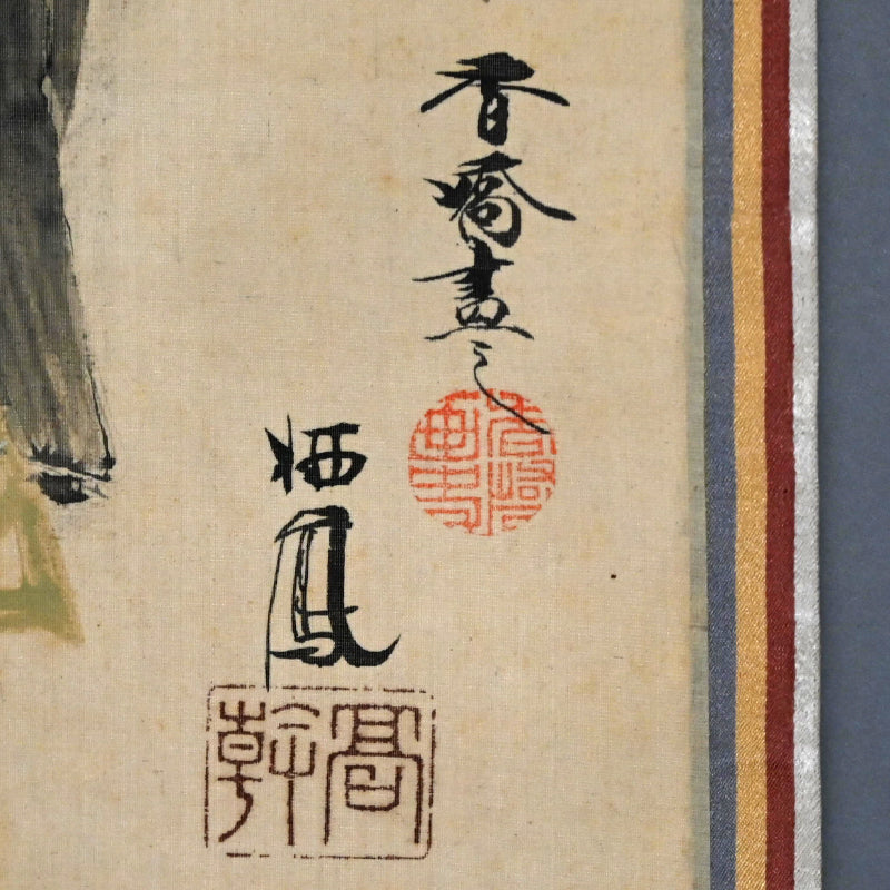 A gentleman and a lady walk in full western dress on this Gassaku painting by Takeuchi Seiho and Taniguchi Kokyo enclosed in a period wooden box dated 1907. According to the inscription Seiho painted the lady, and Kokyo the gentleman. Pigment on silk, it is bordered in mullti-colored striped silk and features red lacquered rollers. The scroll is 33 x 171 cm (13 x 67-1/2 inches) and in overall fine condition.