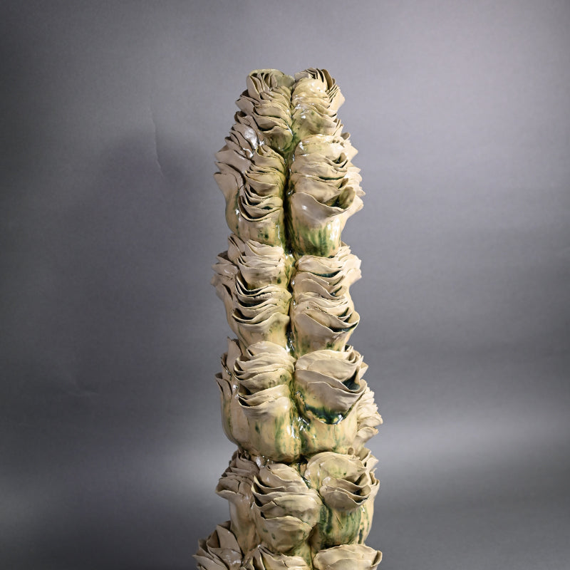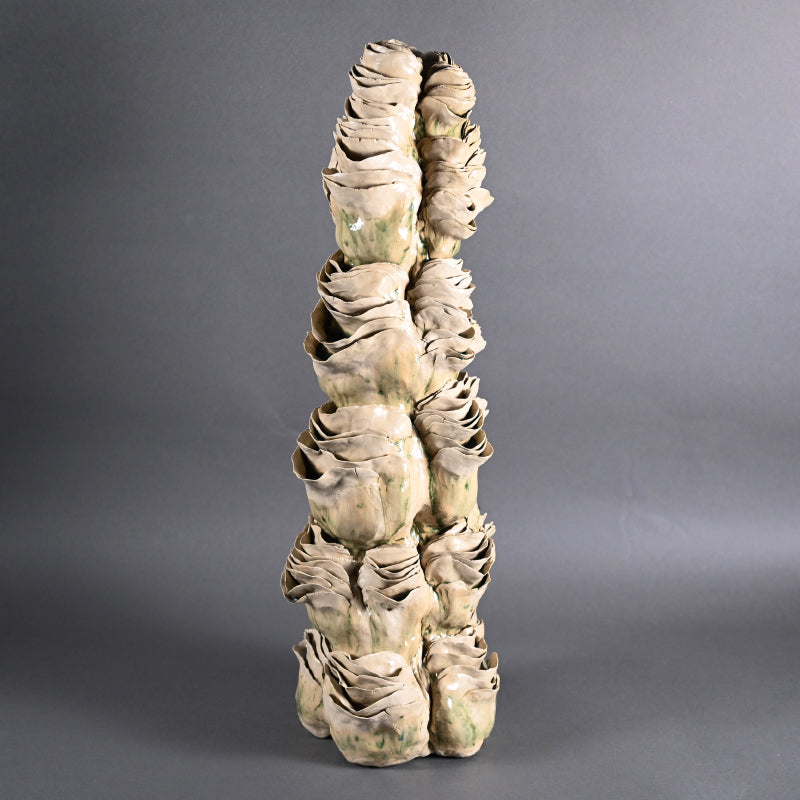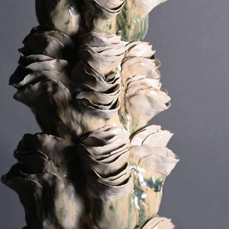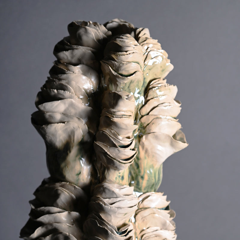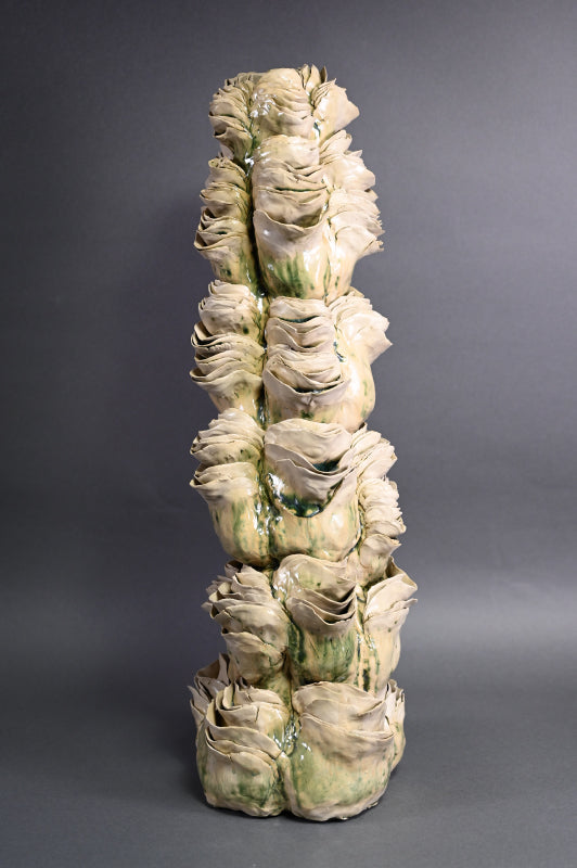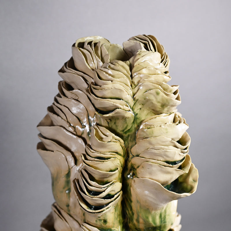 A tall fluted ceramic sculpture by Yamaguchi Mio titled Memory dating from 2020. Green glaze covers the stalk and pools in the raw clay scallops. It is 61.5 cm (over 2 feet) tall and is in excellent condition, accompanied by a signed placard directly from the artist.