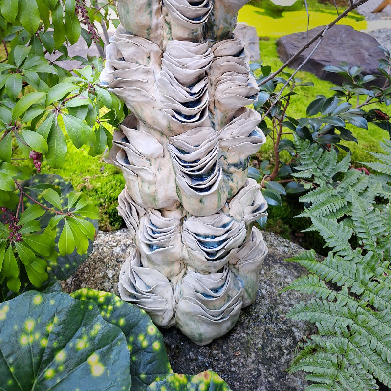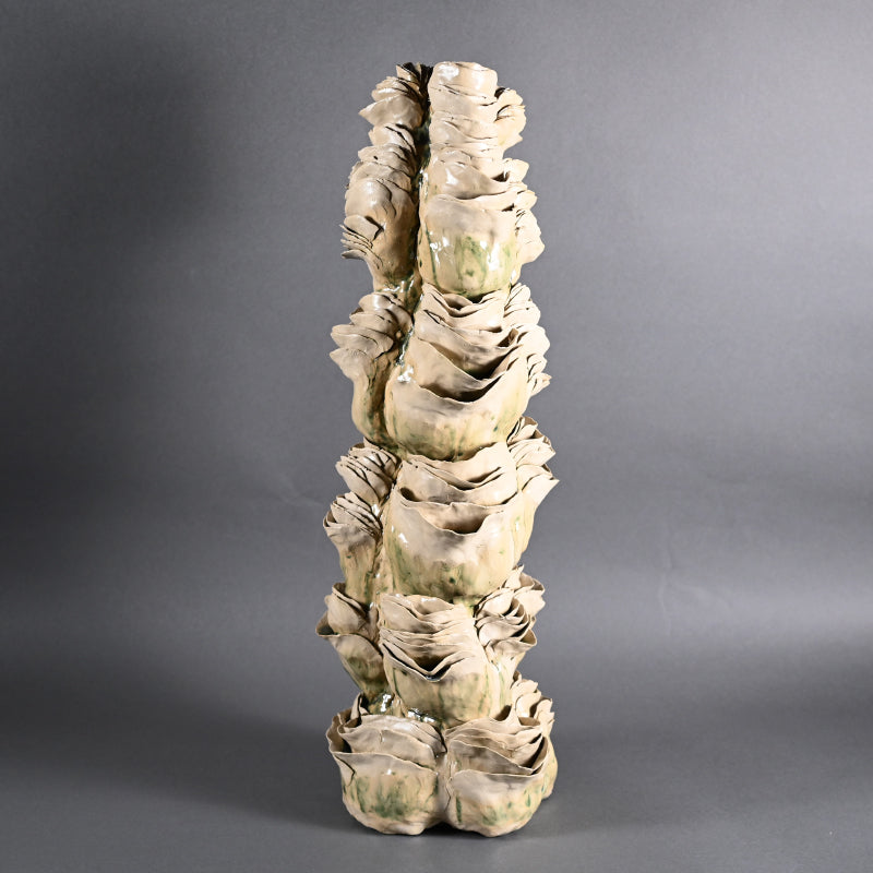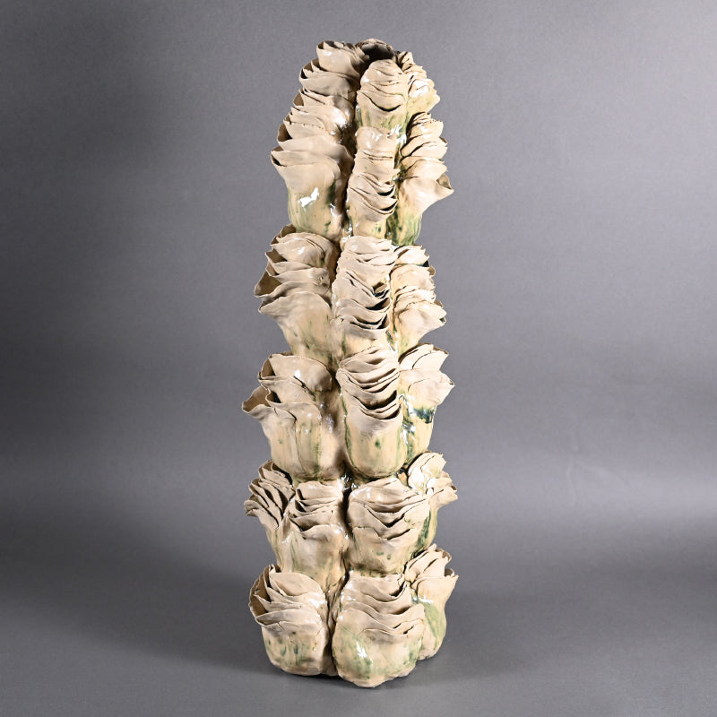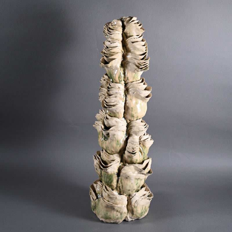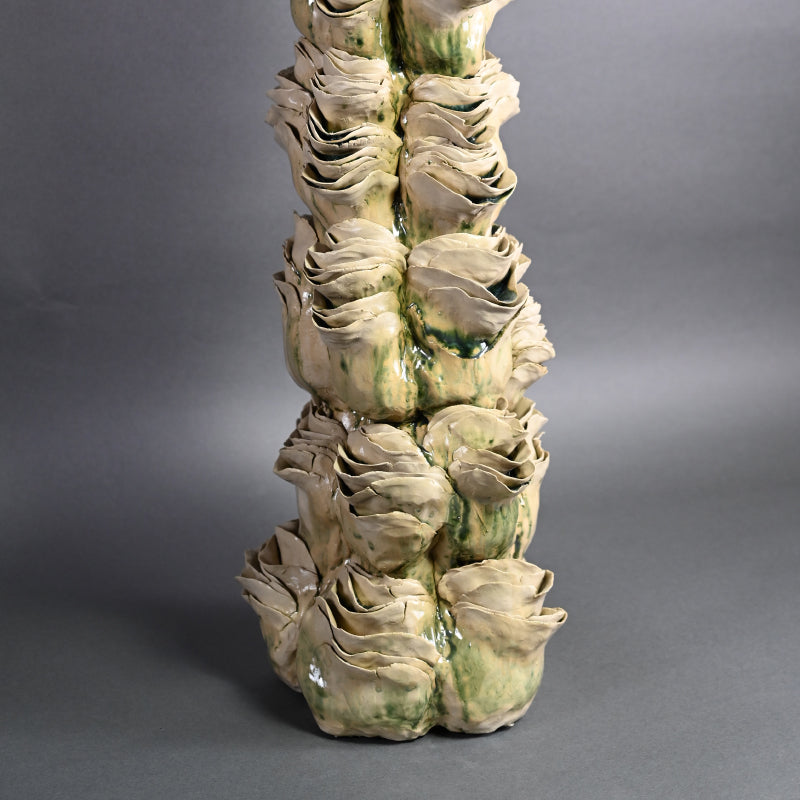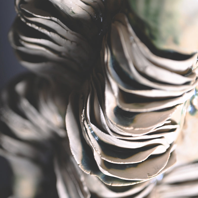 A tall fluted ceramic sculpture by Yamaguchi Mio titled Memory dating from 2020. Green glaze covers the stalk and pools in the raw clay scallops. It is 61.5 cm (over 2 feet) tall and is in excellent condition, accompanied by a signed placard directly from the artist.