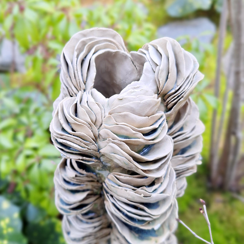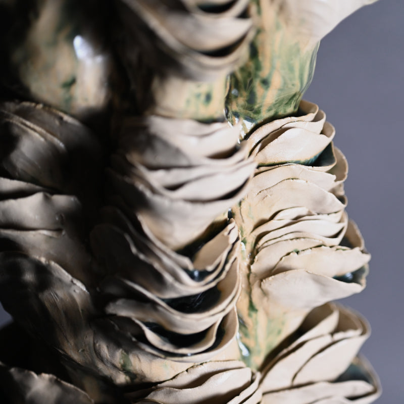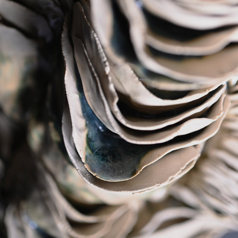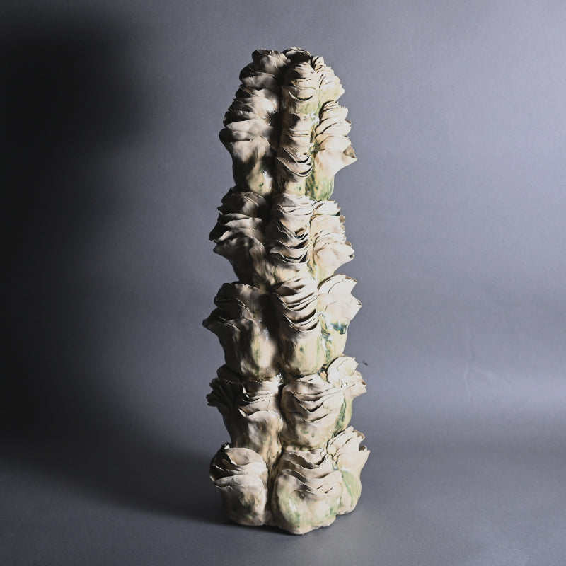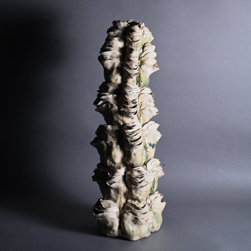 According to Mio: I feel that my fascination towards the natural world’s use of repetition, in bee hives and on the surface of corals, appears in my work as I consume and absorb the world around me. I like to believe that these works are natural forms made by my own hands. When I mold clay, I have a sensation that my body and consciousness blends and binds with the material and the natural world. The process of building upon each coil and applying each fold one by one with my hands is a form of meditation. Through this repetitive process I want to be able to convey my thoughts at the time in the texture, such as my struggle of swaying between the desires to live freely and falling under the pressure from societal expectations. It calms me down to observe the fingerprints left in the surface and see the traces of my existence in the clay. These works are products of what I have absorbed around me.
