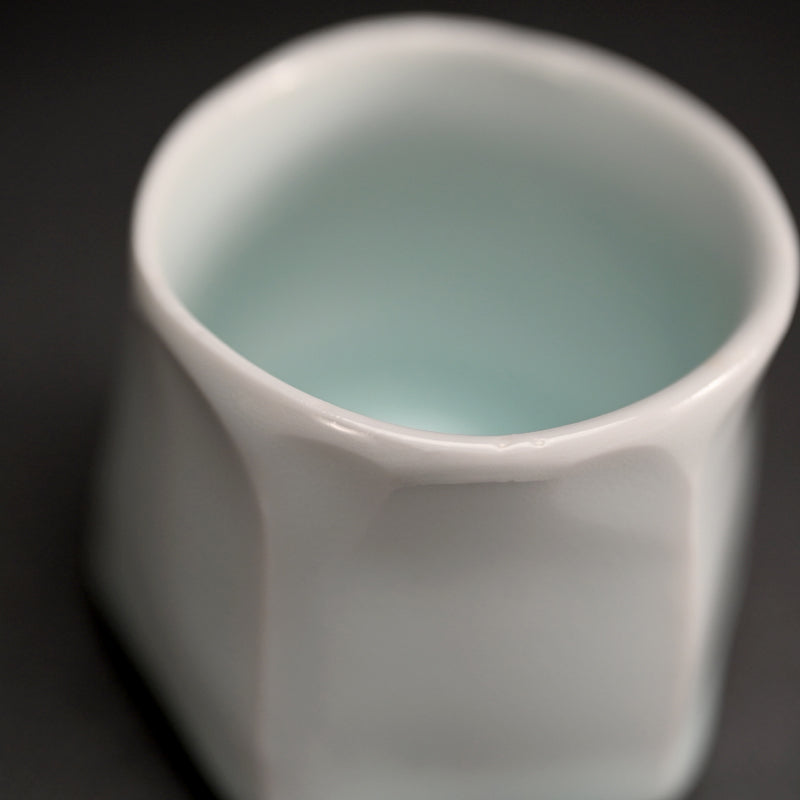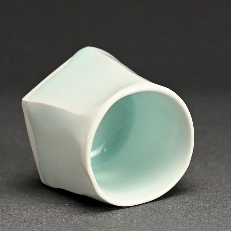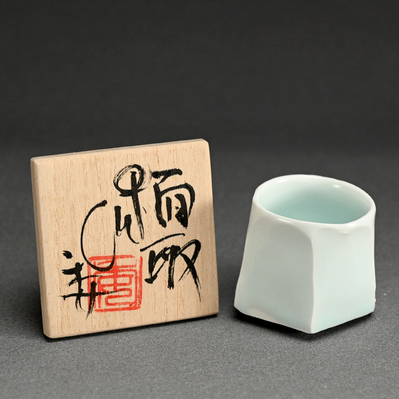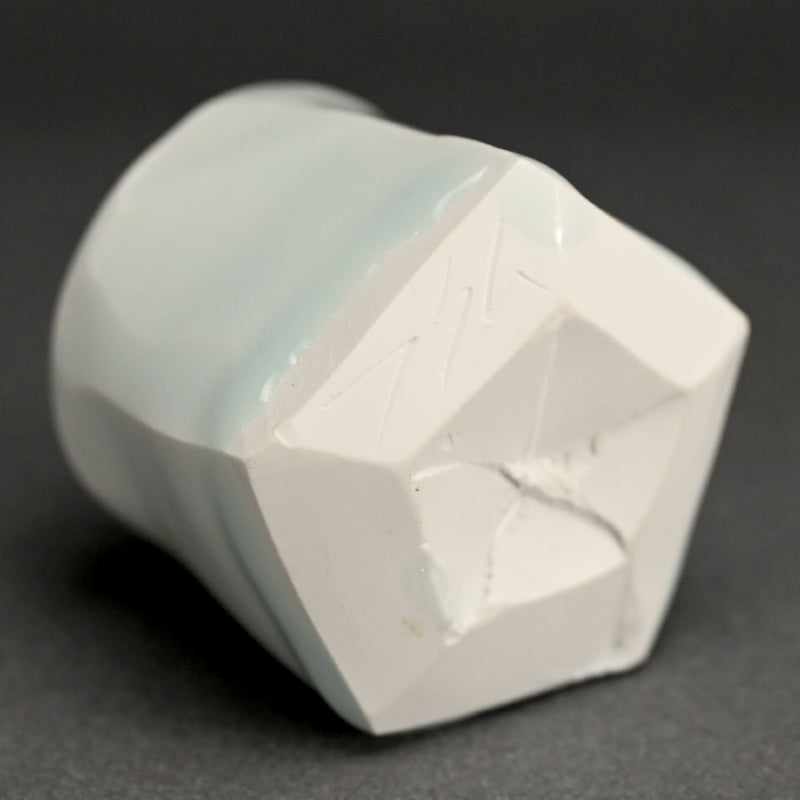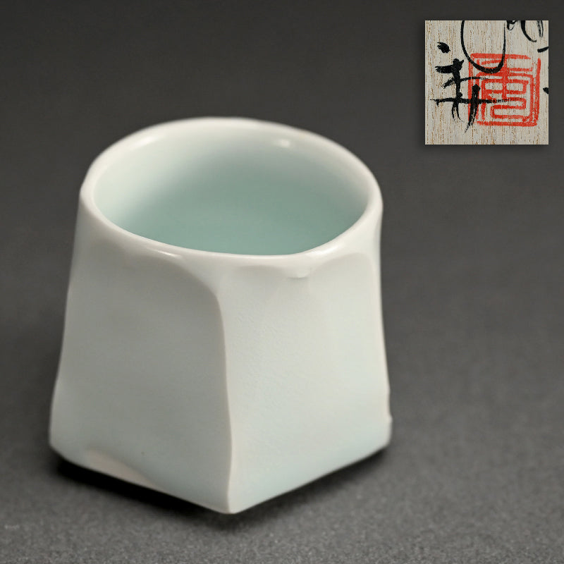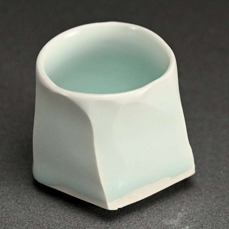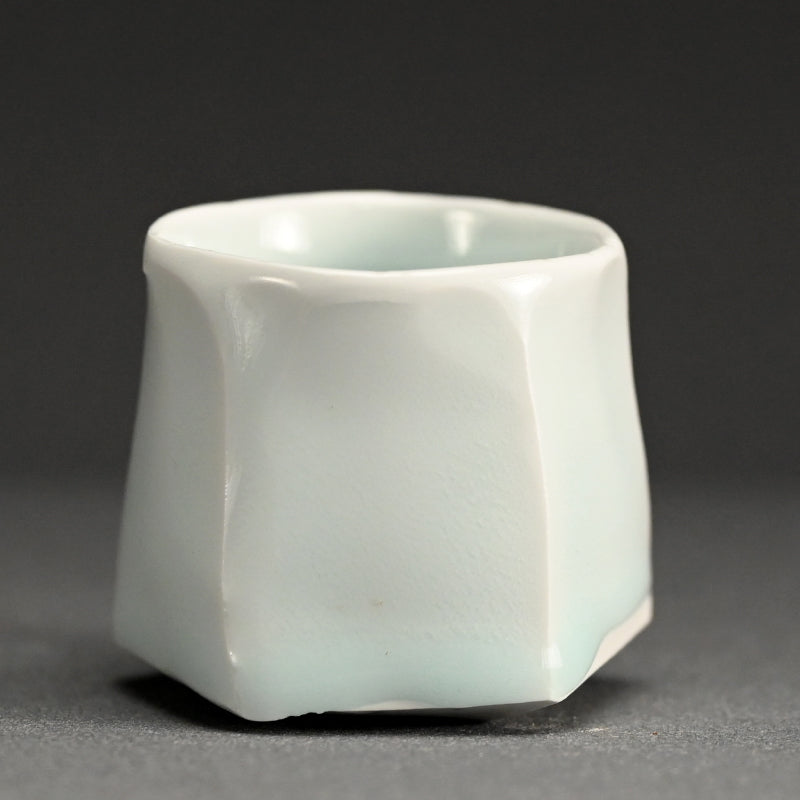 An elegant cup the color of pale ice, thick and pentagonal at the base rising to a thin, circular rim by Kato Tsubusa enclosed in the original signed wooden box. It is 5.5 cm diameter (just more than 2 inches), the same height and in perfect condition, directly from the artist.