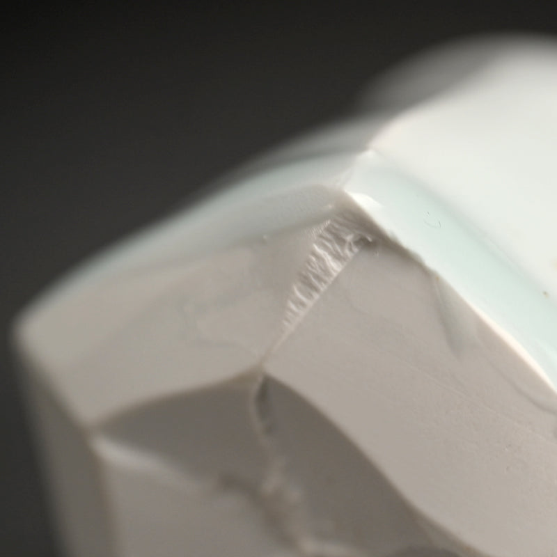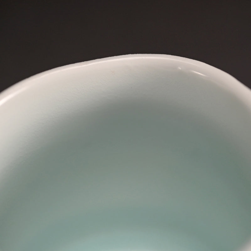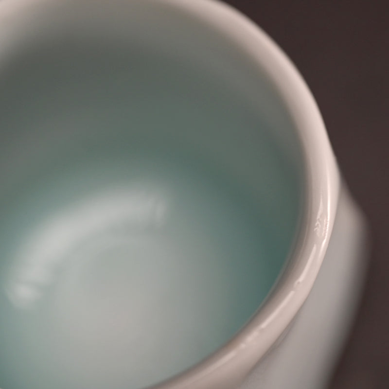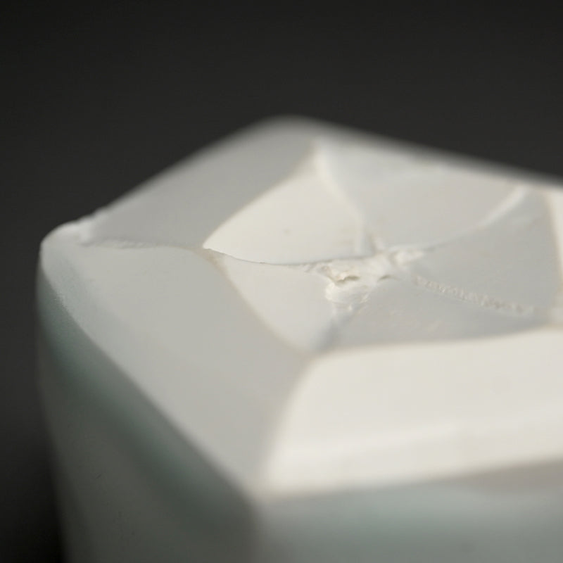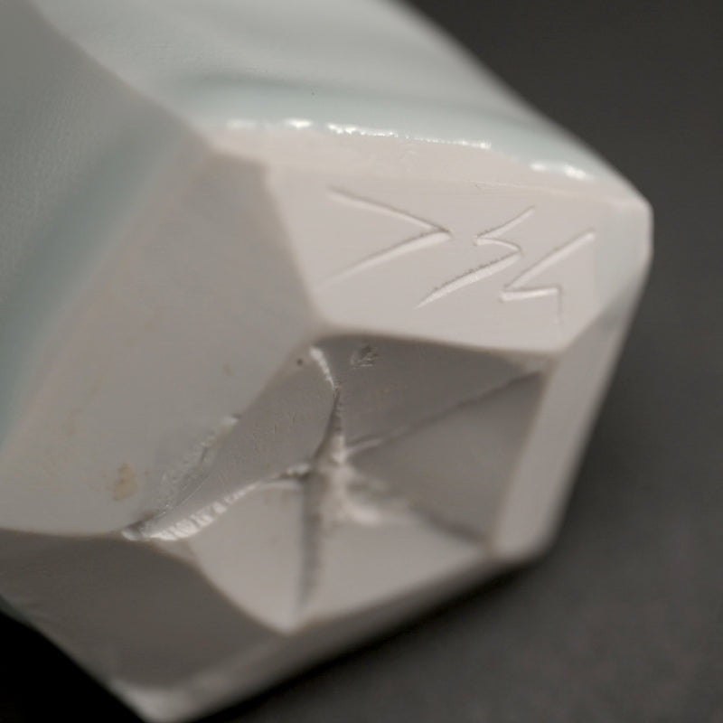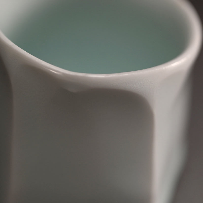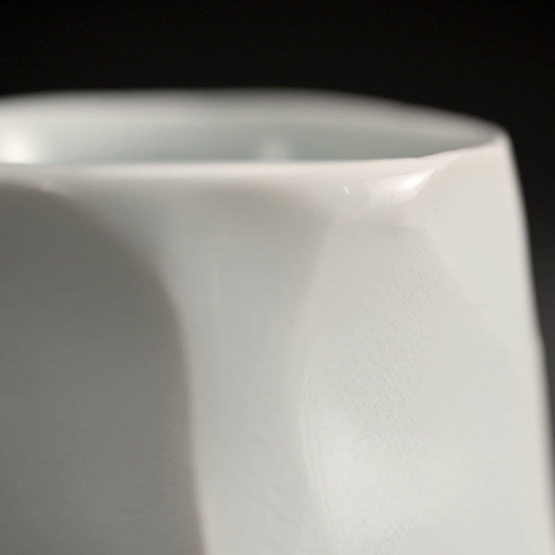 An elegant cup the color of pale ice, thick and pentagonal at the base rising to a thin, circular rim by Kato Tsubusa enclosed in the original signed wooden box. It is 5.5 cm diameter (just more than 2 inches), the same height and in perfect condition, directly from the artist.