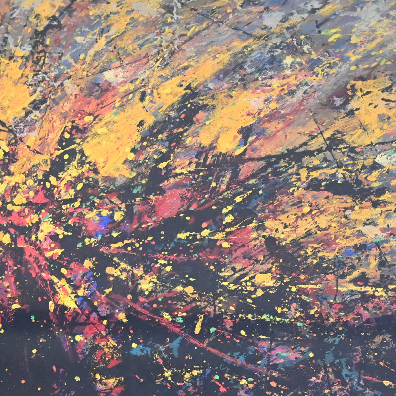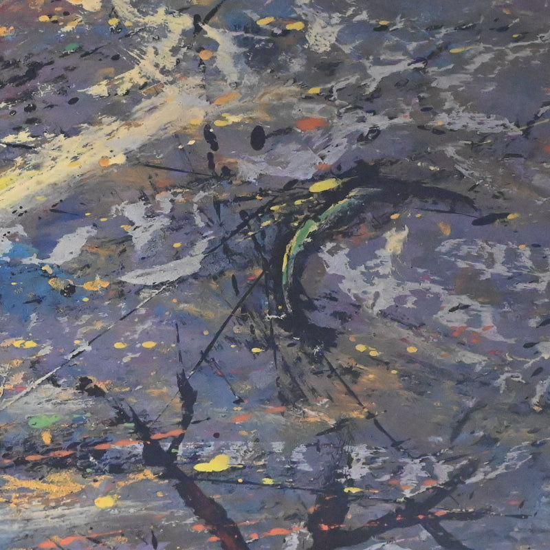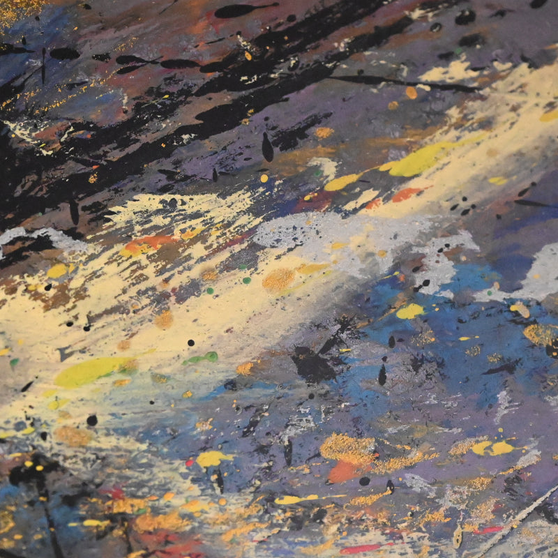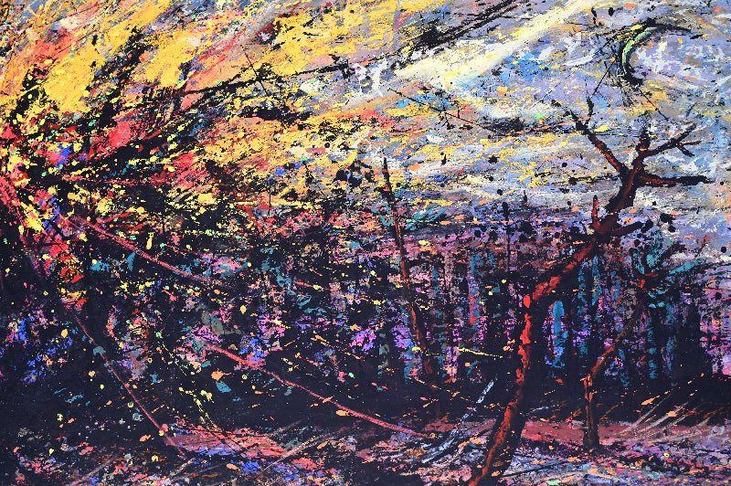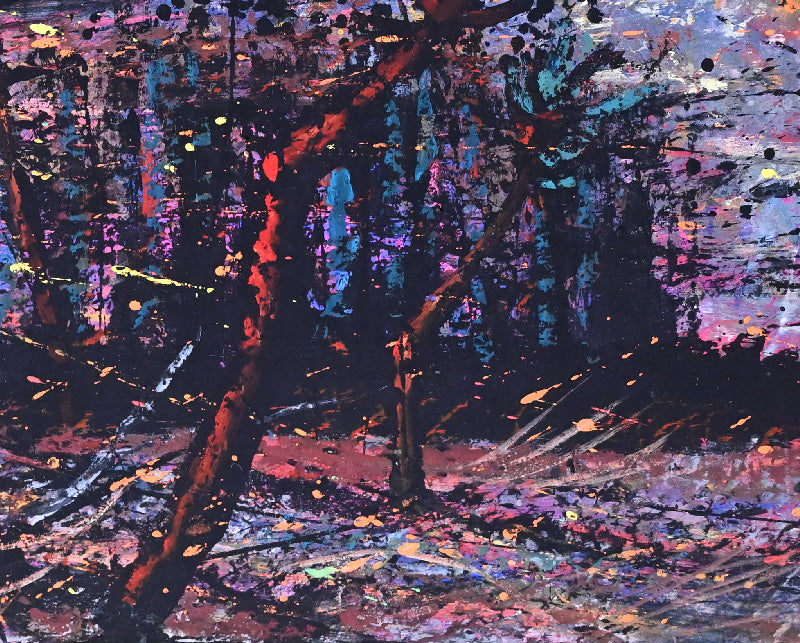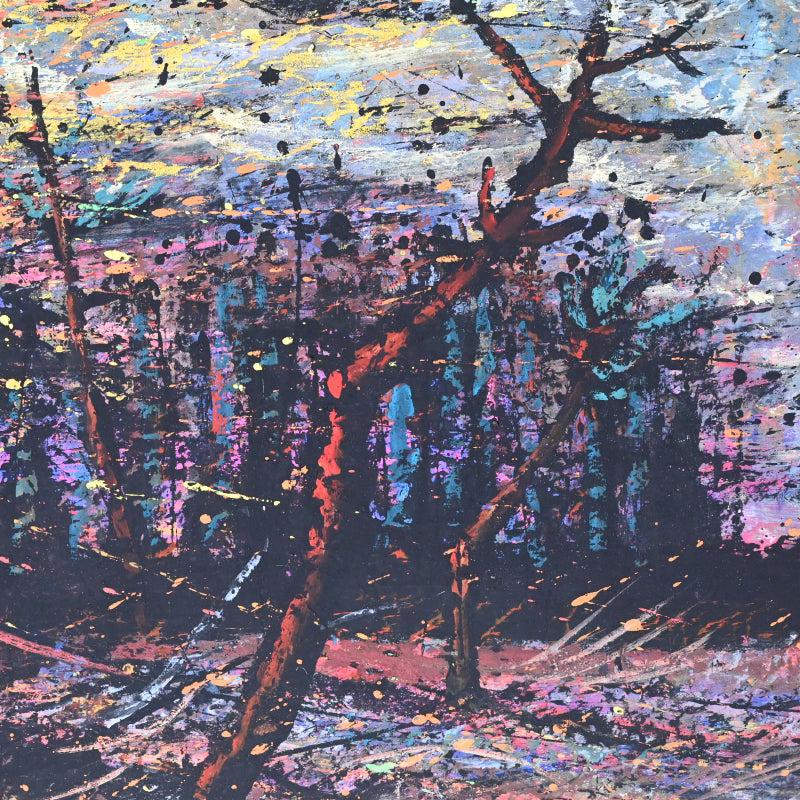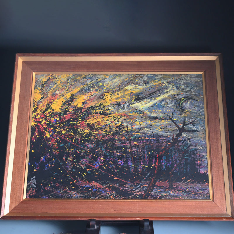 A frantic image of sunlight breaking through the trees, rushing toward a crescent moon hanging low in the sky by Nomura Seiroku mounted in the original wooden frame signed and titled on the reverse. The frame is 74.x 59 x 4.5 cm (29 x 23-1/4 x 1-1/2 inches). The image size is 46.5 x 62 cm (18-1/4 x 24-1/2 inches).