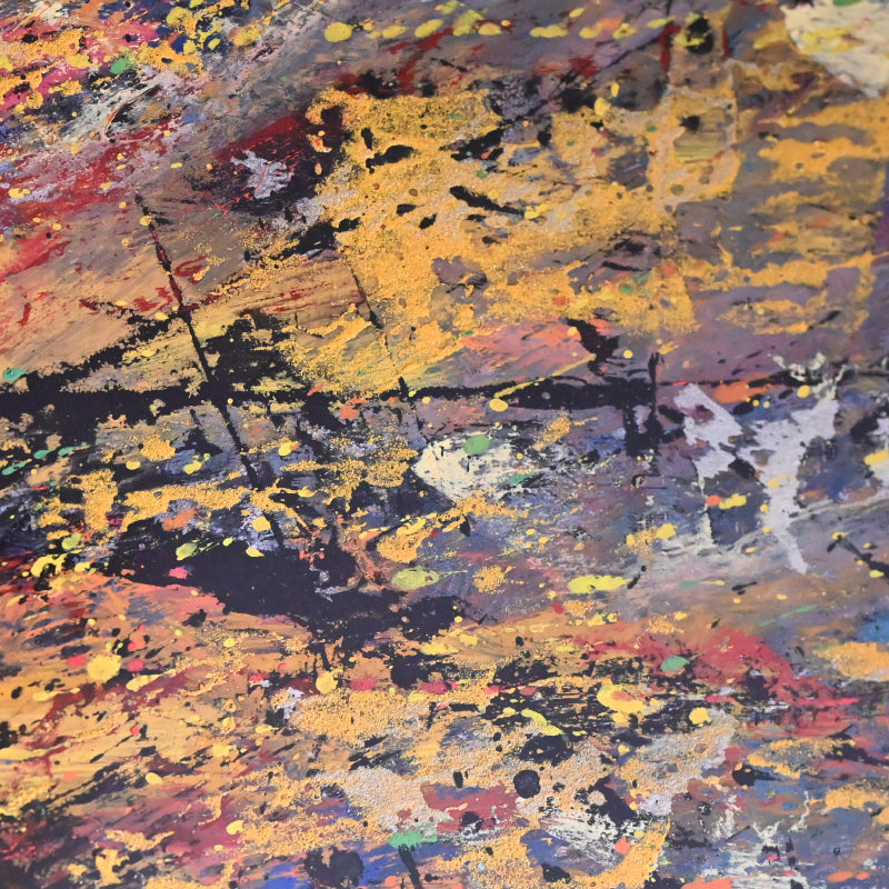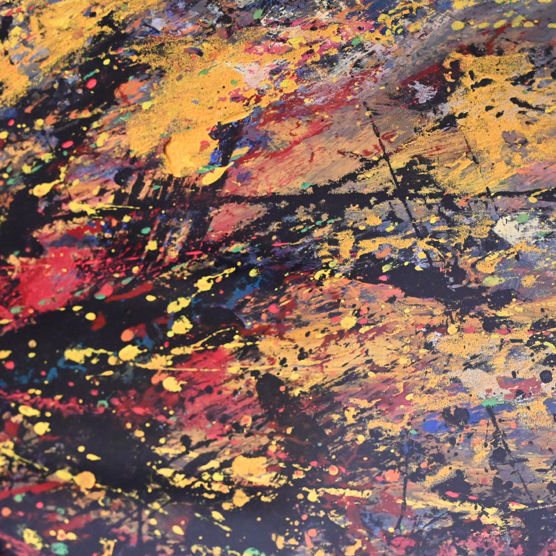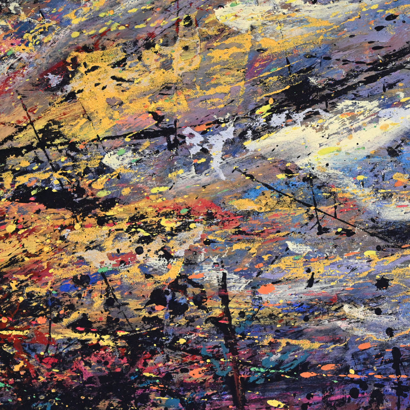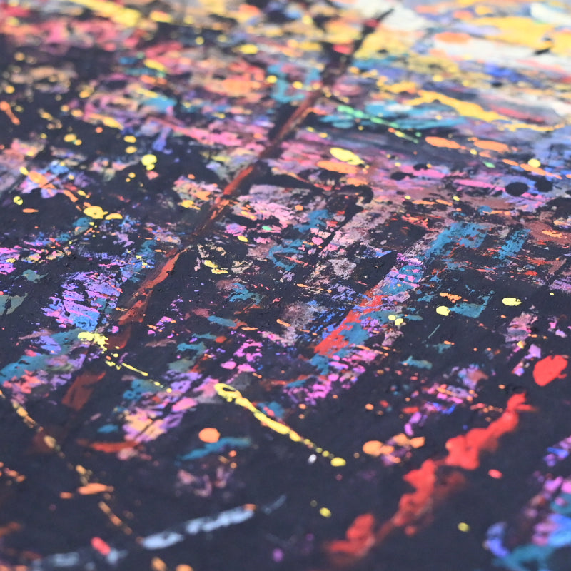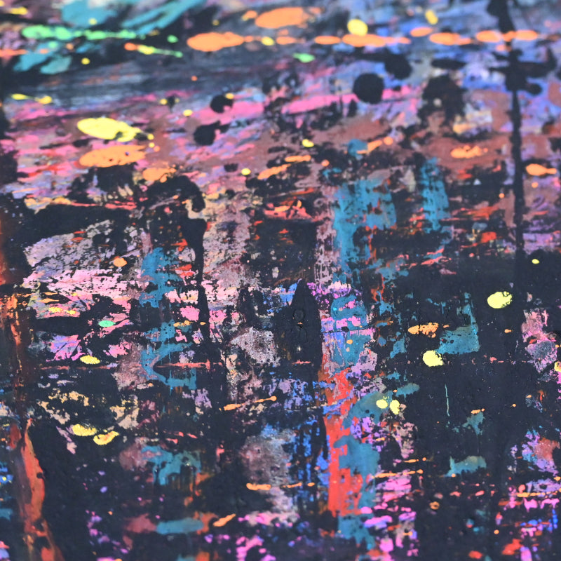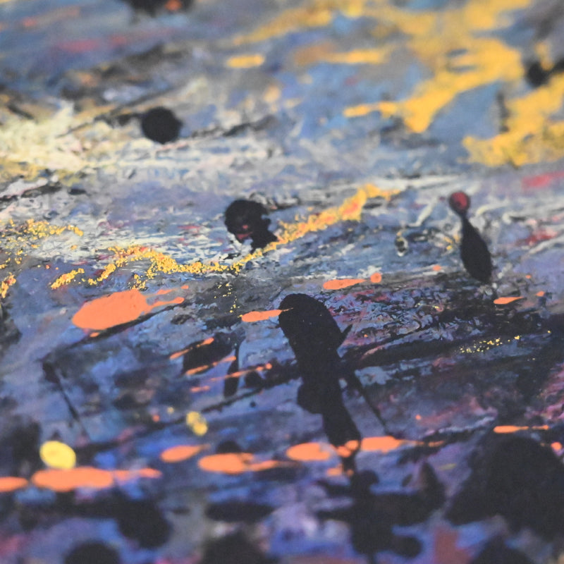 A frantic image of sunlight breaking through the trees, rushing toward a crescent moon hanging low in the sky by Nomura Seiroku mounted in the original wooden frame signed and titled on the reverse. The frame is 74.x 59 x 4.5 cm (29 x 23-1/4 x 1-1/2 inches). The image size is 46.5 x 62 cm (18-1/4 x 24-1/2 inches).
