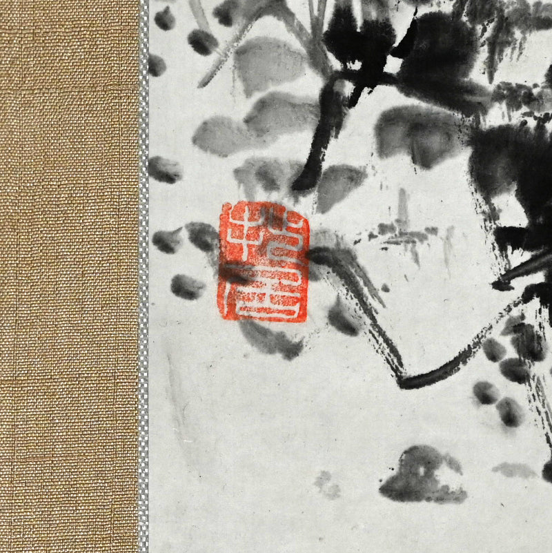 Fukuda Kodojin (1865-1944) an eccentric self taught artist, his status as a poet, calligrapher and literati artist has reached legendary status. Born at a time of great change (4 years before the final fall of the Edo Government), he lived through the westernization of Meiji, Taisho Democracy, the rise of Imperialism and final defeat of the Showa eras. He was self taught, part of a small group of artists existing outside conventional circles in pre-war Japan. He moved to a village outside of Kyoto in 1901, where he supported himself and his family by privately tutoring those who wished to learn Chinese-style poetry. Kodojin was simply a scholar. His poetry, painting, and calligraphy all stem from a life-long cultivation of the mind. He was known to have taken the time just before his death to destroy the large portion of his own remaining work, leaving only that which must have met some personal criteria. For more on his life see the book Old Taoist, or Unexplored Avenues of Japanese Painting. Twenty five paintings by the artist formed a private exhibition (from Gitter-Yelen) at the New Orleans Museum of Art in 2000, and he is part of the Hakutakuan collection among many others.