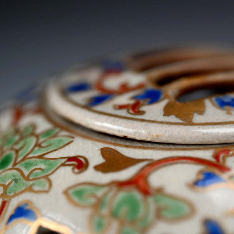 Miyagawa Chozo (1797-1860), also known as Chobei was born a direct descendant of Chokansai and would be the father to Miyagawa (Makuzu) Kozan I (1842-1916). The name Kozan was granted by Prince Yasui-no-Miya in 1851 in honor of the tea ware produced during the later Edo for the imperial Court by this, the tenth-generation head of the Kyoto pottery family, In 1832 at the age of thirty-five, he became apprentice to Aoki Mokubei (1767-1833) and by 35 had established his reputation as a preeminent independent potter. Differing from his master Mokubei (who was most renowned for Sencha ware) Chozo produced almost exclusively ceramics for use with Maccha (Japanese powdered tea ceremony) wares. Many say his most representative works were his Ninsei items, incense containers being particularly renowned. For more on this artist see Master Potter of Meiji Japan, Makuzu Kozan. The Kozan (Makuzu) kiln as we know it today was established in Yokohama in 1871 by the 11th generation head of the family where he reinvented the family business. He immediately set out on a journey which would propel the Kozan name to International Celebrity status, and send his wares throughout the globe. Pieces produced there were marked Kozan, or Makuzu, the official kiln name, or both. The kiln was commissioned for works to be presented to the Prince of Wales, the 25th wedding anniversary gift for the Taisho emperor and the Showa Emperors coronation gift. The kiln was destroyed in the bombing of Yokohama in 1945. For more on this illustrious family see Bridging East and West, Japanese Ceramics from the Kozan Studio by Kathleen Emerson-Dell.