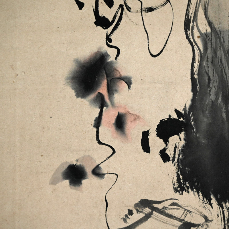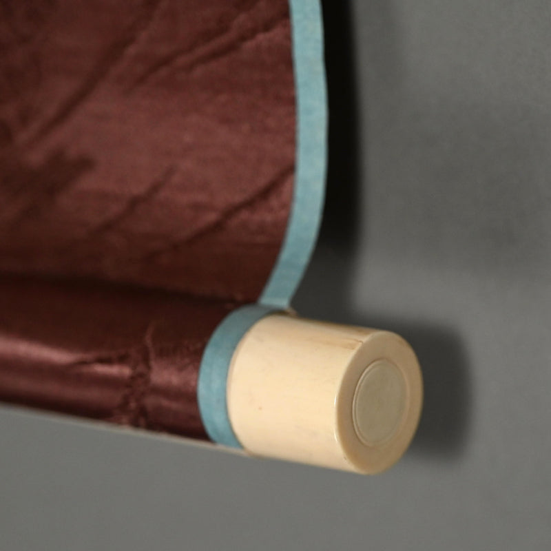 A string of monkeys reach for the reflection of the moon in this quintessential Kano school image by Kano Tenen. Ink on paper in a maroon silk border of carp swimming in ripples with striking blue piping, the scroll features bone rollers. It is 52 x 165 cm (20-1/2 x 65 inches) and in overall fine condition with minor creases. The motif of monkeys reaching for the reflection of the moon (enkō shakugetsu) holds symbolic significance in both traditional Japanese art and Zen Buddhist thought. It is an image rich with metaphor, often serving as a visual parable about illusion, delusion, and the nature of enlightenment. At its heart, the image depicts a monkey trying to grasp the moon’s reflection in water, mistaking the illusion for reality. No matter how hard the monkey tries, the moon cannot be caught—it is merely a reflection. This is used in Zen to illustrate several core teachings: Just as the monkey mistakes the reflection for the real moon, humans are often caught chasing after illusions—desires, attachments, or mistaken understandings of the self. The monkey's desperate attempts are a metaphor for how unenlightened beings suffer due to ignorance and craving. Enlightenment, in contrast, arises through awareness and direct perception—not grasping or clinging. Zen emphasizes the importance of perceiving reality as it is, without being misled by appearances or conceptual thinking. This motif appears frequently in sumi-e ink paintings, hanging scrolls, and illustrated Zen parables. Sometimes, as in this case, a whole group of monkeys form a chain, each grabbing the next in a futile effort to reach the reflection—a humorous but poignant image about society and our communal habits. In art, it blends humor, elegance, and teaching, offering both aesthetic pleasure and spiritual provocation.