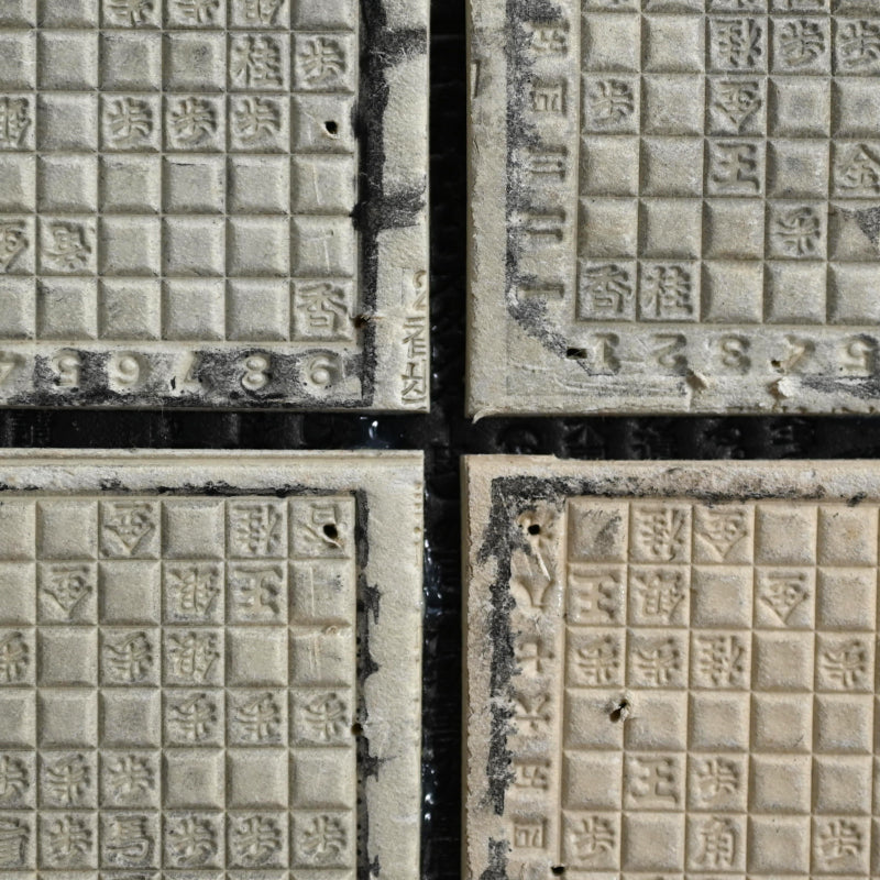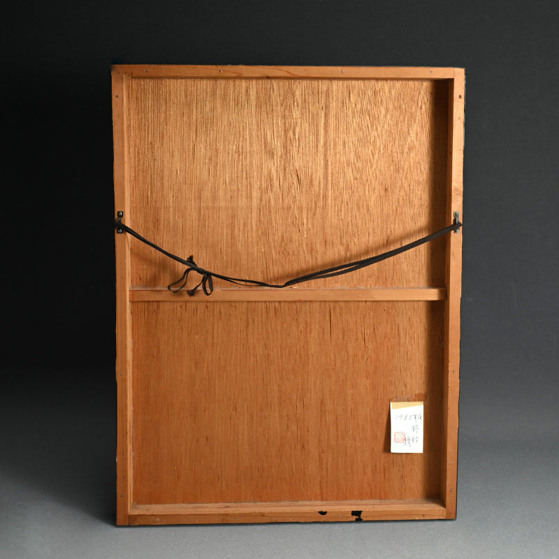 A collage of printing “Flongs” from the Kyoto Shinbun Newspaper by Nomura Ko exhibited at the Osaka Prefectural Modern Art Center in 1999. The work depicts Shogi (Japanese Chess) board moves. These were printed in the newspaper for fans of the game. A flong is a type of paper mold impressed with imagery or newsprint used in the pre-digital printing process which would have been discarded after production. Nomura made use of these as his signature collage base. This work consists of 98 flong paper cards mounted on a wooden panel. It is 60 x 45 x 3.8 cm (24 x 18 x 1-1/4 inches) and is in excellent condition. On back is an original seal dated 1985, signed and stamped by the artist.