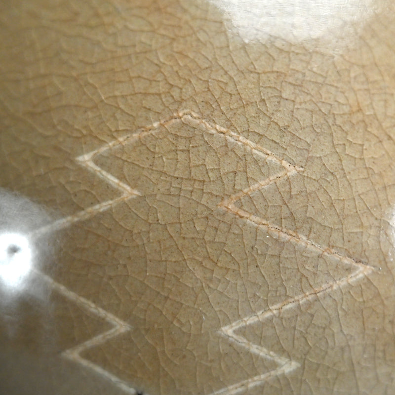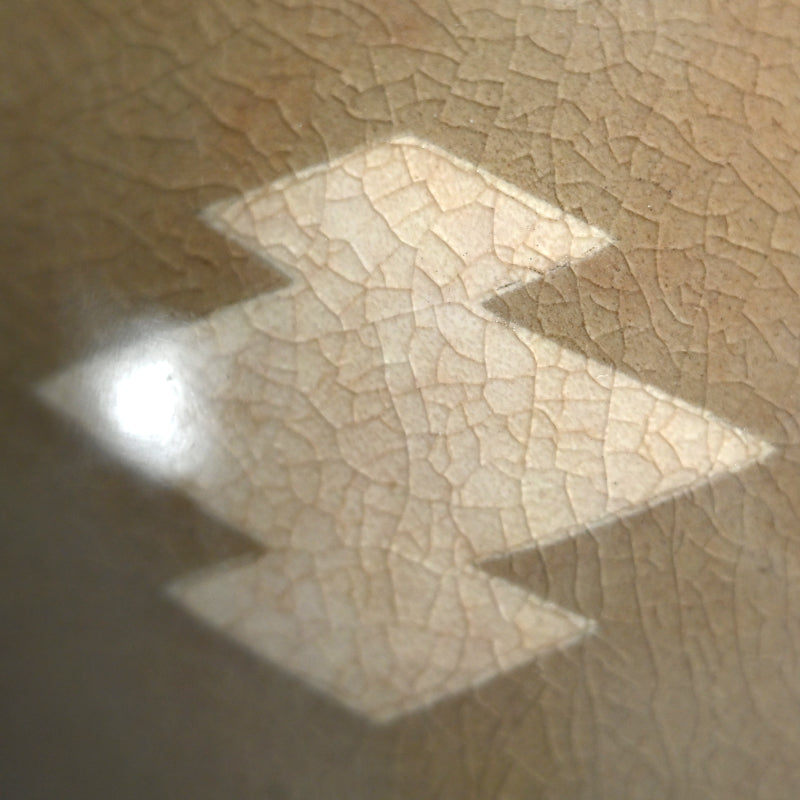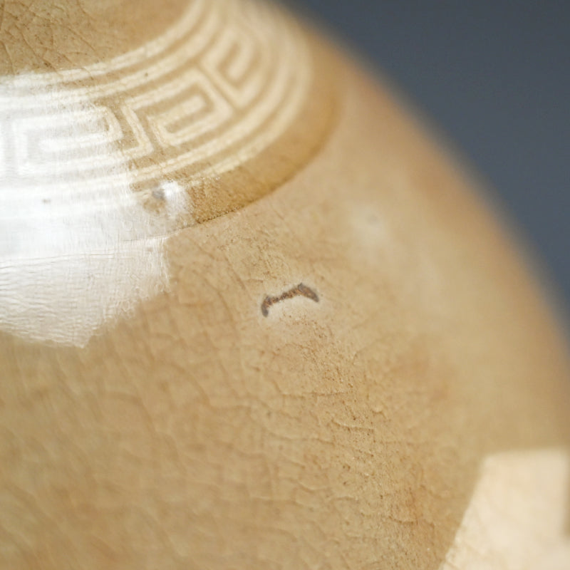 A spectacular vessel undoubtedly made as a gift to visiting Daimyo emblazoned with a lightning heraldic crest and young pines from the private Fushina Kilns belonging to the lords of Shimane prefecture. The bottle is perfectly formed, covered in a stately earthen color with perfect ivory key-fret designs about the neck and the family crest on both sides alternating with pine saplings in black. This is truly a masterpiece from the kilns of a medieval warlord. It is 15 cm (6 inches) diameter, 22 cm (9 inches) tall and in perfect condition.