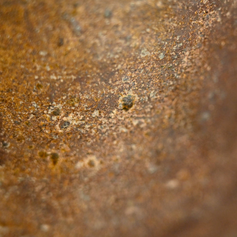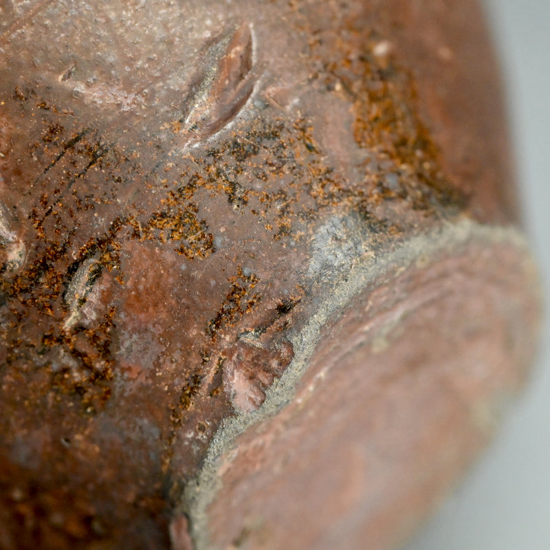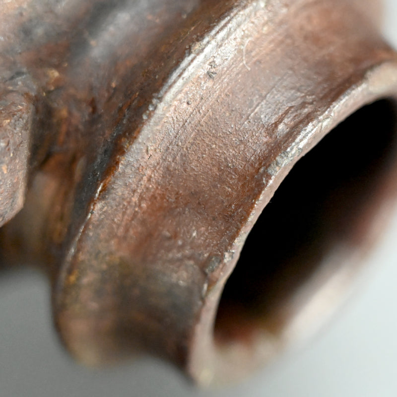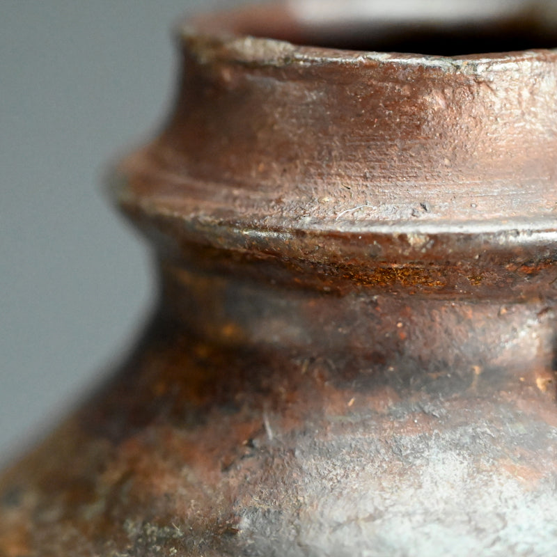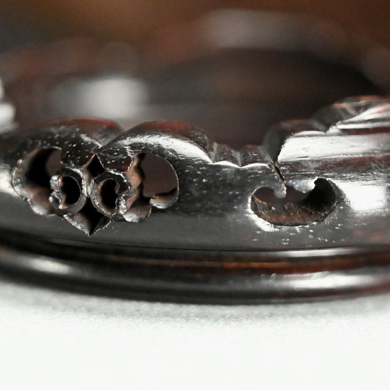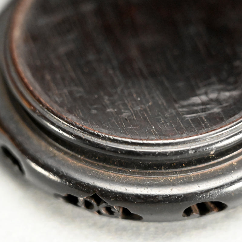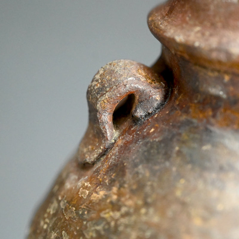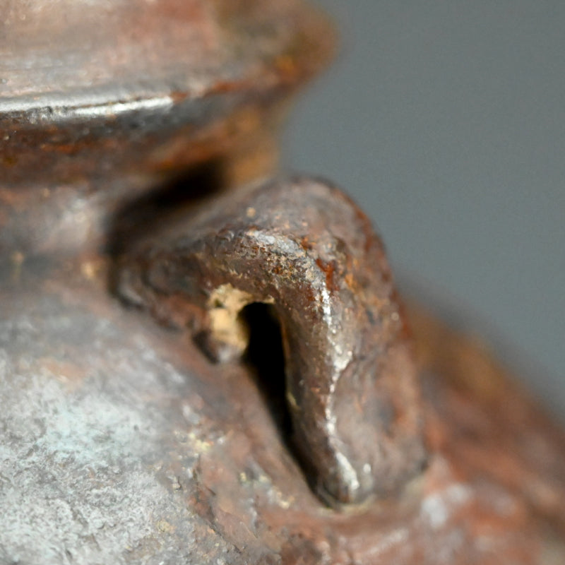 An Irabo colored Brown Glazed two-eared Hanbei Jar on a rosewood stand enclosed in an old wooden collectors box from the Yuan dynasty known in Japan as “Nanban-Chimaki.”. These types of bottles were highly regarded for their rustic simplicity and valued in the Japanese Matcha Tea Room. Production of these jars began in the Northern Song dynasty (10th century). They became popularized as liquor bottles and later, due to its portability, it was adopted as a military water bottle. They have been excavated across East Asia, having been carried overseas by the military. However, this piece is older, featuring a generous amount of glaze. The deep glaze color and natural kiln flaws imbue it with a profound atmosphere and rustic elegance. Having served as a flower vase over the years, the overall appearance of this vessel is deeply lustrous. It is 32 cm tall plus the rosewood base and is in good condition overall.