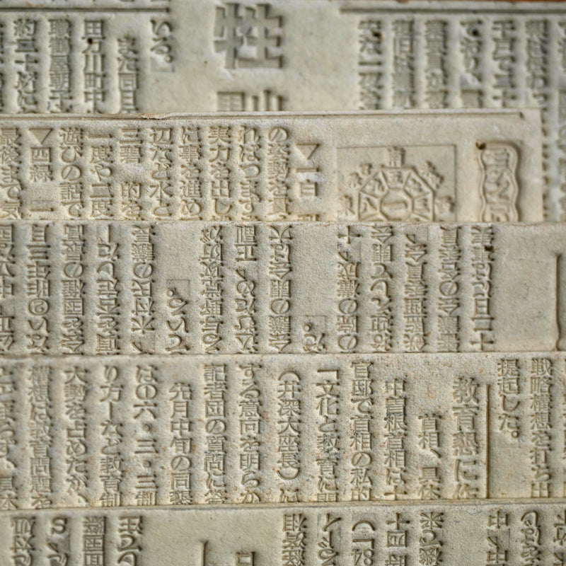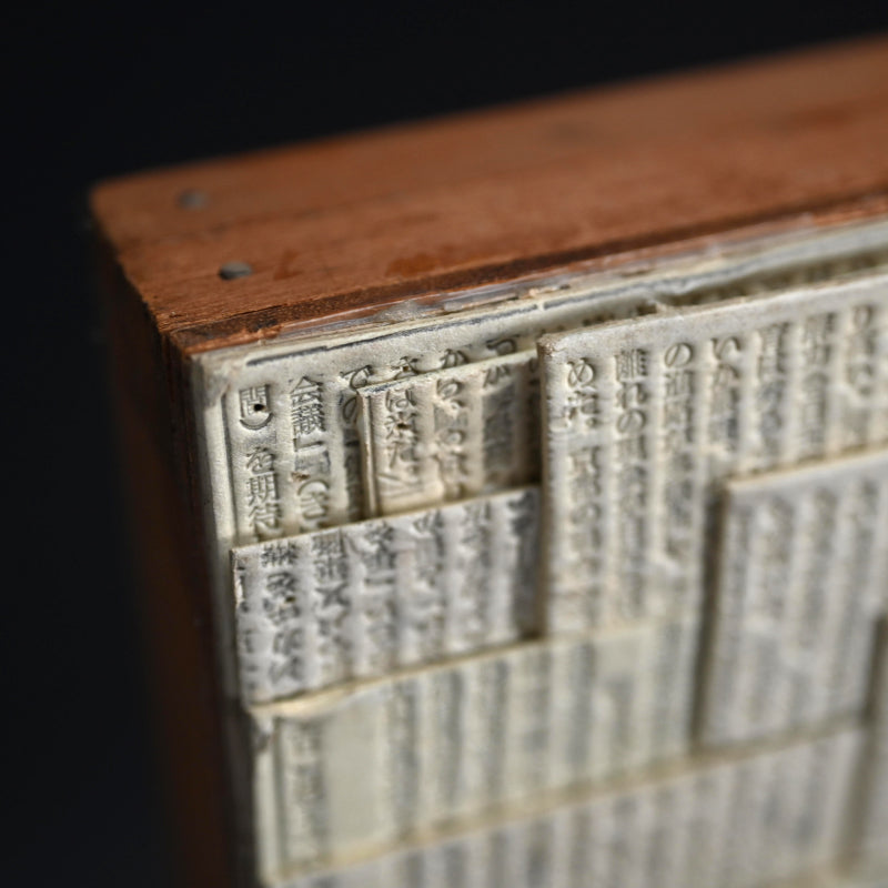 A collage by important post war avant garde artist Nomura Ko made up of his signature Newspaper Printing Flongs from the Kyoto Newspaper column “Bongo”. A flong is a type of paper mold impressed with the newsprint used in the pre-digital printing process which would have been discarded after production. This particular work incorporates about 100 flongs from the Bongo column, truly capturing the time in which it was made which is at the core of the post war surrealist ethos. The Kyoto Shimbun Newspaper’s front-page column “Bongo” is a well-known feature regarded as the “face of the newspaper,” offering commentary on current social events from an original perspective. Because it helps develop vocabulary and refined expression, it is also popular for copy-writing practice as a learning exercise. It is fondly appreciated as an “ordinary” yet reflective voice that mirrors the times. The collage is mounted on a wooden panel, 45.5 x 60.1 x 3.8 (18 x 24 x 1-1/2 inches) and is in excellent condition. It comes with a certificate of authentication by his son Nomura Yukihiro.