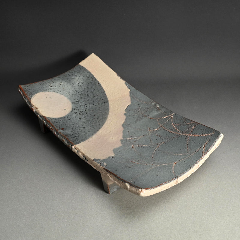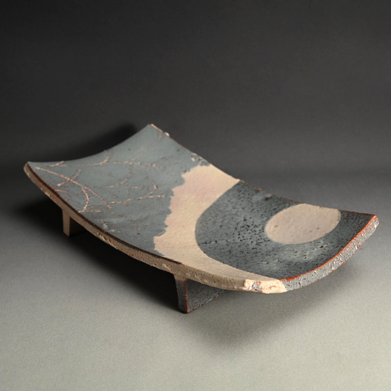 A large platter in mouse gray with abstract white patterns by Wakao Toshisada enclosed in the original signed wooden box titled Nezumi Shino Choban. It is elevated on two feet, measuring 53 x 29 x 10 cm (21 x 11-1/2 x 4 inches) and is in excellent condition.