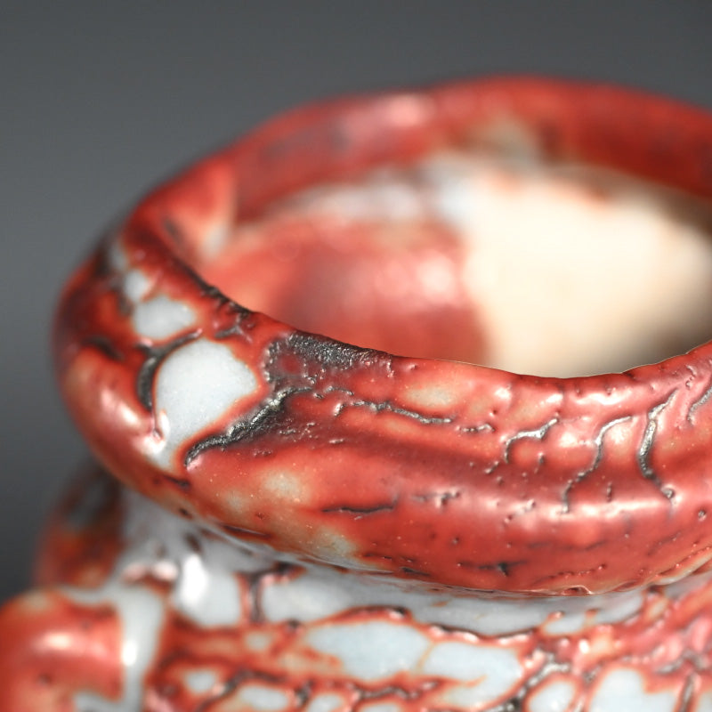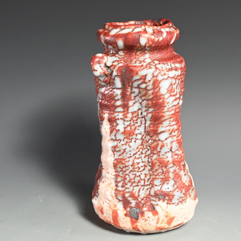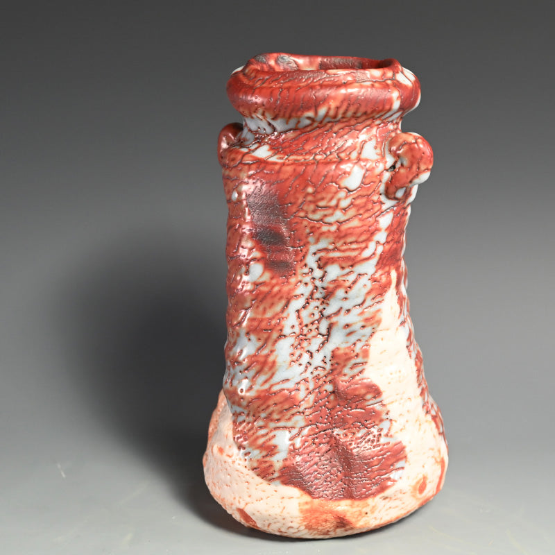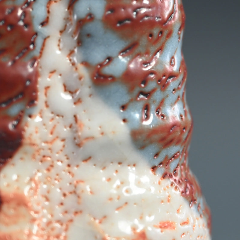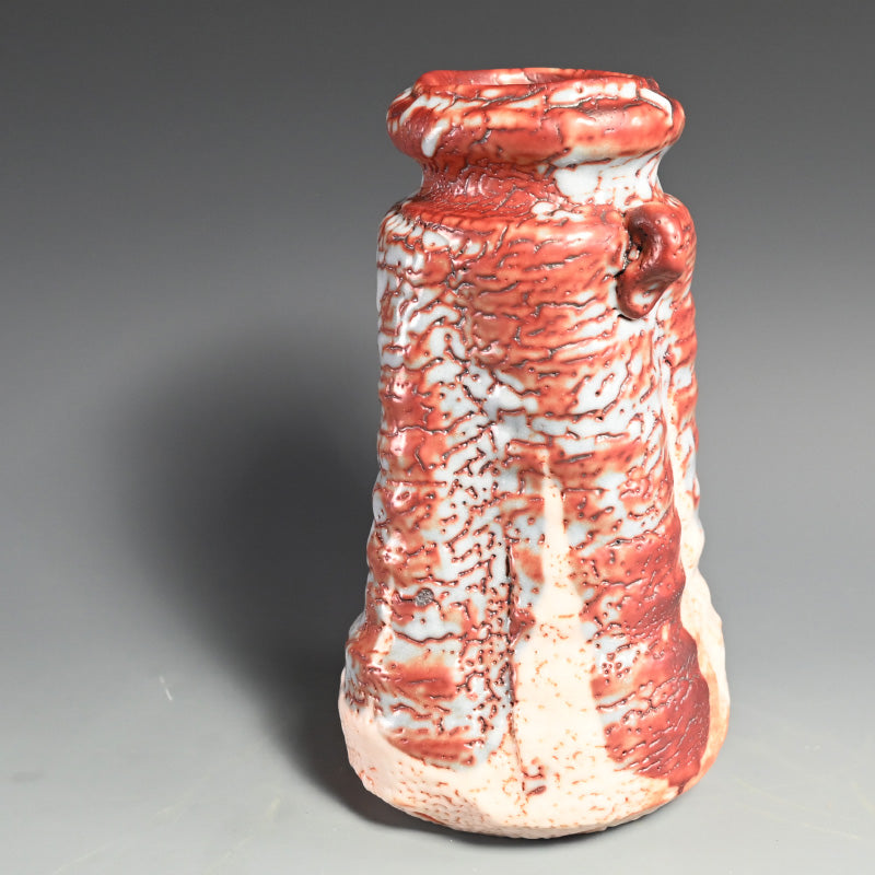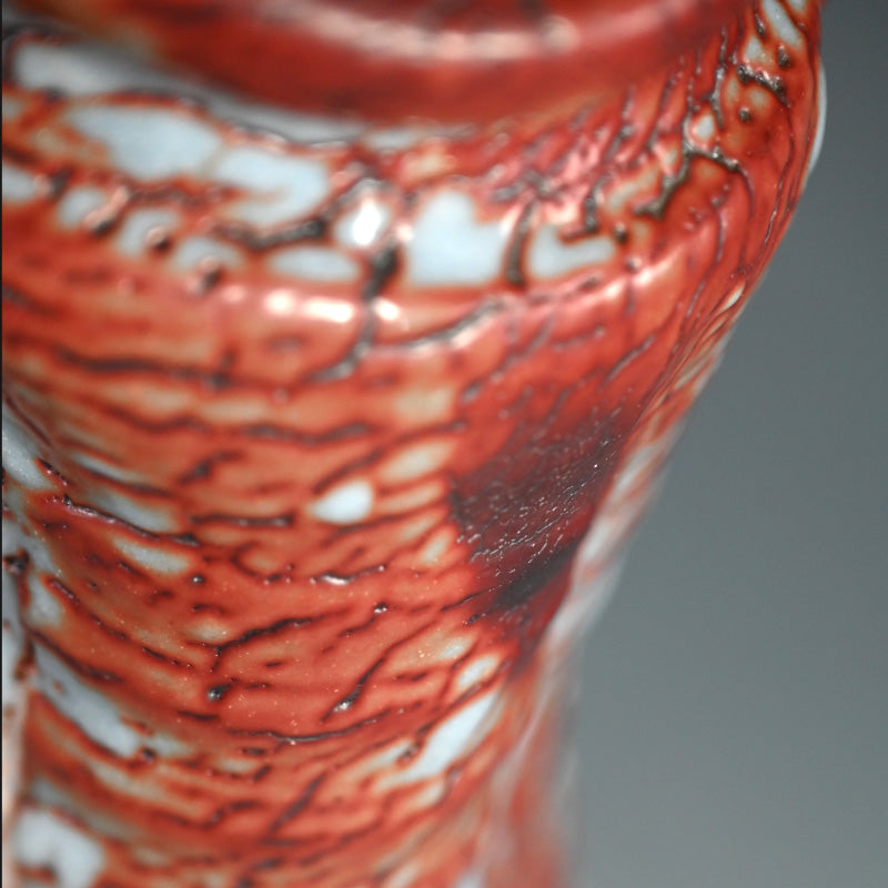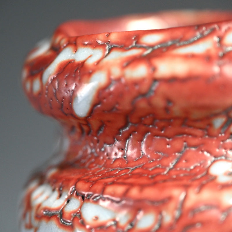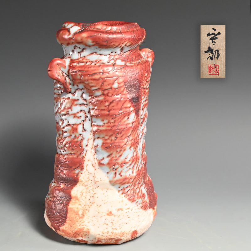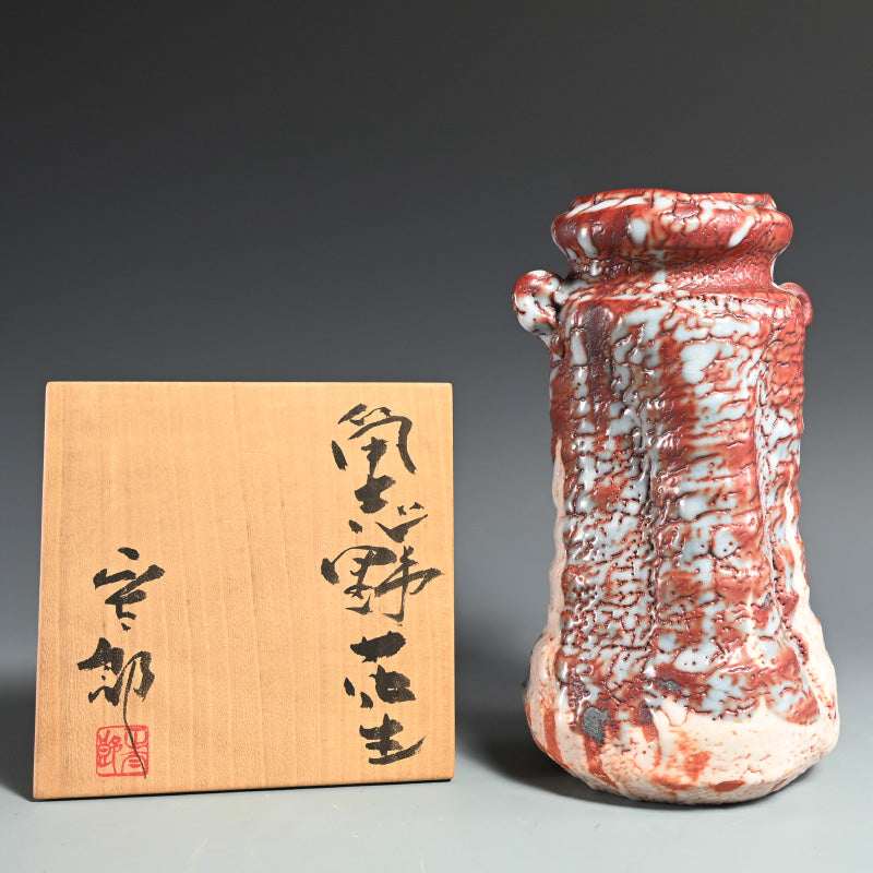 Gray clouds over vivid flame red draped over thick white glaze on this igneous work by Hayashi Shotaro enclosed in the original signed wooden box titled Nezumi Shino Hana-ike.  It is 27.5 cm (11 inches) tall and in excellent condition.