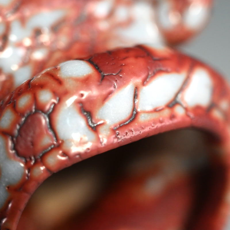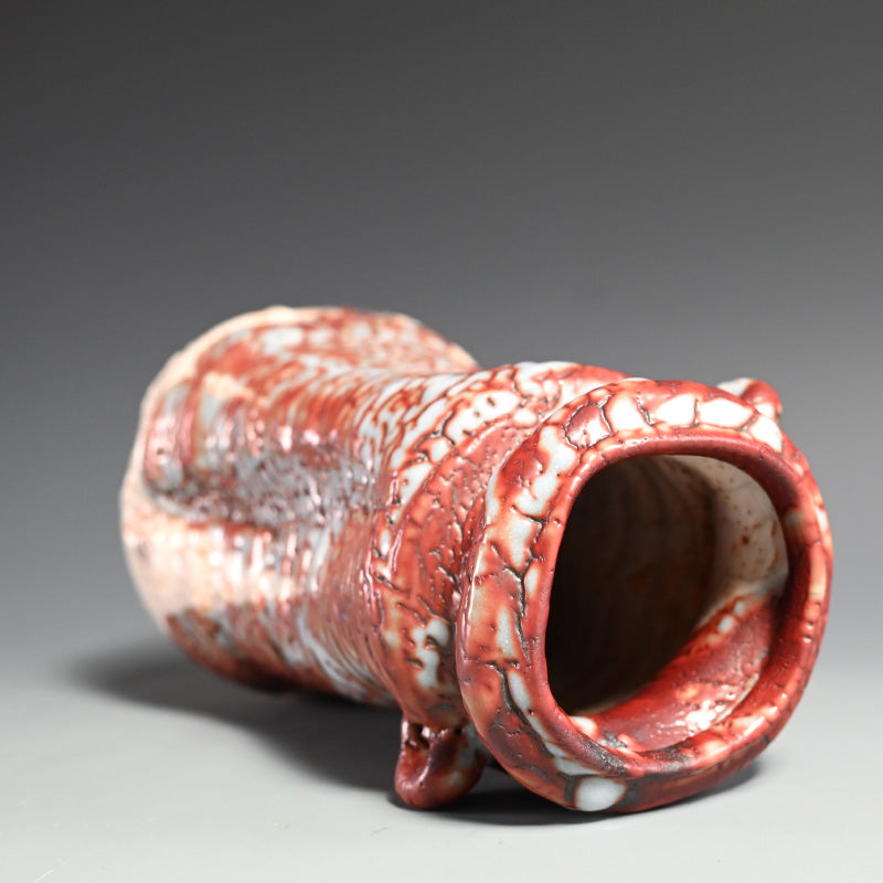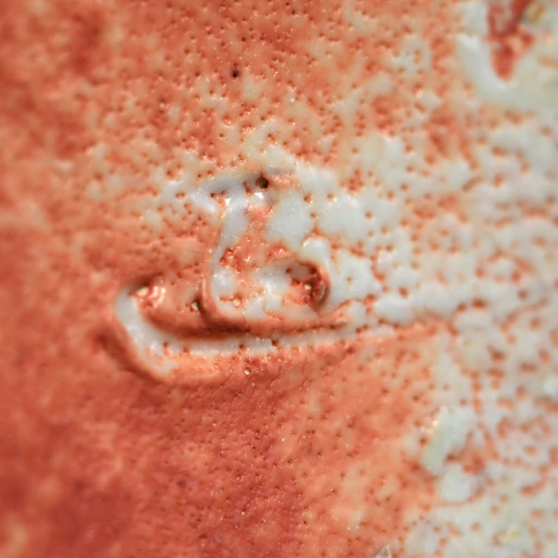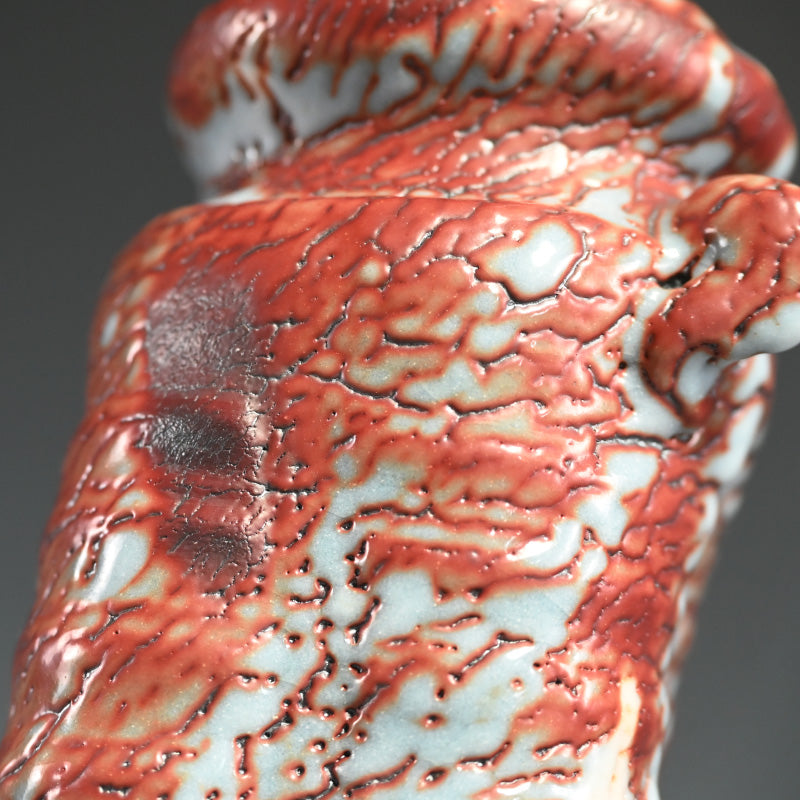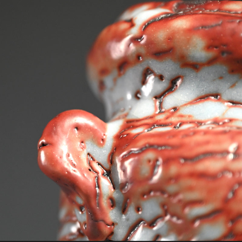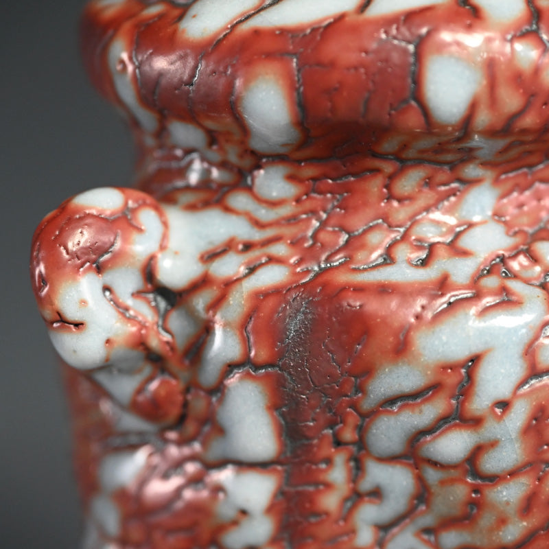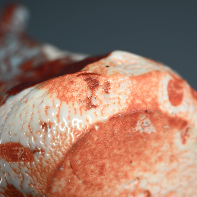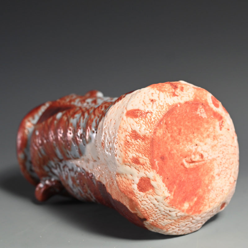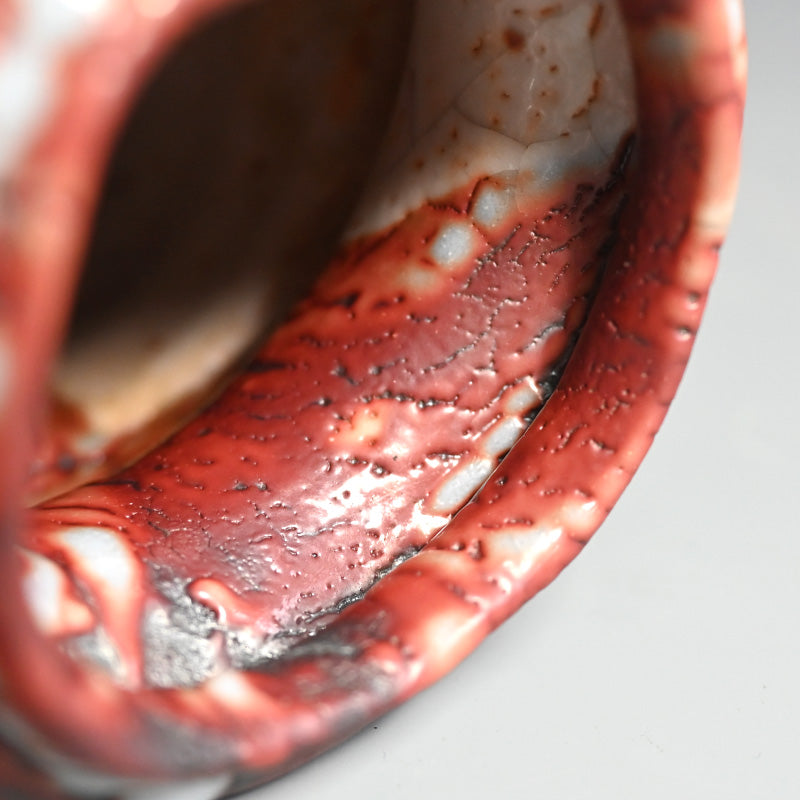Gray clouds over vivid flame red draped over thick white glaze on this igneous work by Hayashi Shotaro enclosed in the original signed wooden box titled Nezumi Shino Hana-ike.  It is 27.5 cm (11 inches) tall and in excellent condition.