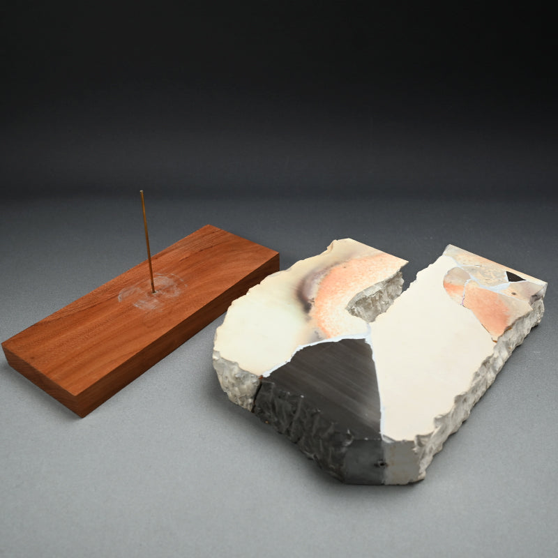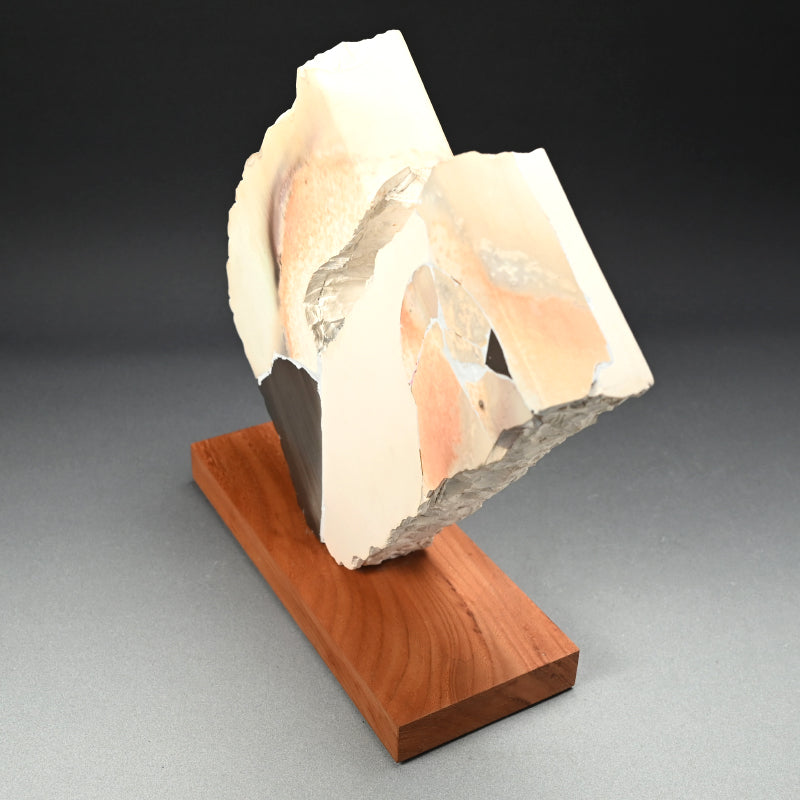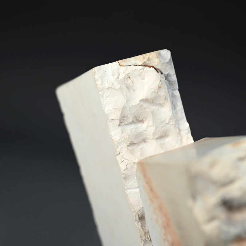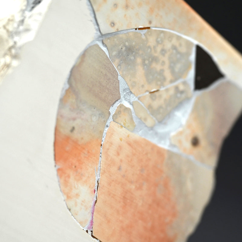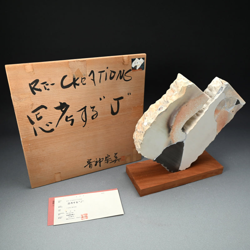 An off-balance J assembled from moon-colored shards by Yorigami Munemi enclosed in the original signed wooden box titled Re-Creations, Shiko Suru J (thought inspiring J). It is 26 x 34 x 6.5 cm (10-1/4 x 13-1/2 x 2-1/2 inches) excluding the wooden stand and is in excellent condition.