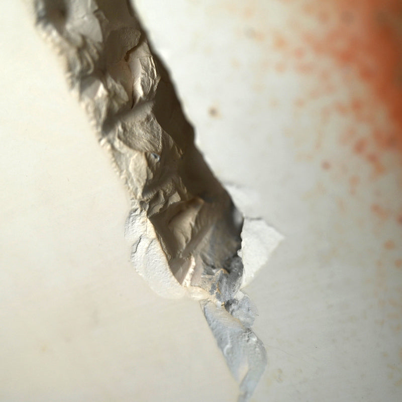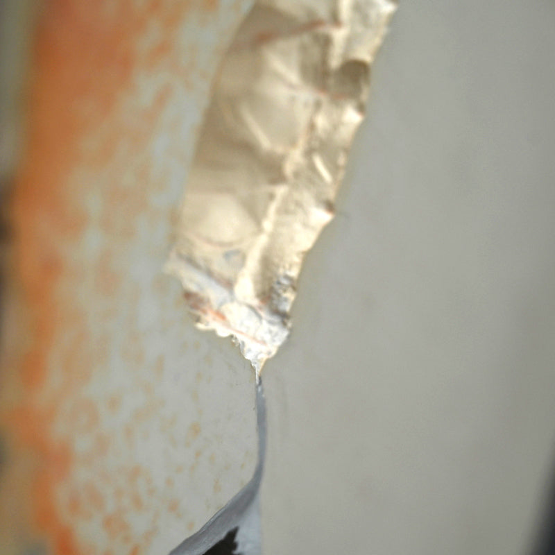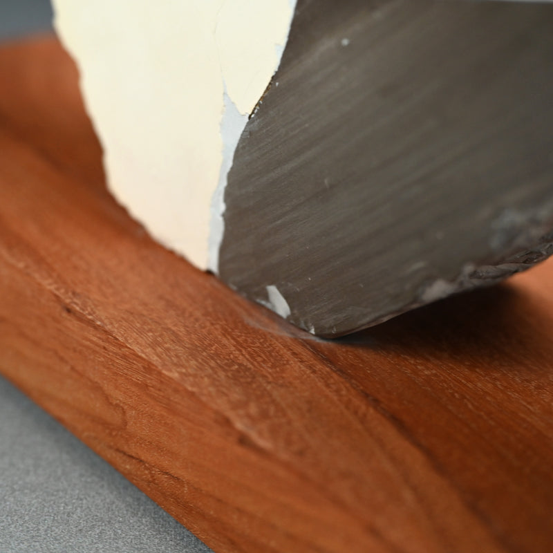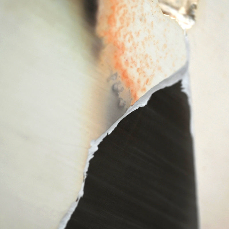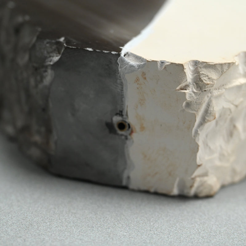 An off-balance J assembled from moon-colored shards by Yorigami Munemi enclosed in the original signed wooden box titled Re-Creations, Shiko Suru J (thought inspiring J). It is 26 x 34 x 6.5 cm (10-1/4 x 13-1/2 x 2-1/2 inches) excluding the wooden stand and is in excellent condition.