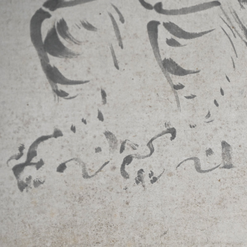 Long verses fall like rain upon the sinister figure of an Oni (type of devil) dressed in the habit of a priest who glares as he walks through the village, banging out a warning to all evil-doers. Around his neck hangs a bell which he clangs loudly with the hammer held high in one hand. The stern figure carries in the other hand a booklet titled Hogacho. A Hogacho is a record of the name and quantity of persons who donated (hoga) for projects such as the construction and repair of temples or shrines and the publication of scriptures. In the case of the Oni, his Hogacho records the sins and misdeeds of humans for payment in the after world. On his back is an umbrella. Ink on paper in a simple brown cloth border with highlights of Kinran gold in the Ichimonji above and below with dark lacquered wooden rollers like the shift of a priest moving to reveal the regal robes beneath. It is 39.7 x 179 cm (15-1/2 x 70-1/2 inches) and has been completely cleaned and remounted.