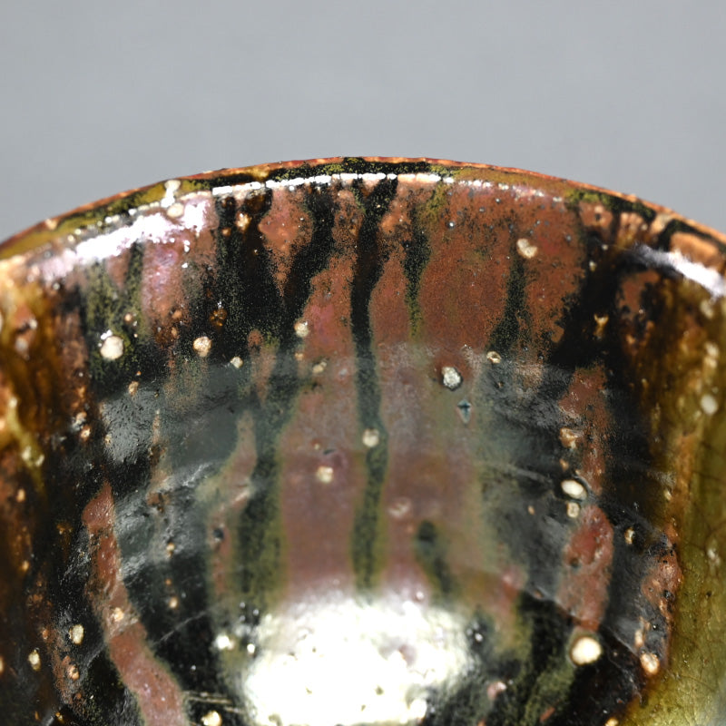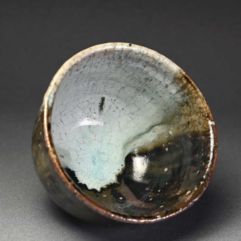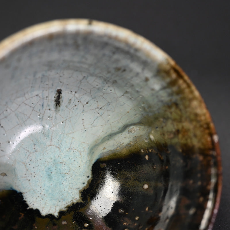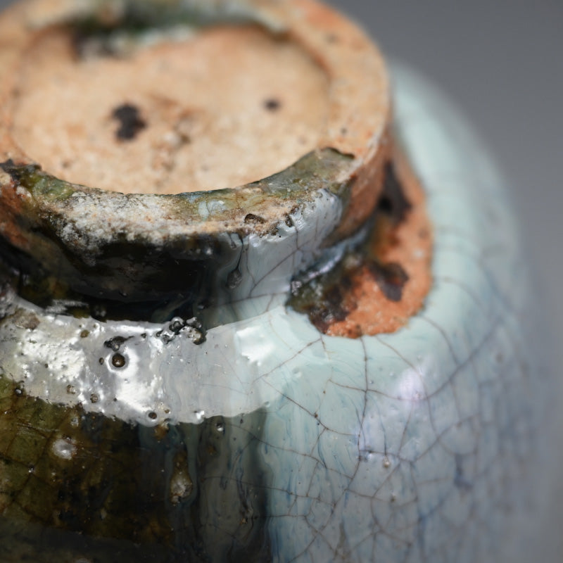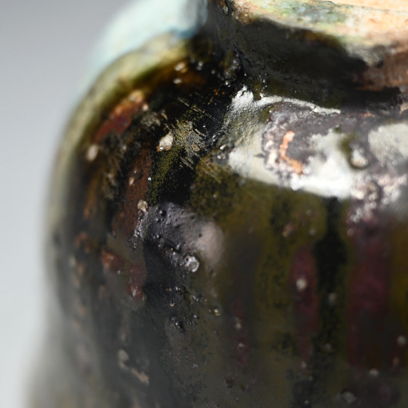 Ohmae Satoru was born in Osaka in 1972. He began decorating Kenzan style pottery in Kobe in 1991 with his brother. It was in 1994 he began making Nanban style unglazed pottery. His first solo exhibition was held in Osaka in 1999, and he moved to Shigaraki in 2001 where he began working on Iga and Shigaraki style wood-fired pottery and at the same time began holding solo exhibitions nationwide. He built a fully underground anagama kiln in 2003 but became interested in glazed pottery in 2005 and began creating white porcelain and Karatsu ware. In 2007, he was attracted to Korean pottery from the Joseon Dynasty and started experimenting with Ido tea bowls and persimmon calyx tea bowls using anagama kiln firing techniques. After absorbing many styles, he reached a turning point in 2010, when he moved to Awaji Island and built a semi-underground anagama kiln and a raku kiln. He started making black raku ware. In 2016, he began using clay from Awaji Island to make white raku ware.