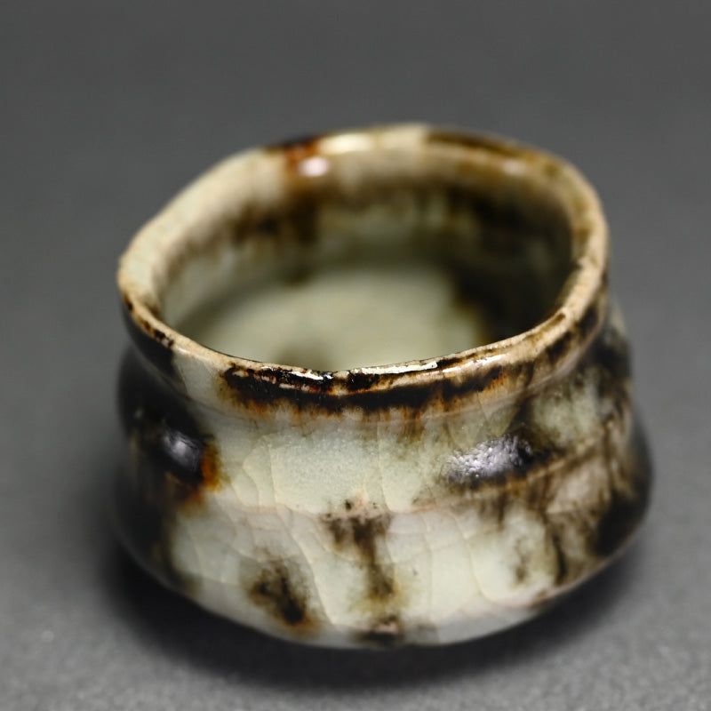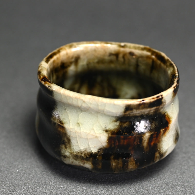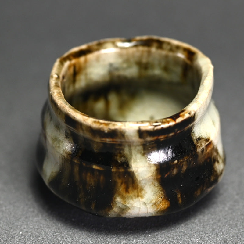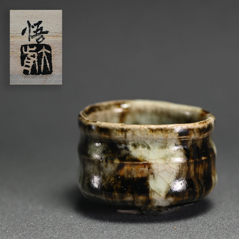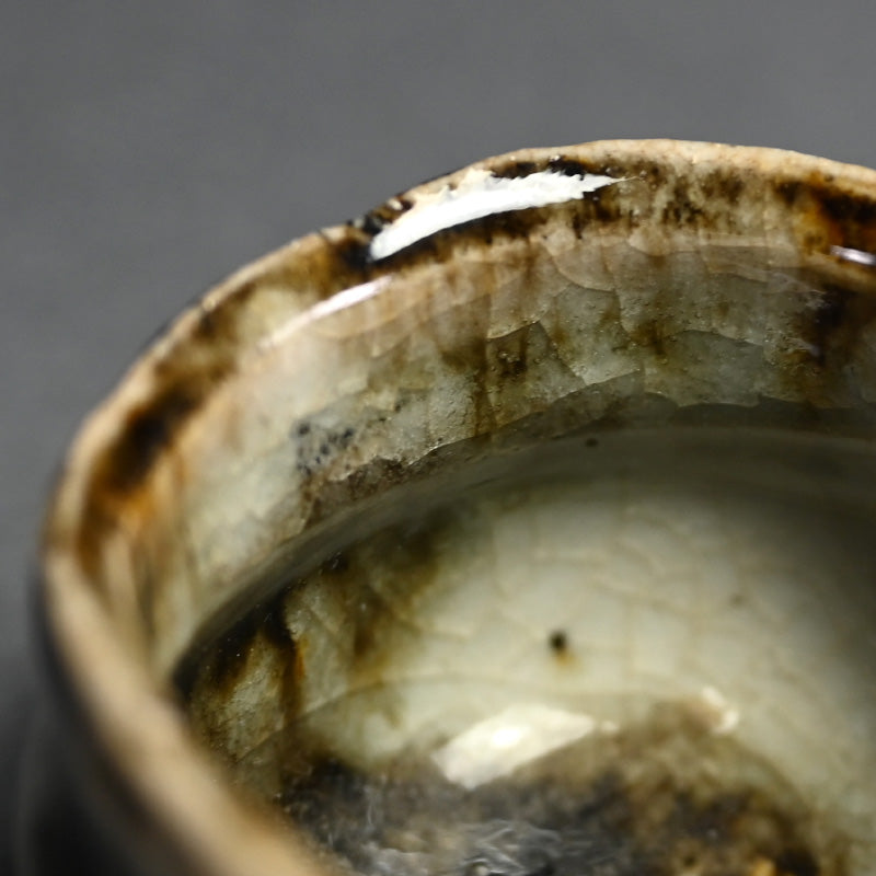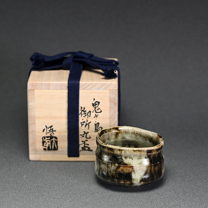 When sharing with friends sake does not need to be quaffed down in big guinomi, but is quite often better when shared with small cups, demanding that, in the Japanese tradition, the drinkers remain aware of their drinking partners cup and constantly re-fill it for each other. This si a beautiful small bowl by Ohmae Satoru enclosed in the original signed wooden box titled Onigashima Gosho-maru Hai. It is 6 cm (2-1/2 inches) diameter, 4 cm (1-1/2 inches) tall and is in perfect condition, directly from the artist this summer.