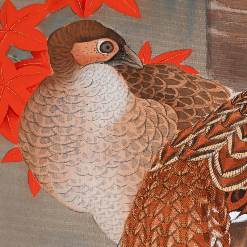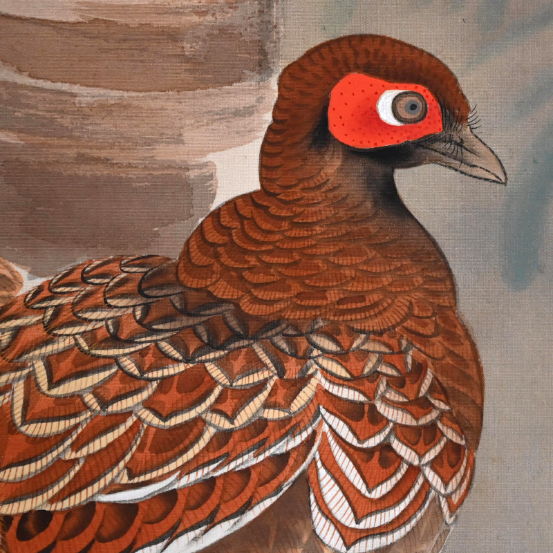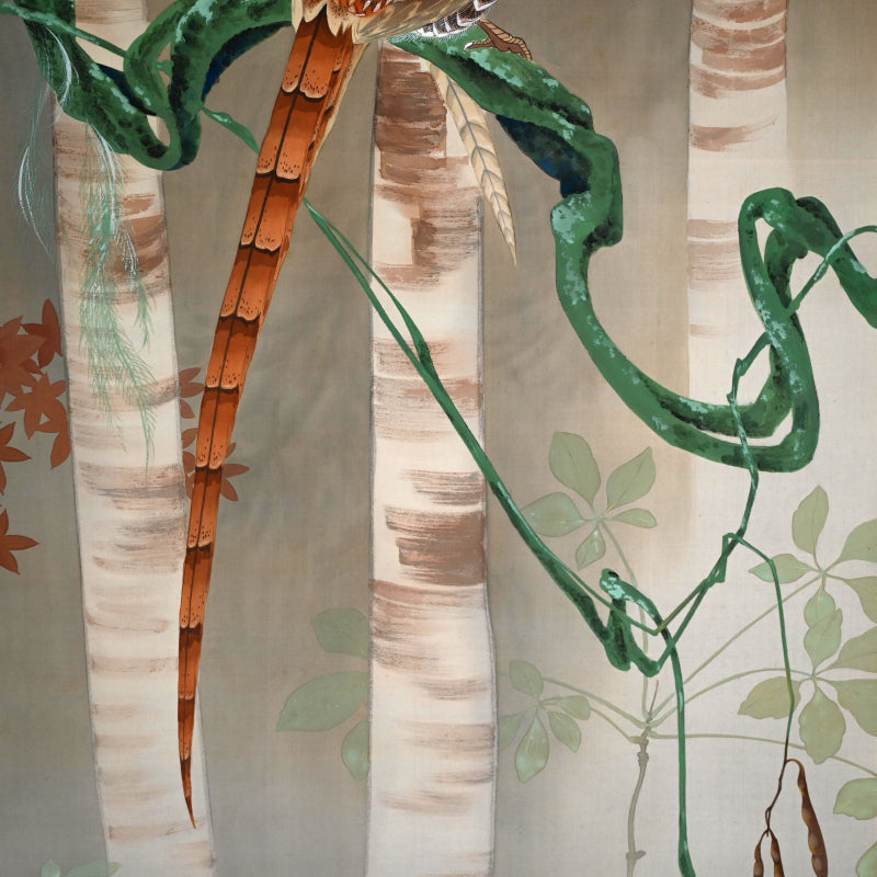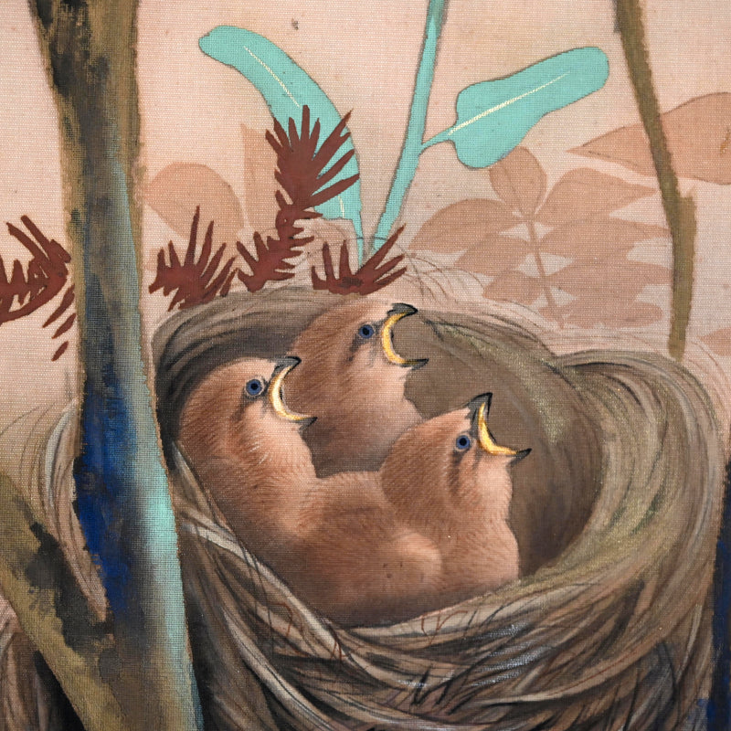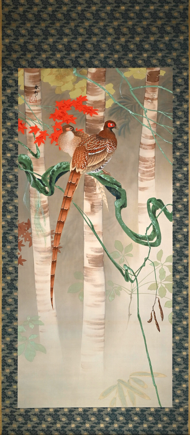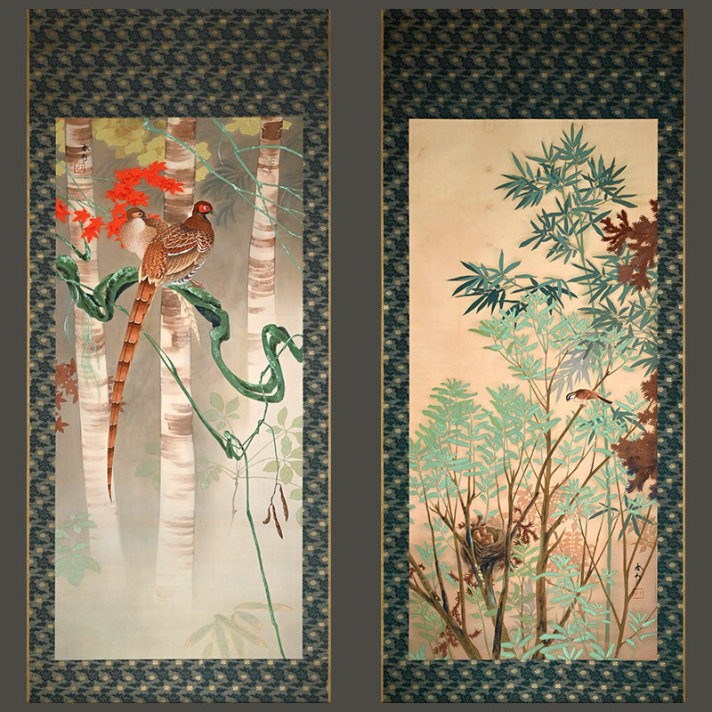 A pair of large silk paintings dating from the Taisho to early Showa periods of forest scenes by Shirayama Shunpo expressing succinctly the aesthetic dominating Japanese painitng from the later Taisho to early Showaeras (1920s). On the left, Kiji (Japaese Pheasent) rest in boughs deep in the forest, while on the right a parent watches over the nest filled with a brood of hungry beaks. Pigment on silk mounted in beautiful blue cloth with large solid ivory rollers (these will be changed if exporting). Each scroll is 87.5 x 201 cm (34-1/2 x 79 inches). There is minor toning typical of age, and one has original (pre-mounting) repairs to the silk which were likely once invisible, but have become apparent with time. It comes enclosed in a custom made kiri-wood box.