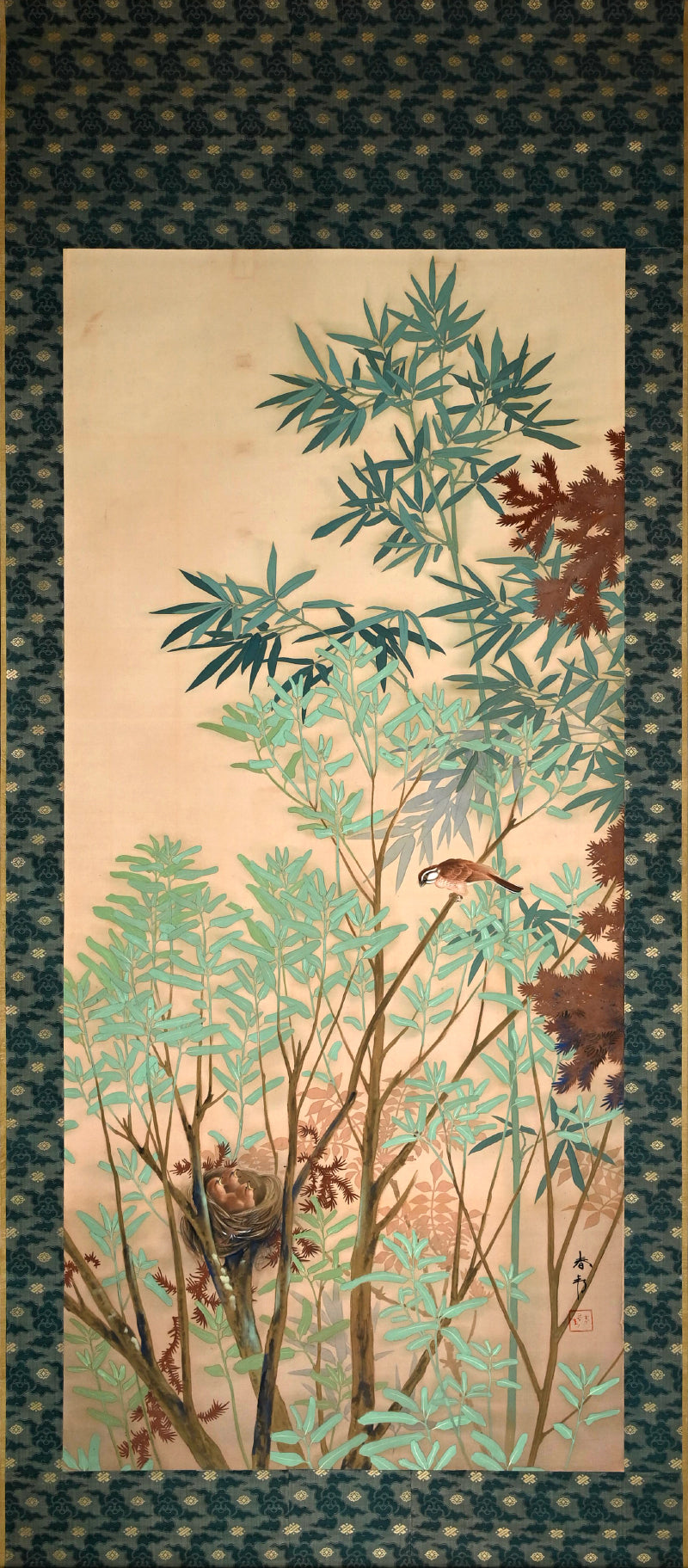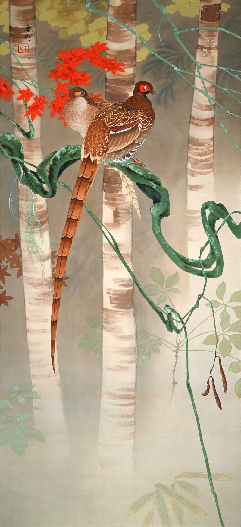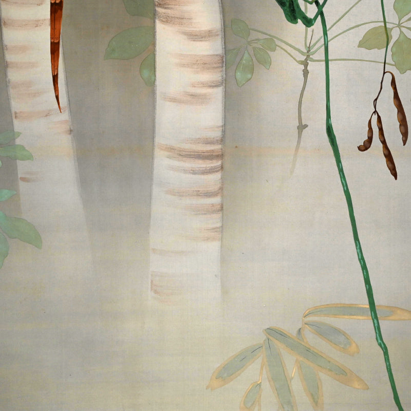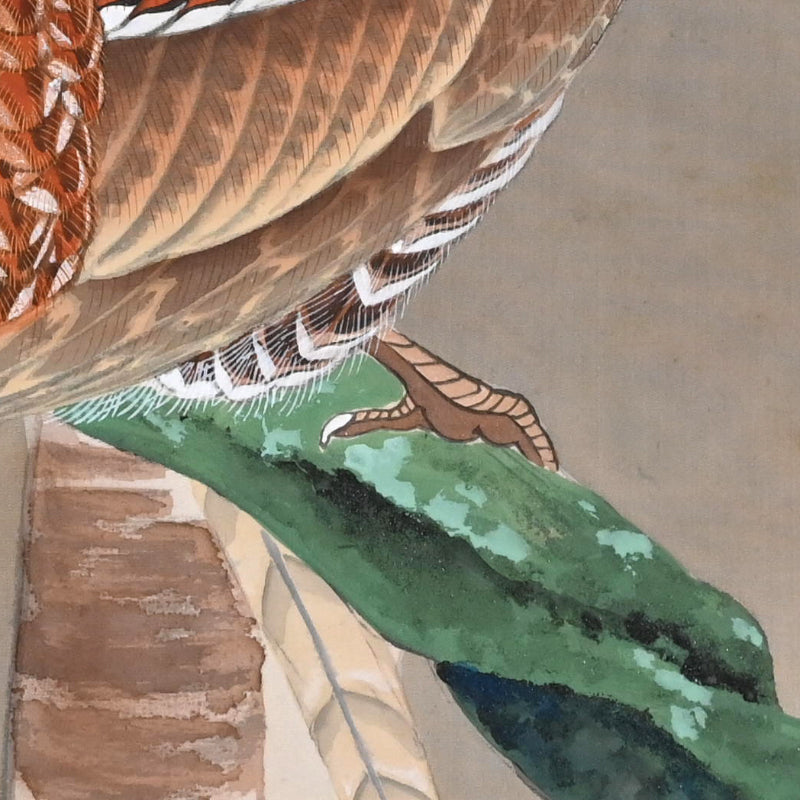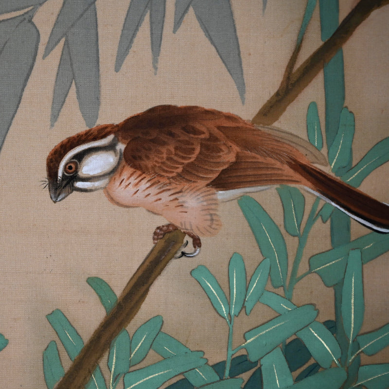 A pair of large silk paintings dating from the Taisho to early Showa periods of forest scenes by Shirayama Shunpo expressing succinctly the aesthetic dominating Japanese painitng from the later Taisho to early Showaeras (1920s). On the left, Kiji (Japaese Pheasent) rest in boughs deep in the forest, while on the right a parent watches over the nest filled with a brood of hungry beaks. Pigment on silk mounted in beautiful blue cloth with large solid ivory rollers (these will be changed if exporting). Each scroll is 87.5 x 201 cm (34-1/2 x 79 inches). There is minor toning typical of age, and one has original (pre-mounting) repairs to the silk which were likely once invisible, but have become apparent with time. It comes enclosed in a custom made kiri-wood box.