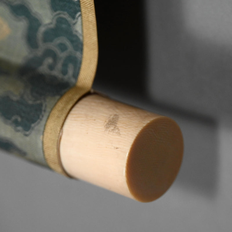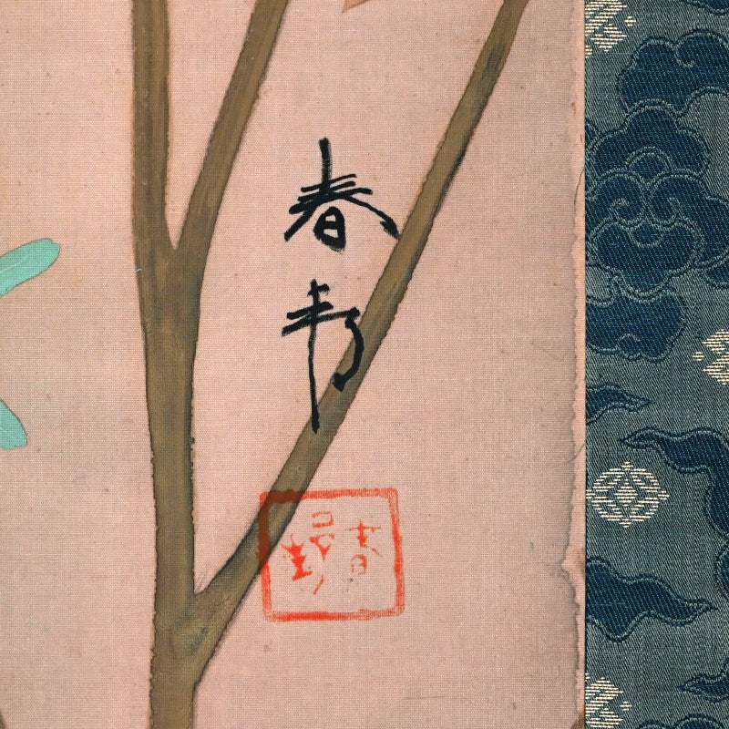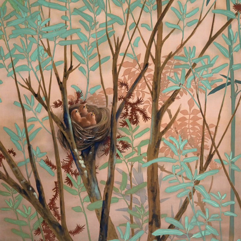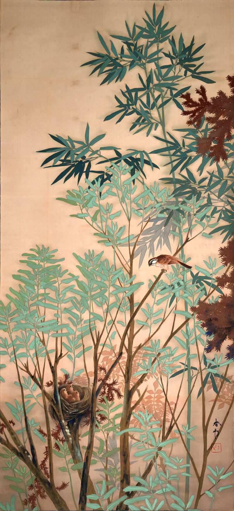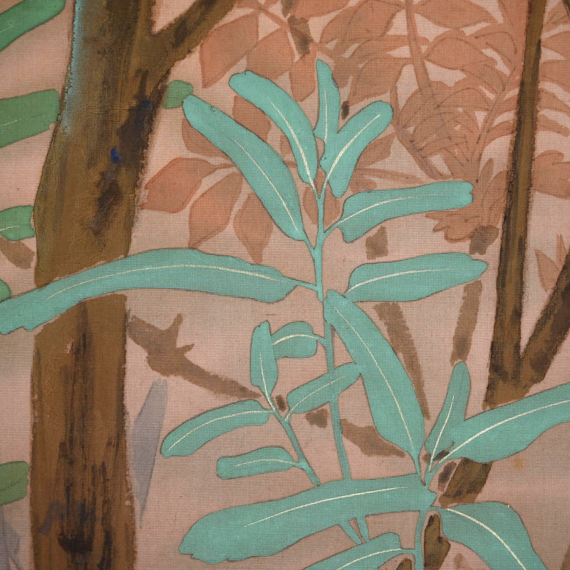 A pair of large silk paintings dating from the Taisho to early Showa periods of forest scenes by Shirayama Shunpo expressing succinctly the aesthetic dominating Japanese painitng from the later Taisho to early Showaeras (1920s). On the left, Kiji (Japaese Pheasent) rest in boughs deep in the forest, while on the right a parent watches over the nest filled with a brood of hungry beaks. Pigment on silk mounted in beautiful blue cloth with large solid ivory rollers (these will be changed if exporting). Each scroll is 87.5 x 201 cm (34-1/2 x 79 inches). There is minor toning typical of age, and one has original (pre-mounting) repairs to the silk which were likely once invisible, but have become apparent with time. It comes enclosed in a custom made kiri-wood box.
