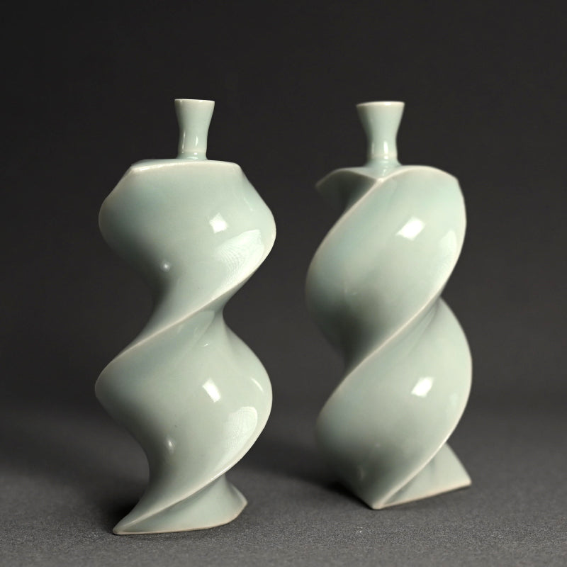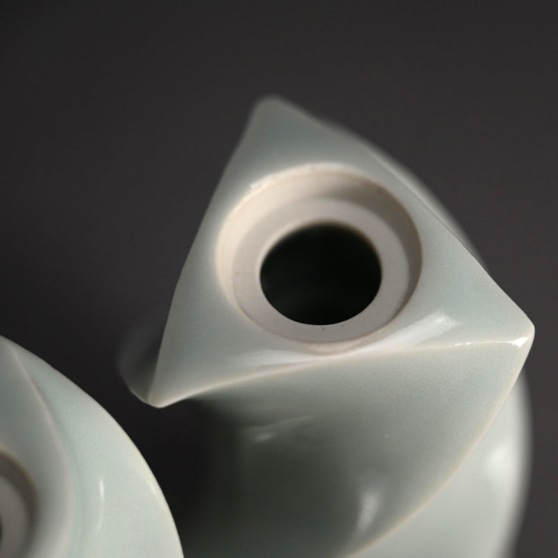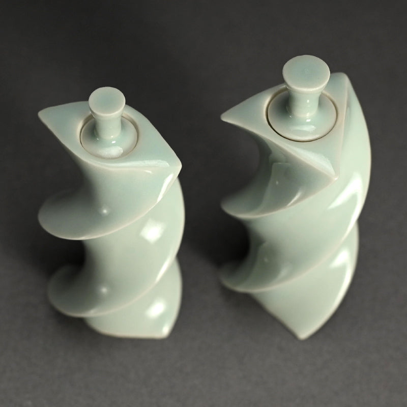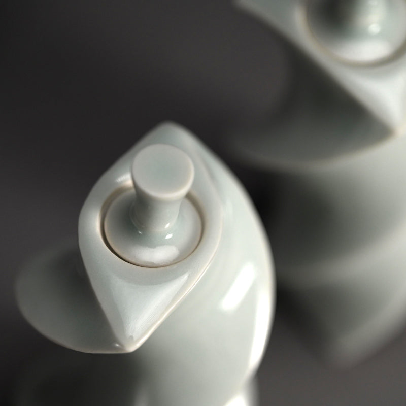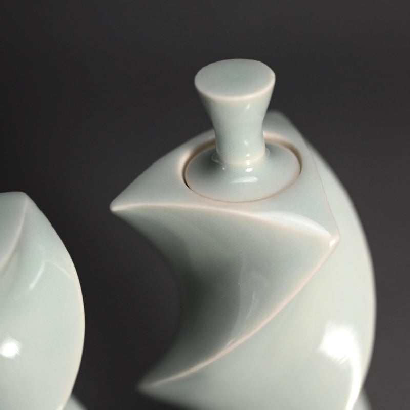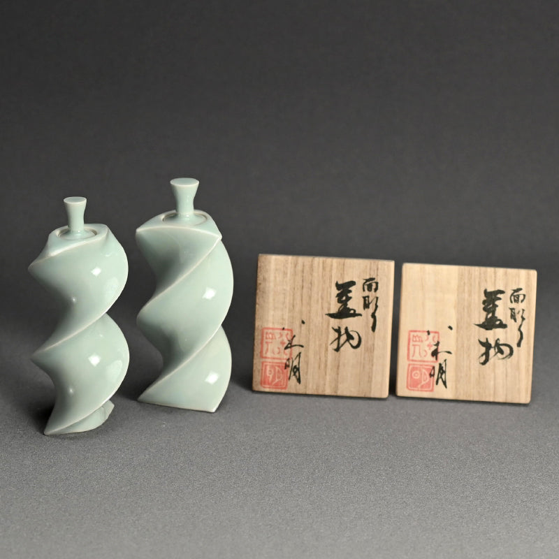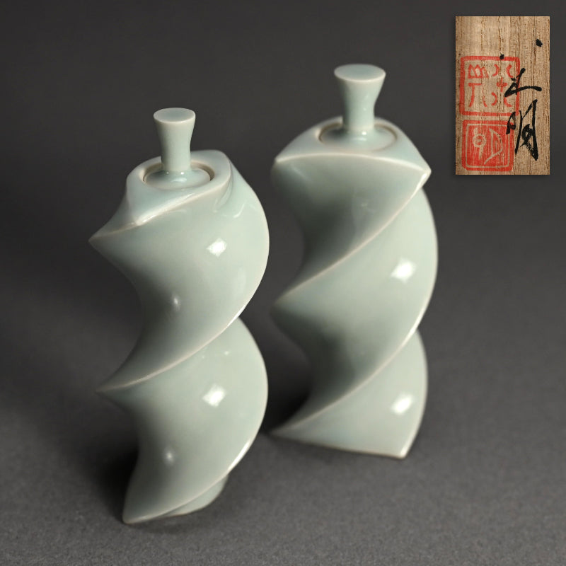 A sculptural pair of exquisite celadon lidded bottles by Yagi Akira enclosed in the original signed wooden box titled Seihakuji Mentori Futamono. Each is 12 cm (5 inches) tall and in perfect condition.
