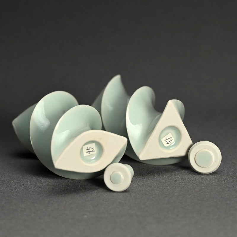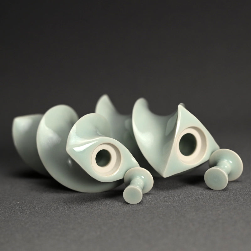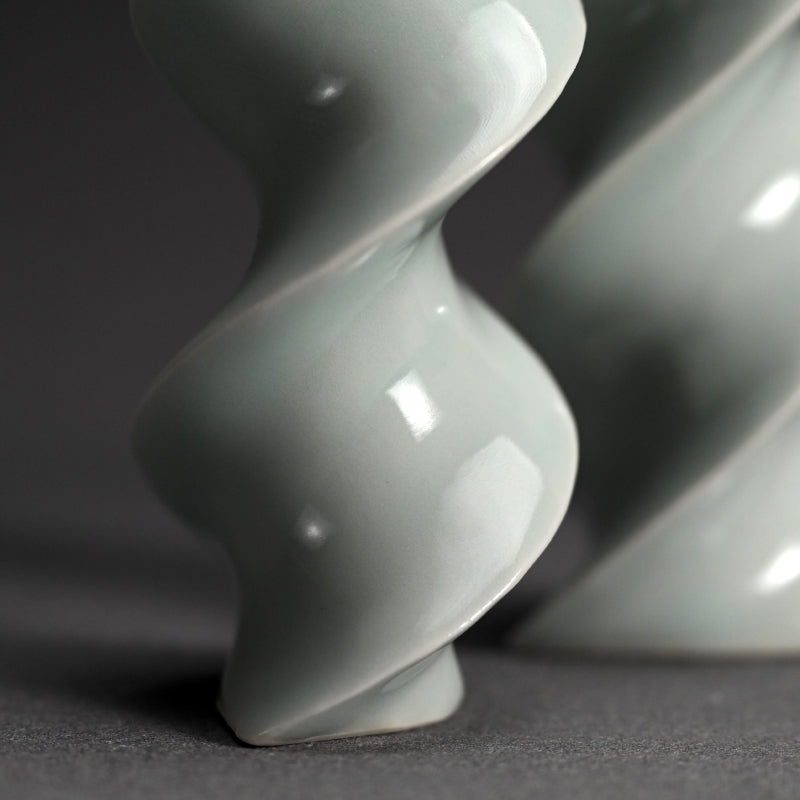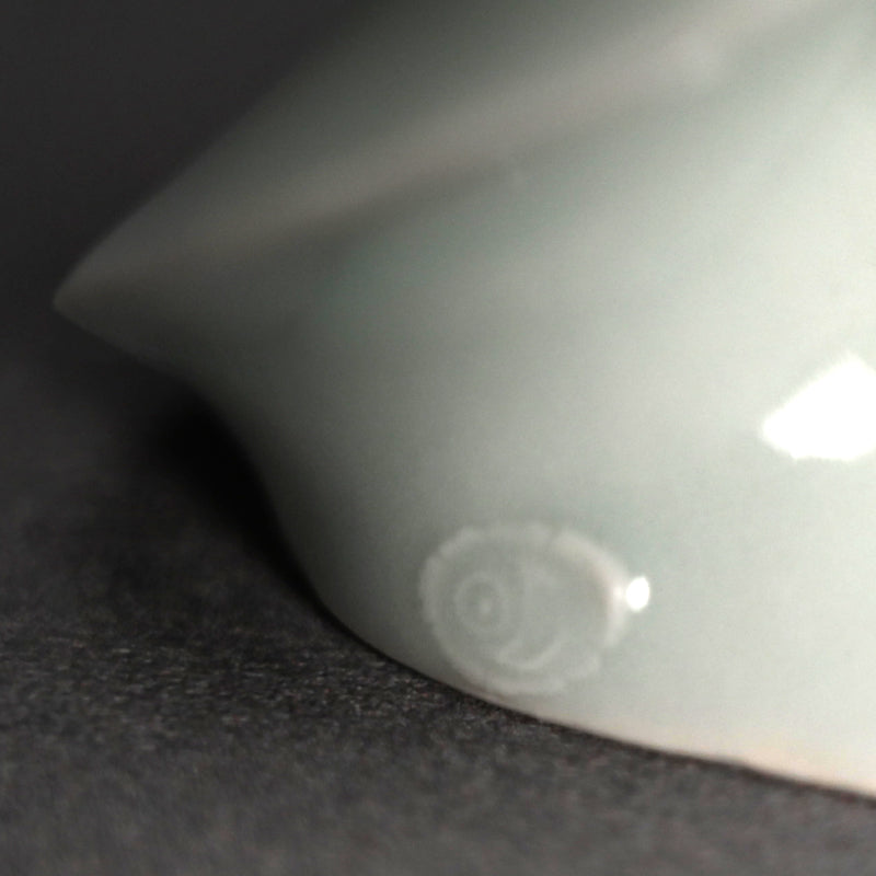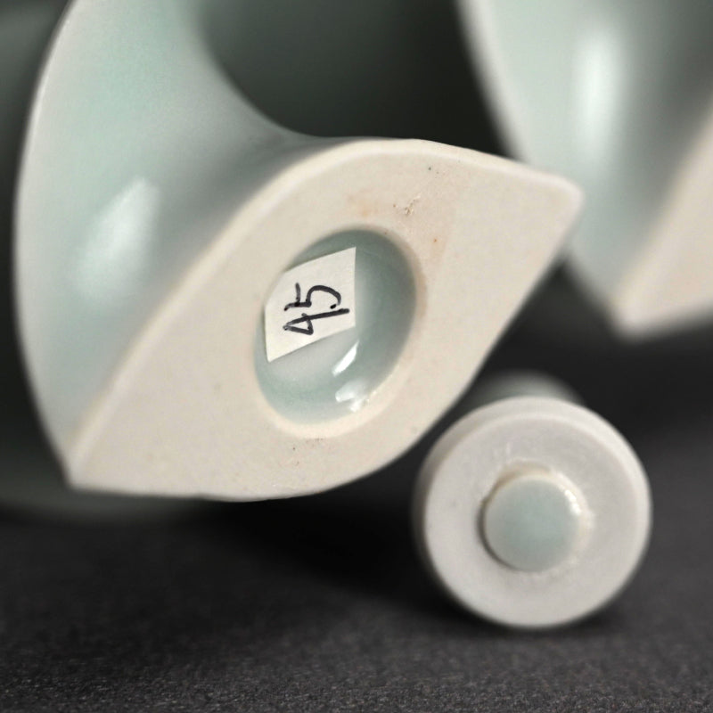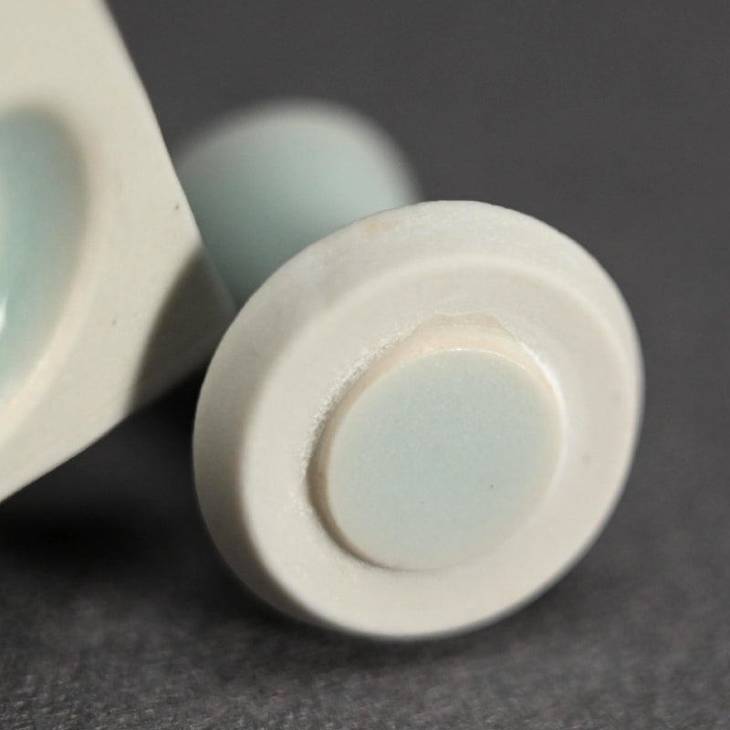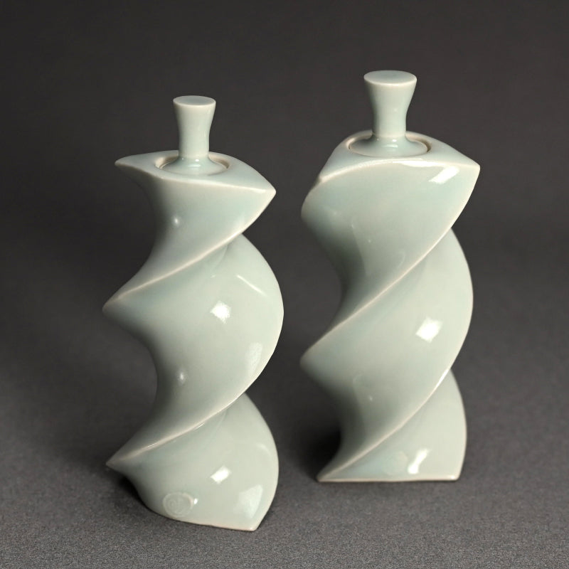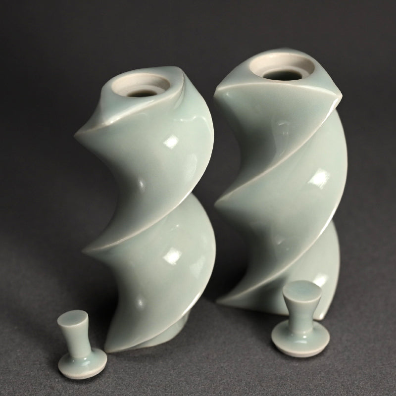 A sculptural pair of exquisite celadon lidded bottles by Yagi Akira enclosed in the original signed wooden box titled Seihakuji Mentori Futamono. Each is 12 cm (5 inches) tall and in perfect condition.