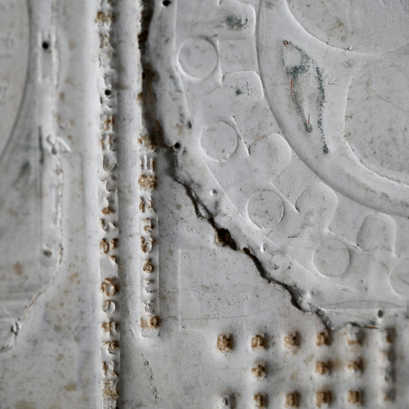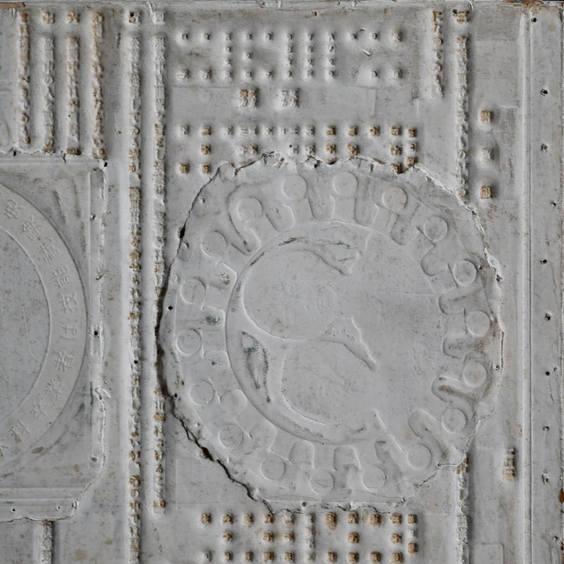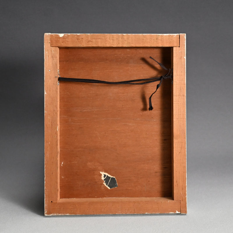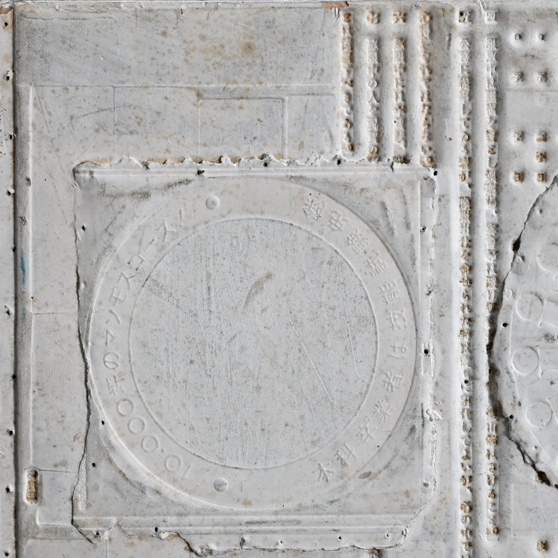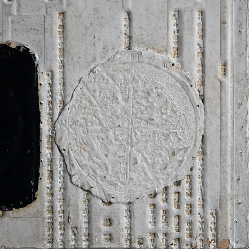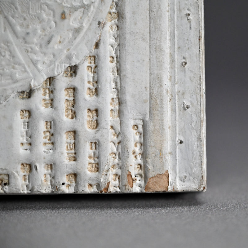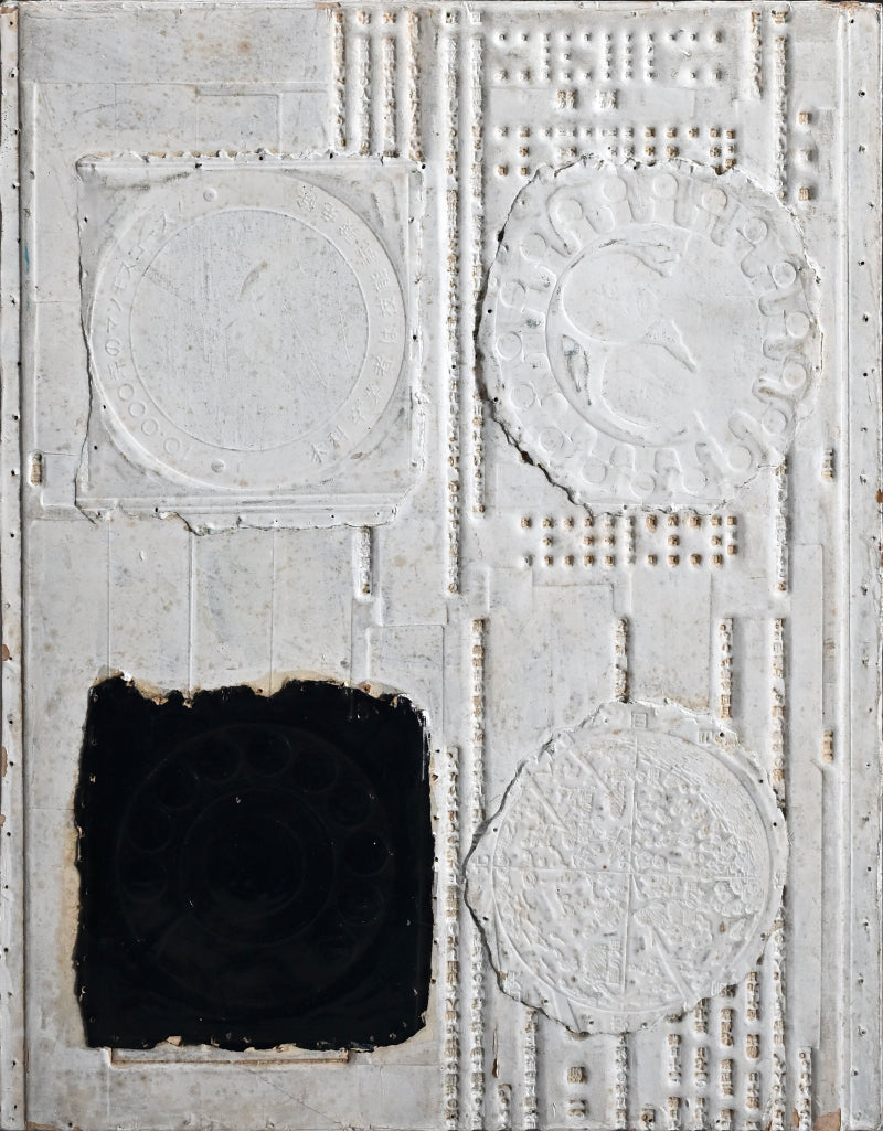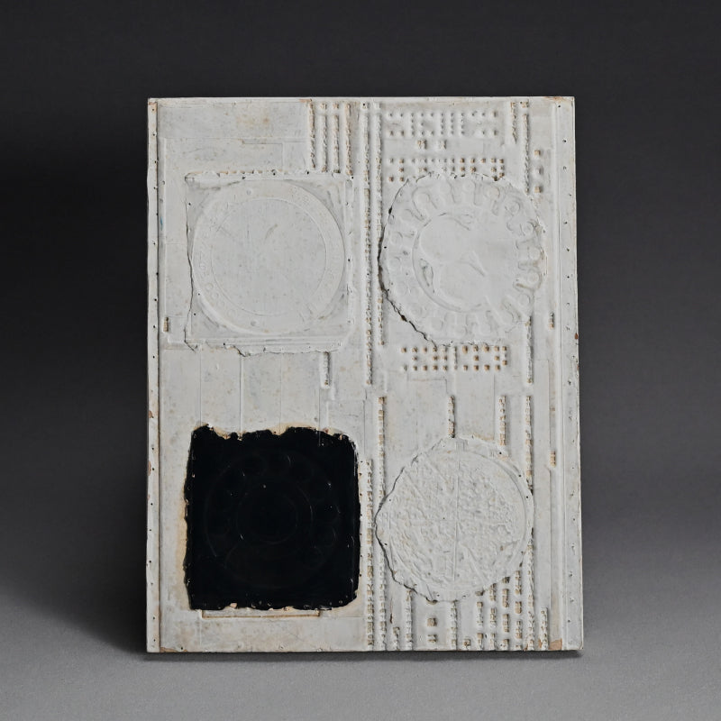 An unusual collage in stark black and white contrast made up of paper printing flongs depicting circular motifs over deeply impressed kanji charactersby Nomura Ko. A flong is a type of paper mold impressed with the newsprint used in the pre-digital printing process which would have been discarded after production. Mounted on a wooden panel, it is 33.3 x 26 x 3.5 cm (13-1/2 x 10-1/2 x 1-1/4 inches). There are chips to the brittle edges of the black, and wear about the unprotected edges of the work.