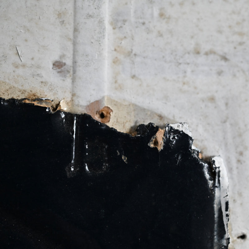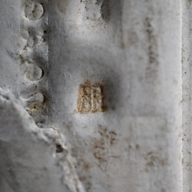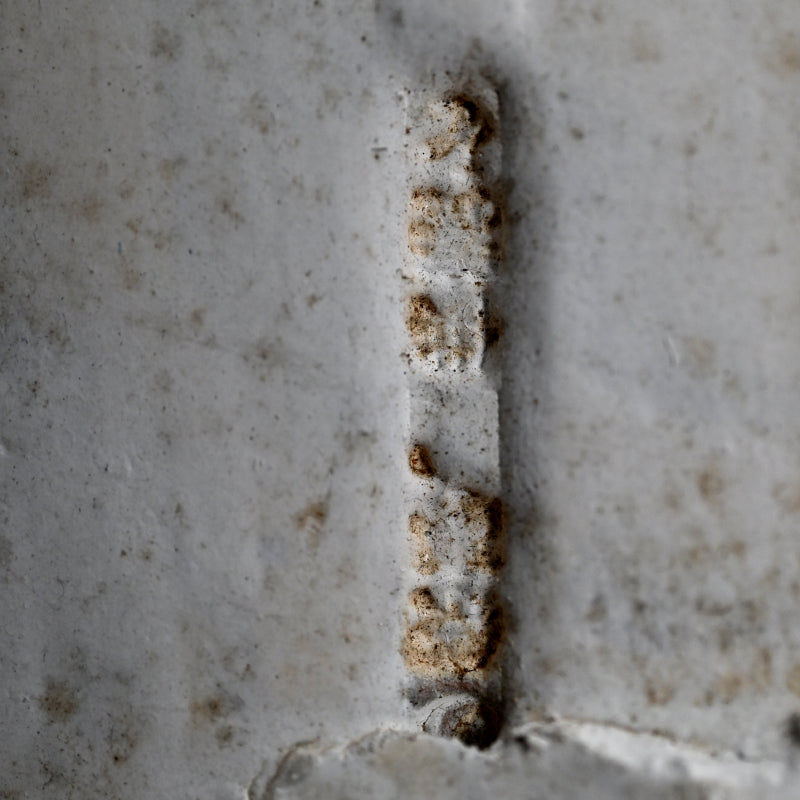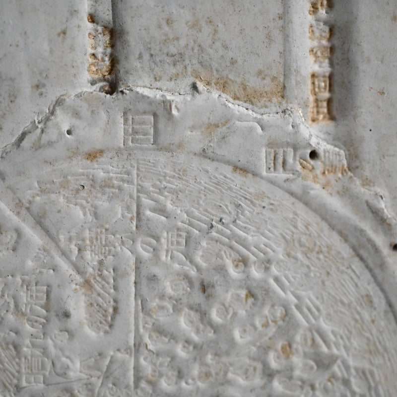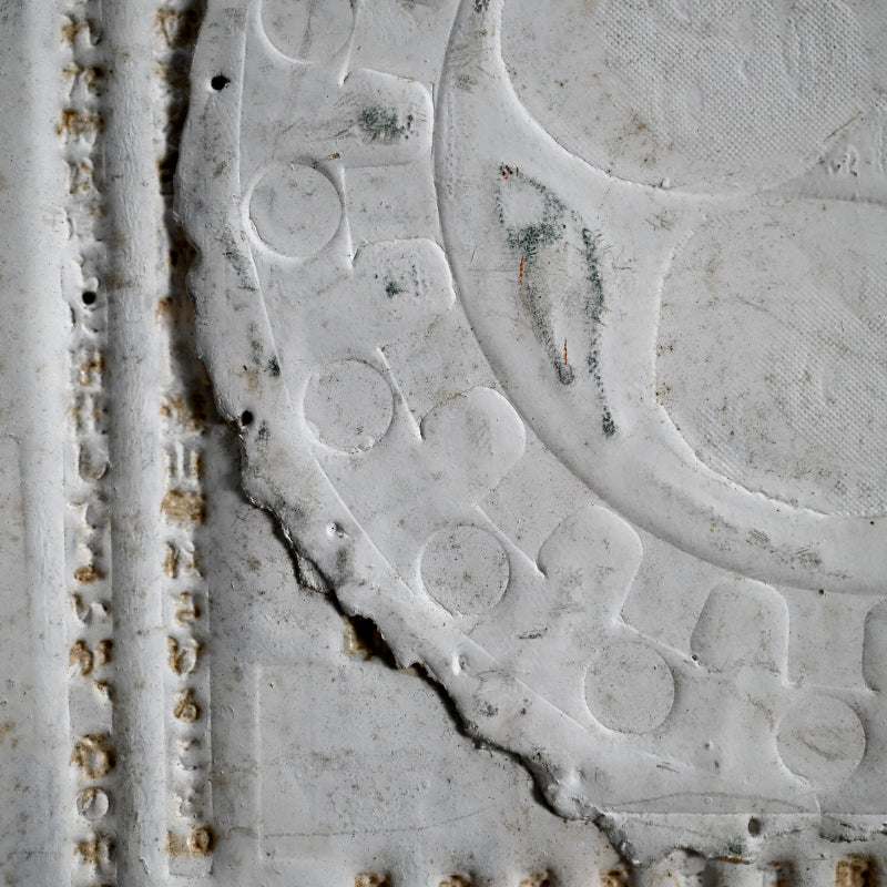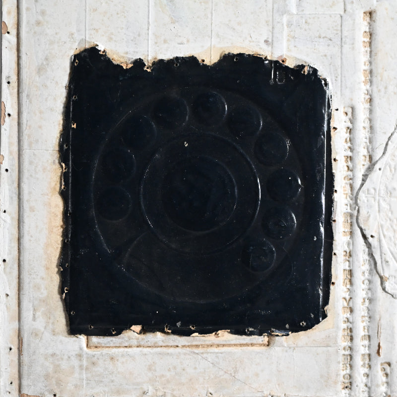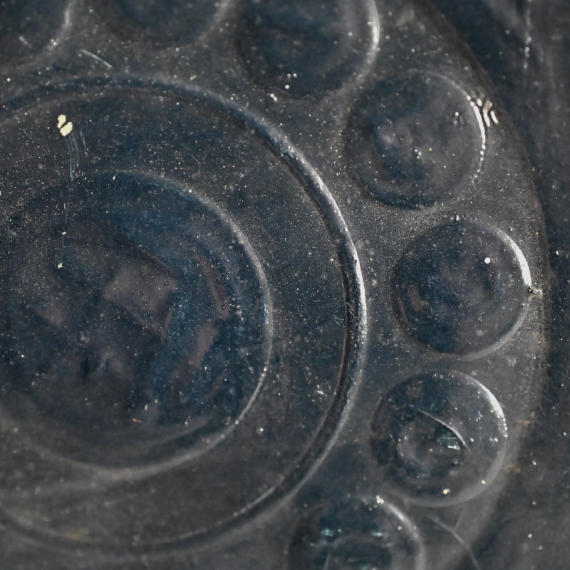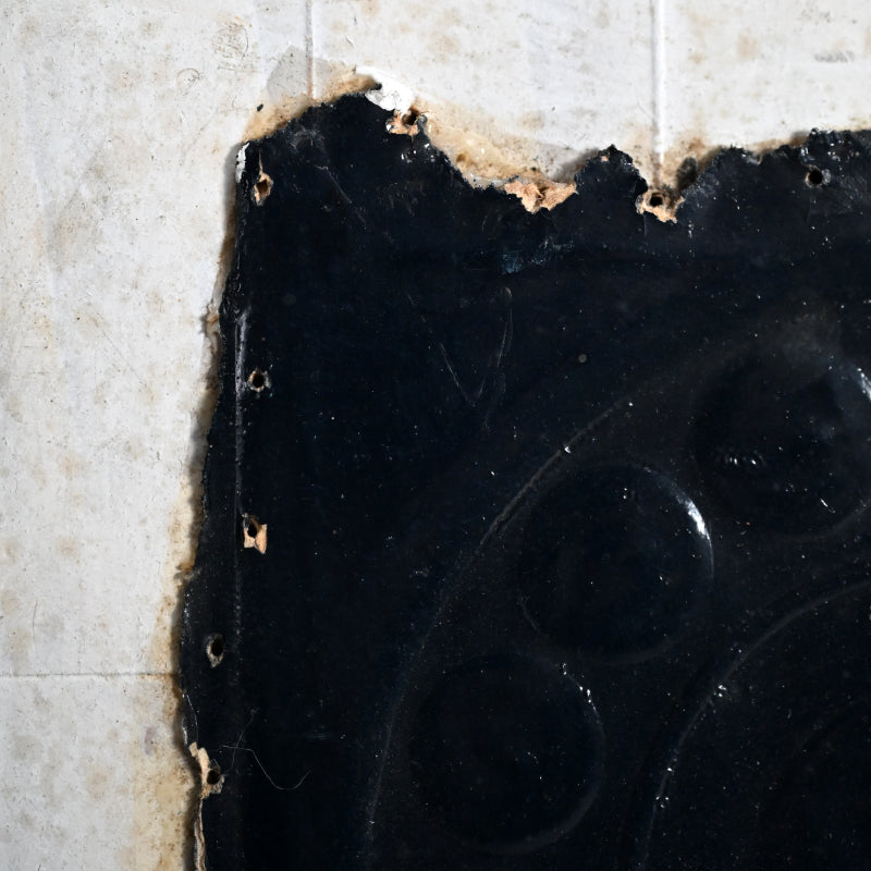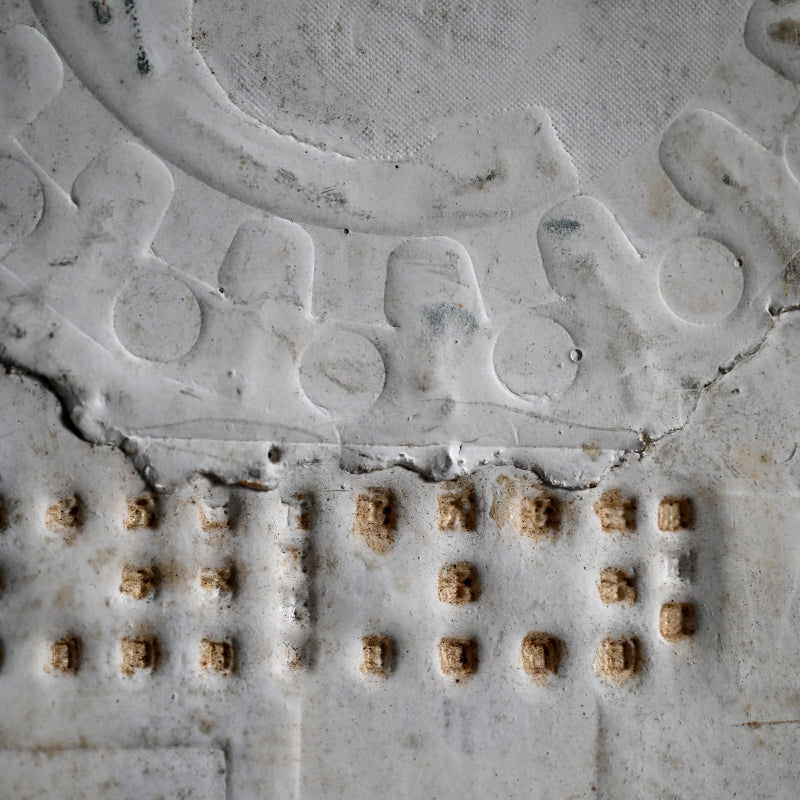 An unusual collage in stark black and white contrast made up of paper printing flongs depicting circular motifs over deeply impressed kanji charactersby Nomura Ko. A flong is a type of paper mold impressed with the newsprint used in the pre-digital printing process which would have been discarded after production. Mounted on a wooden panel, it is 33.3 x 26 x 3.5 cm (13-1/2 x 10-1/2 x 1-1/4 inches). There are chips to the brittle edges of the black, and wear about the unprotected edges of the work.