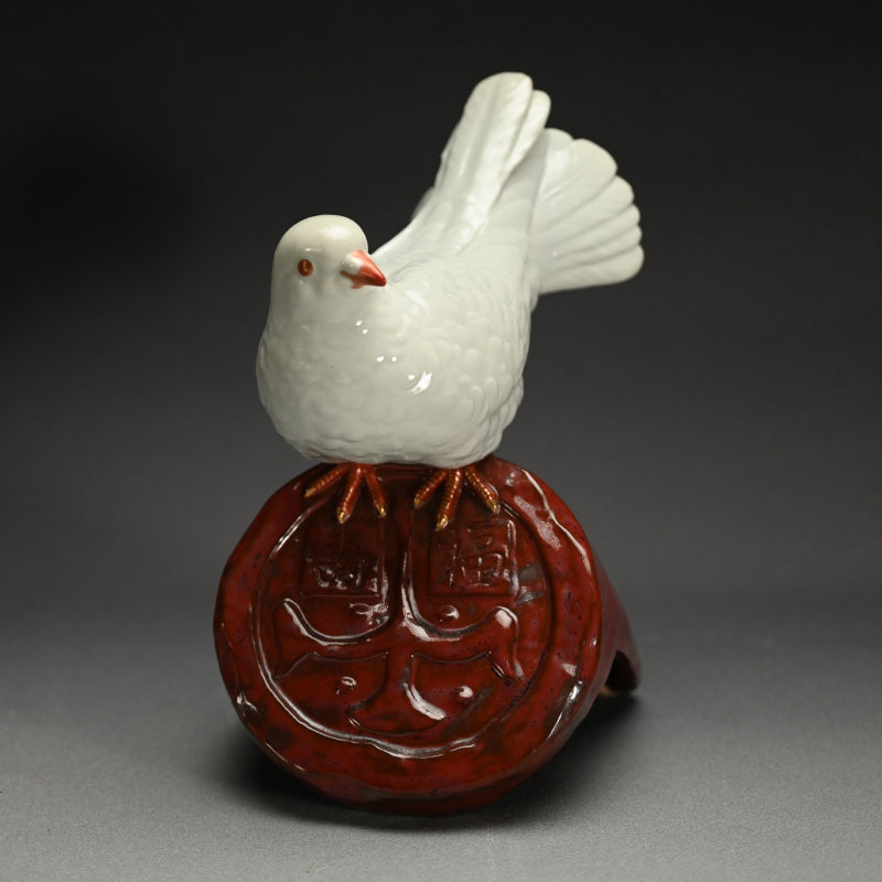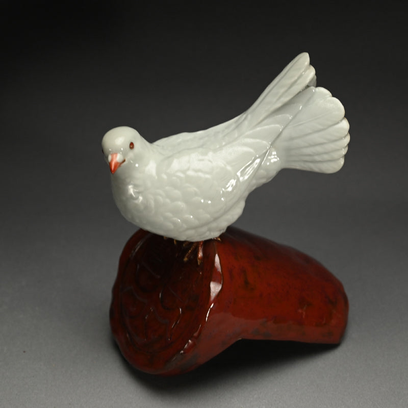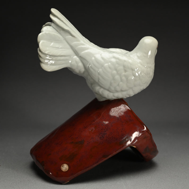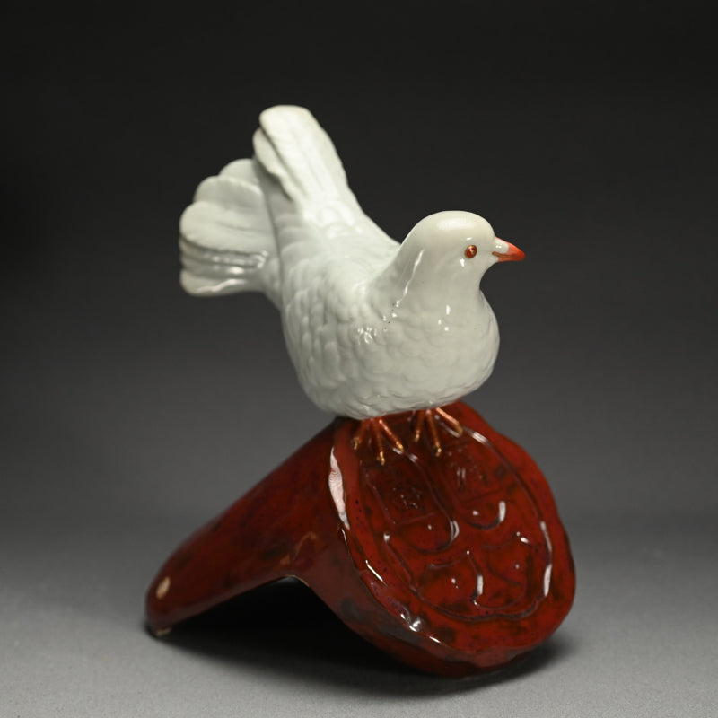 A detailed image of a pigeon perched on a fallen roof tile by the elusive Nakamura Shuto enclosed in the original signed wooden box titled Ko-gawara Ni Hato Okimono. It is 22 x 16 x 27 cm (9 x 6-1/2 x 11 inches) and is in excellent condition.