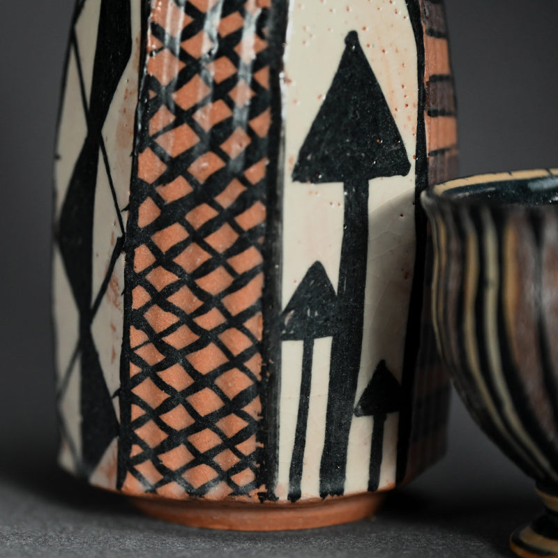 Capricious designs in iron on white between geometric grids decorate this Tokkuri accompanied by a colorful earthy toned guinomi by Japan based potter Richard Milgrim, each enclosed in the original signed wooden box titled Aka-Oribe Sake Cup and Aka Oribe Tokkuri respectively. One simply can be nothing but lighthearted when drinking from this set. The Tokkuri is 15 cm (6 inches) tall, the cup 6.5 cm (2-1/2 inches) diameter, new from the artist in perfect condition.