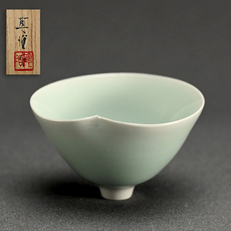 An exquisite inverted cone-shaped celadon sake cup supported by a tiny ring foot by Fukami Sueharu enclosed in the original signed wooden box titled Seihakuji Guinomi. It is 7.5 cm (3 inches), 4.5 cm (just less than 2 inches) tall and in perfect condition.
