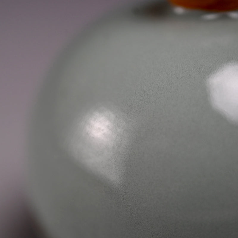 A Rooster stands proudly in slight relief, his tail plumage draping down like a cape, on the lid of this celadon incense container by Suwa Sozan I enclosed in the original signed wooden box bearing the Teishitsu Gigei-in stamp. This would be the last Zodiac animal created by the artist, as he passed away the following year. It is 6 cm (2-1/2 inches) diameter and in excellent condition. An example of this piece is published in the rare 1971 book Suwa Sozan Sakuhin Shu page 44.