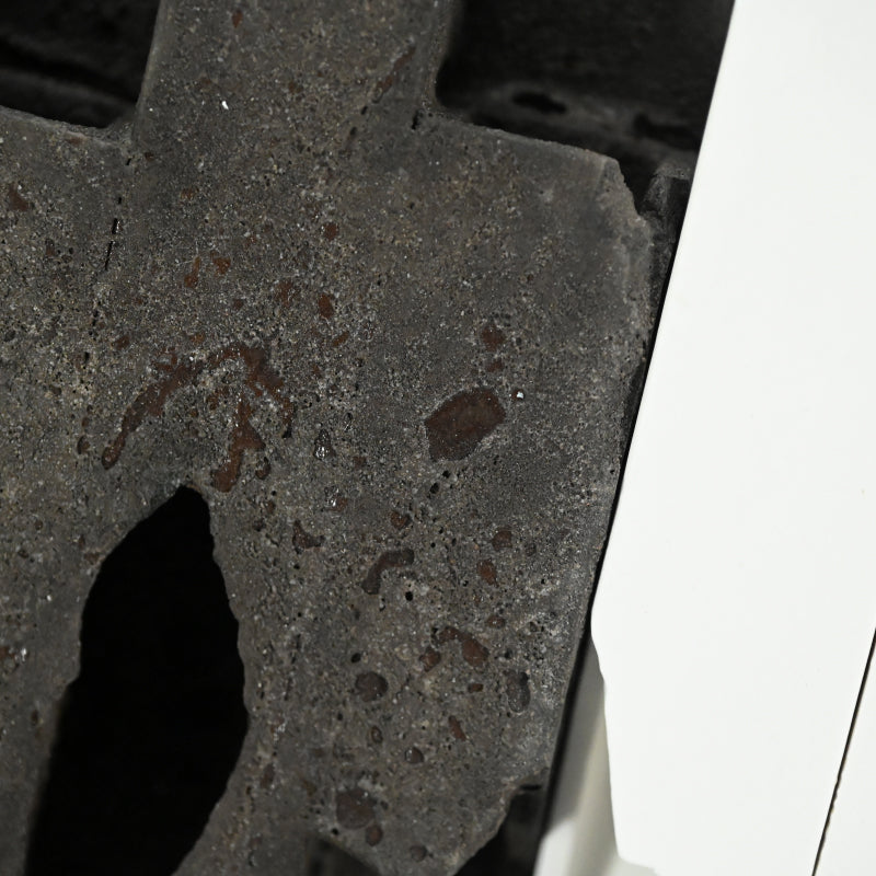 A huge architectural sculpture of smooth sheer porcelain shot through with a structure in textured black by Takeuchi Kozo accompanied by a signed wooden placard titled “Modern Remains, Ground”, dated 2022. It is 75 x 30 x 45 cm (29-1/2 x 12 x 18 inches) and is in excellent condition, directly from the artist.