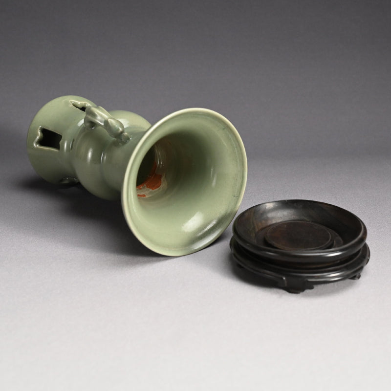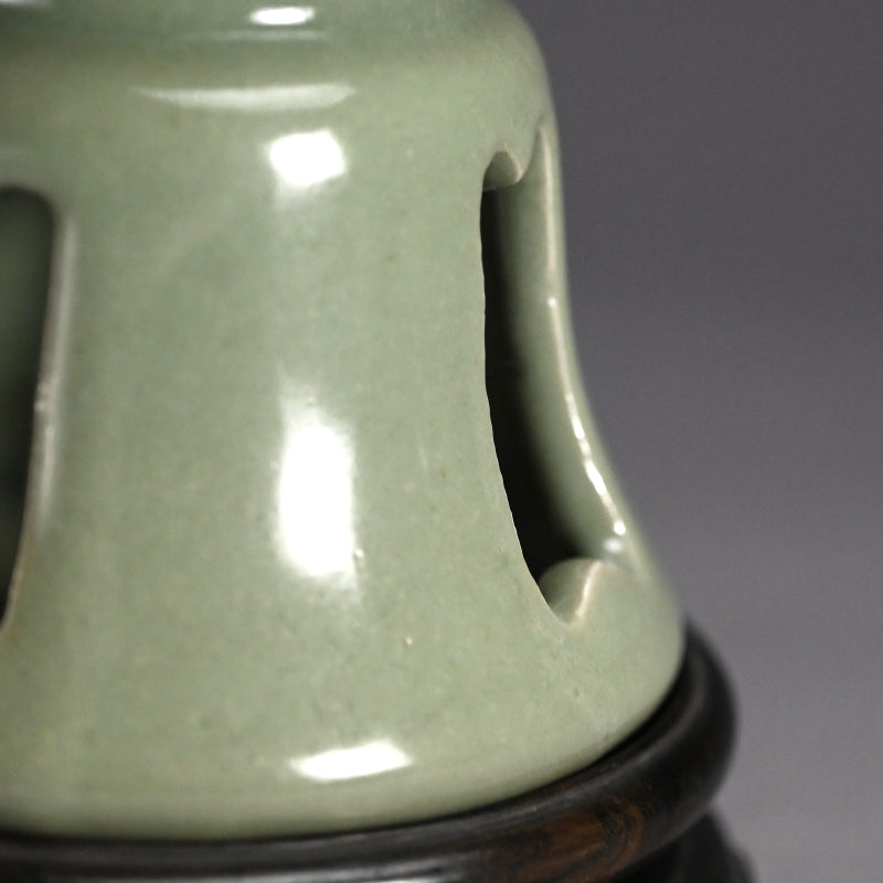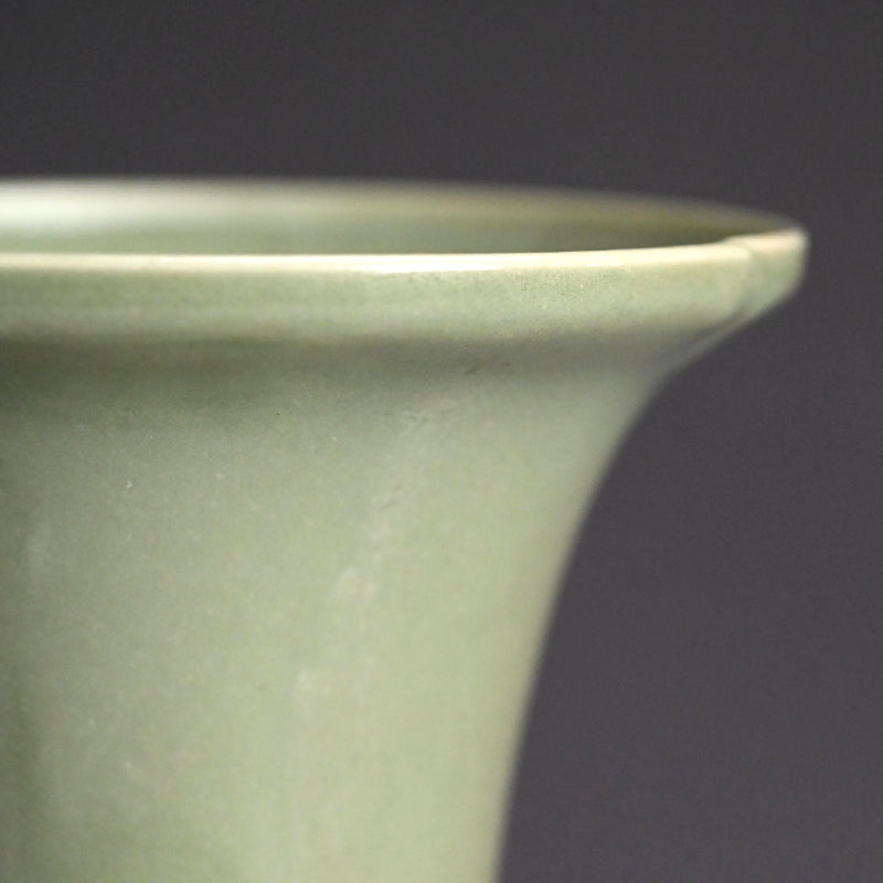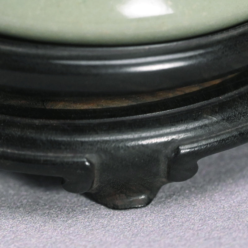 An exquisite early Sanda Celadon Vase in classical form with rosewood stand wrapped in a beautiful silk pouch and enclosed in a fie Kiri-wood storage box published in the book: Ko-sanda Seiji Bi to Ko (2016). The vase is 30 cm (12 inches) tall, 15 cm (6 inches) diameter excluding the rosewood stand, and is in excellent condition, enclosed in a beautiful age-mellowed Kiri-wood box.